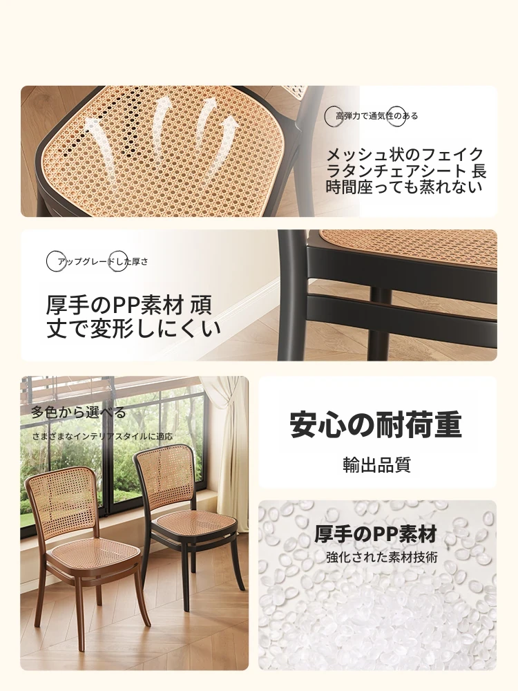 おしゃれな中古風ラタンチェア|家庭用・ダイニングに最適!スタッキング可能なプラスチック背もたれ付きで、軽やかな高級感を演出。ティーテーブルにもぴったりな一品です。