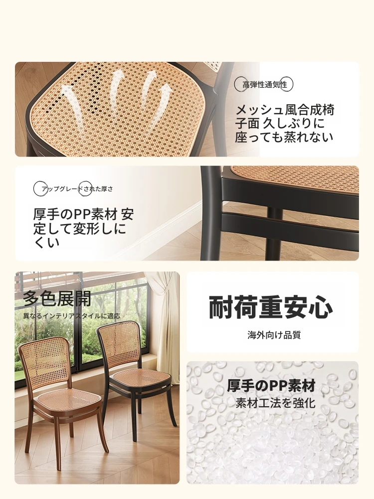 洗練されたデザインの藤編み椅子!中華風のスタイルで、軽量かつスタッキング可能。高級感あふれるプラスチック製の背もたれ付きダイニングチェア。家庭用に最適な、食卓を彩るアイテムです!