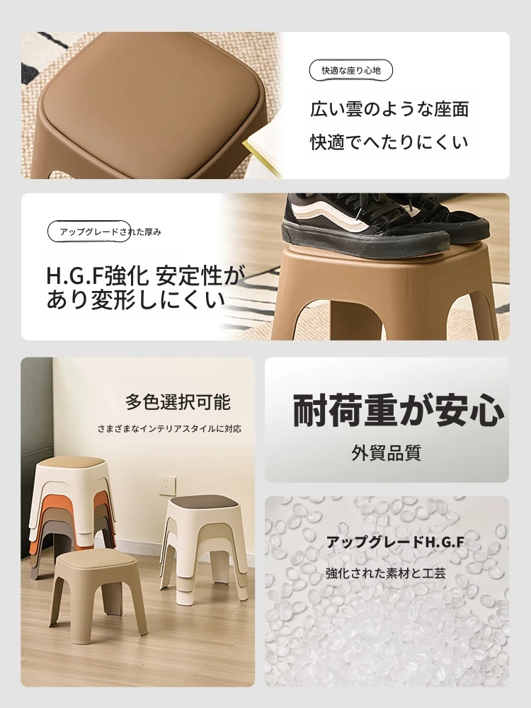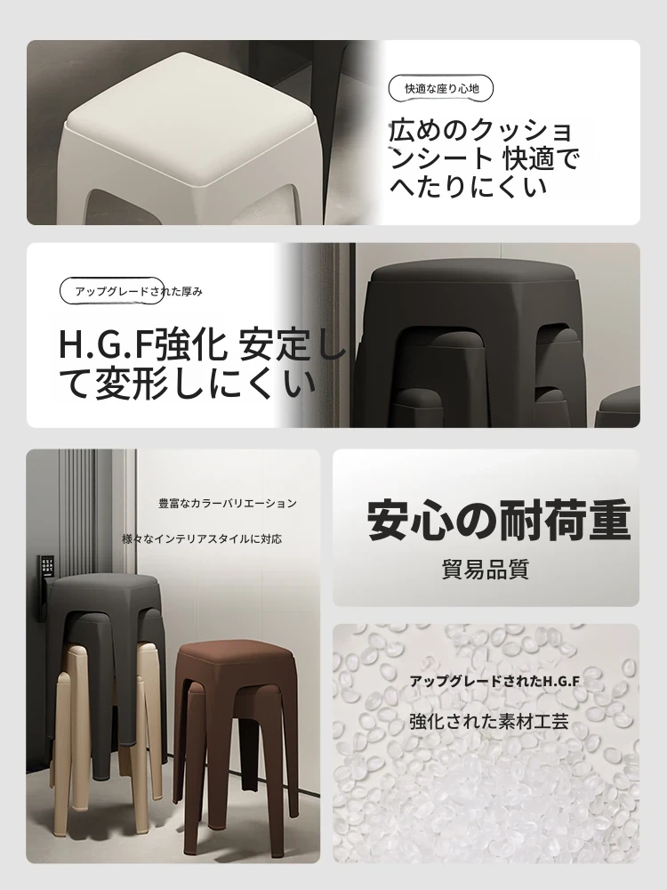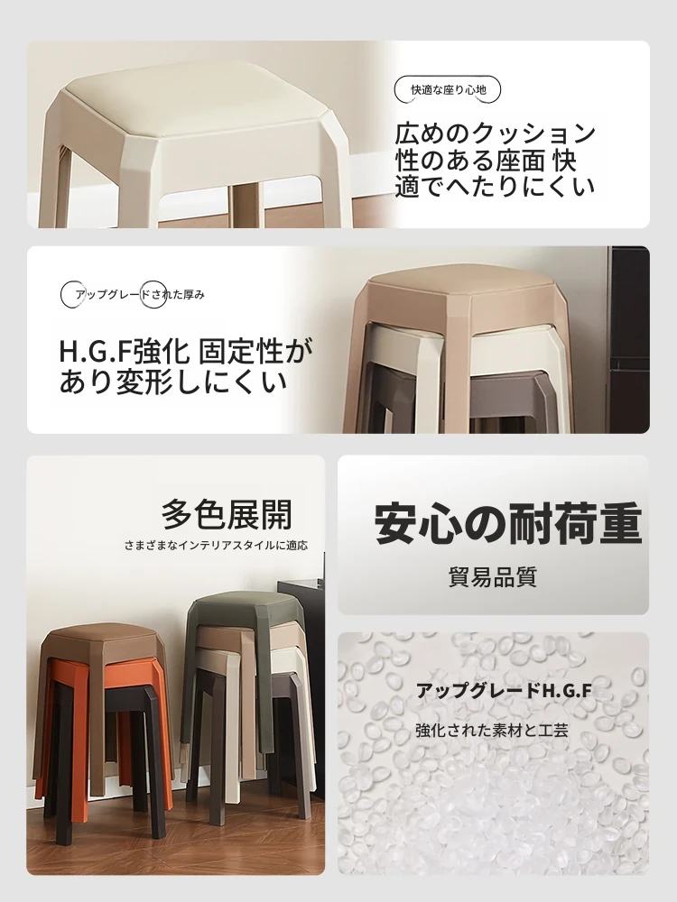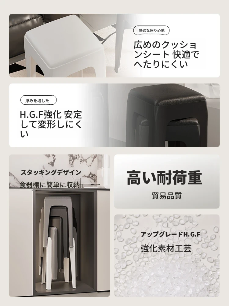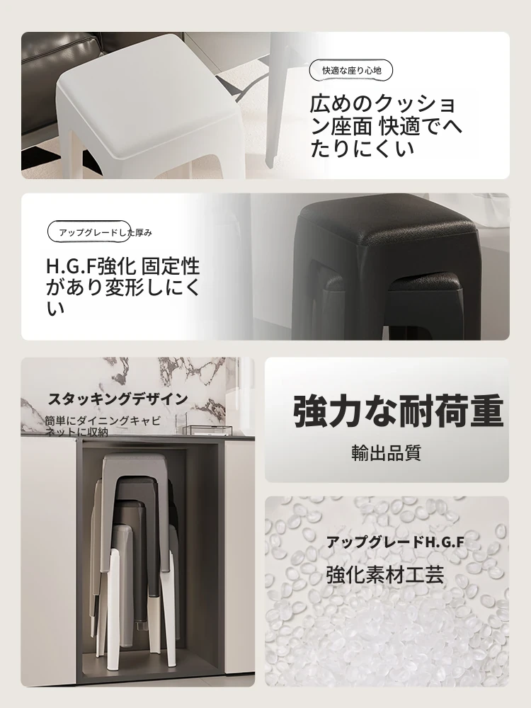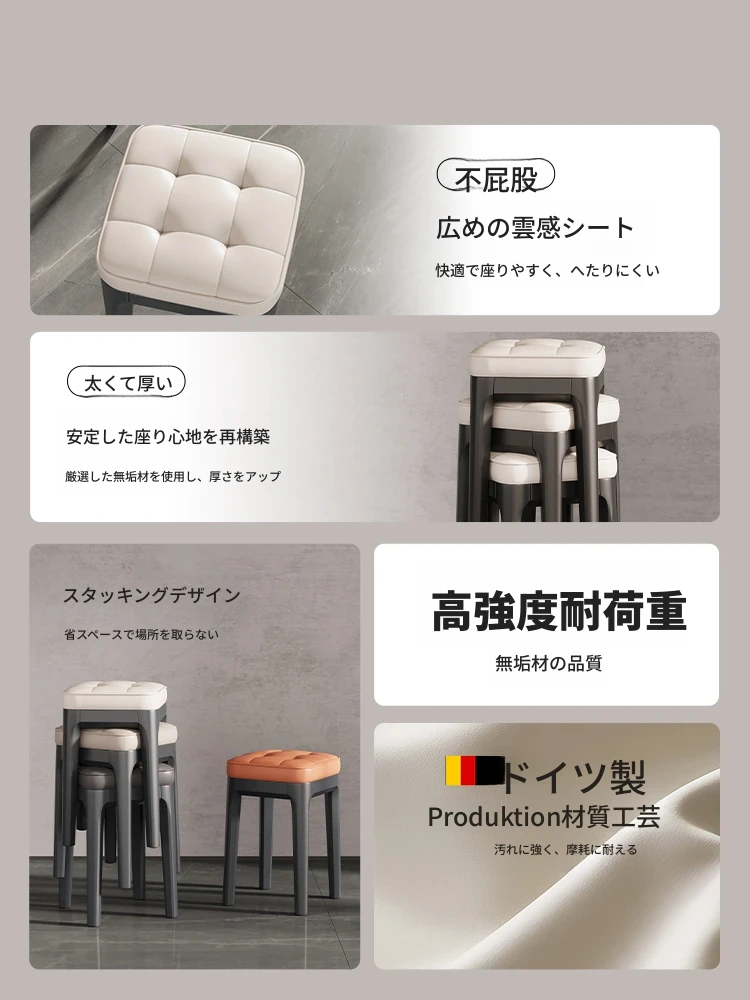 厚手プラスチック製、スタッキング可能なソフトパッド付きスクエアスツール!モダンでシンプルなデザイン、リビングやダイニングに最適。快適さと実用性を兼ね備えた高座椅子で、家族や友人との食事をより楽しいものにします!