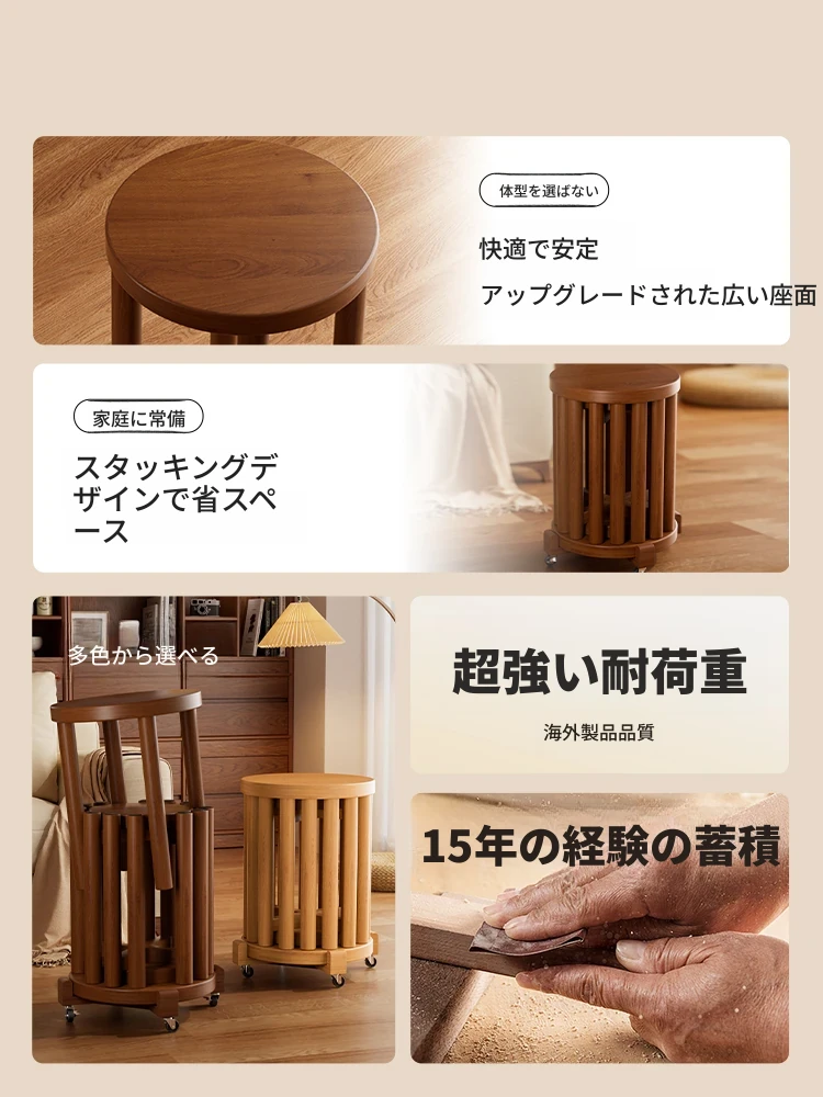 高級感漂う無垢材のスタッキングスツール - 家庭用、空間を有効活用できるおしゃれなサブベンチ。来客時にもぴったり!収納もラクラク。