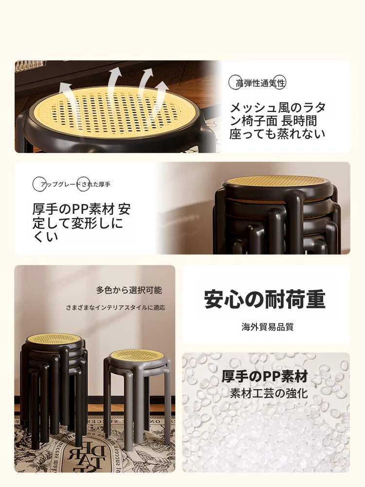 スタイリッシュな重ねられるプラスチックスツール - 家庭用に最適!頑丈で耐久性抜群、リビングやゲスト用に便利。高級感漂うソフトパッド付きで、快適さとデザインを両立!