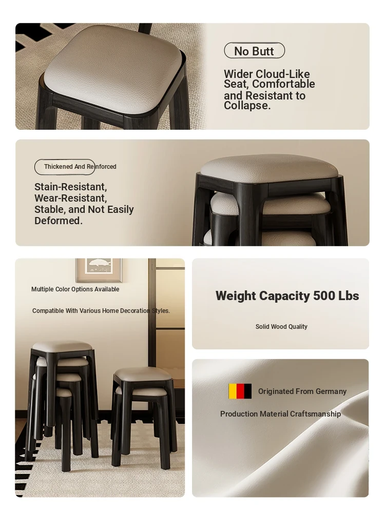 Modern Solid Wood Stool – Versatile Dining and Living Room Bench, Stackable, Upholstered Square and Round Options, Perfect for Home Use