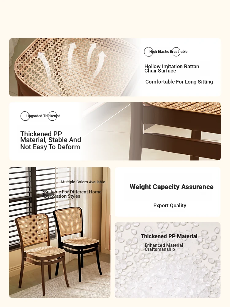 Rattan Dining Chair - Vintage-Inspired, Lightweight Luxury for Home & Airbnb. Elegant Plastic Backrest Tea Chair, Perfect for Dining Tables.