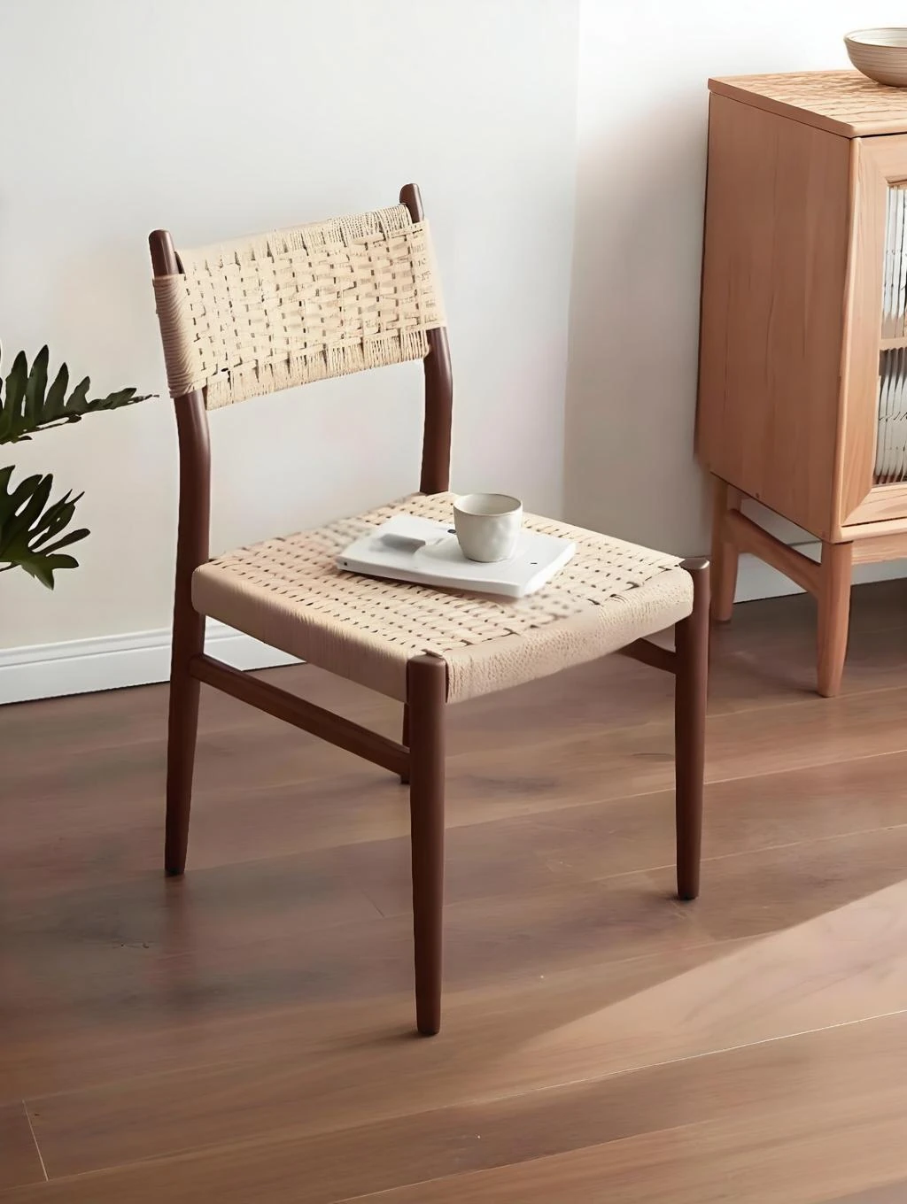 2025 New Nordic Minimalist Solid Wood Dining Chair with Woven Backrest - Vintage Tea Chair for Home, Embracing Wabi-Sabi Aesthetics for Your Dining Experience