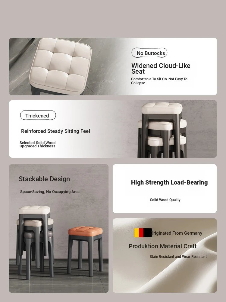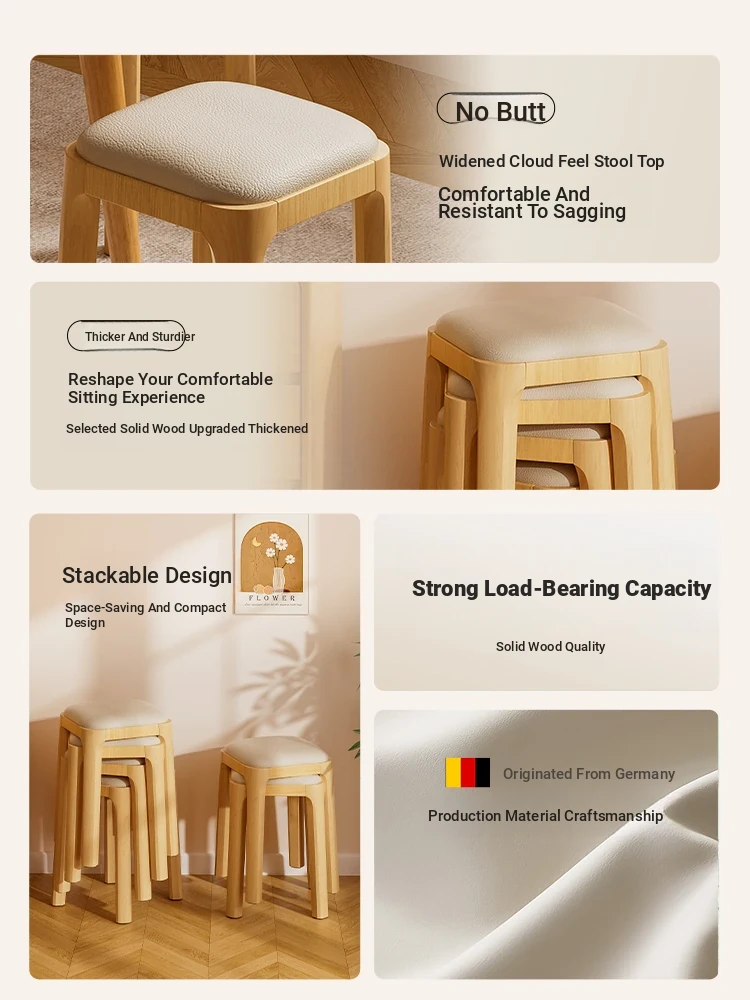 Modern Stackable Solid Wood Stool for Home Use - 2025 New Arrival, Minimalist Design, Soft Cushion Square Makeup Stool, Perfect for Dining and Extra Seating