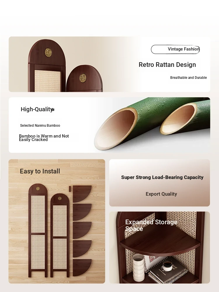 Elegant Corner Shelf Unit - Stylish 90-Degree Corner Cabinet with Rattan Weaving for Books and Decor, Perfect for Small Spaces and Wall Placement