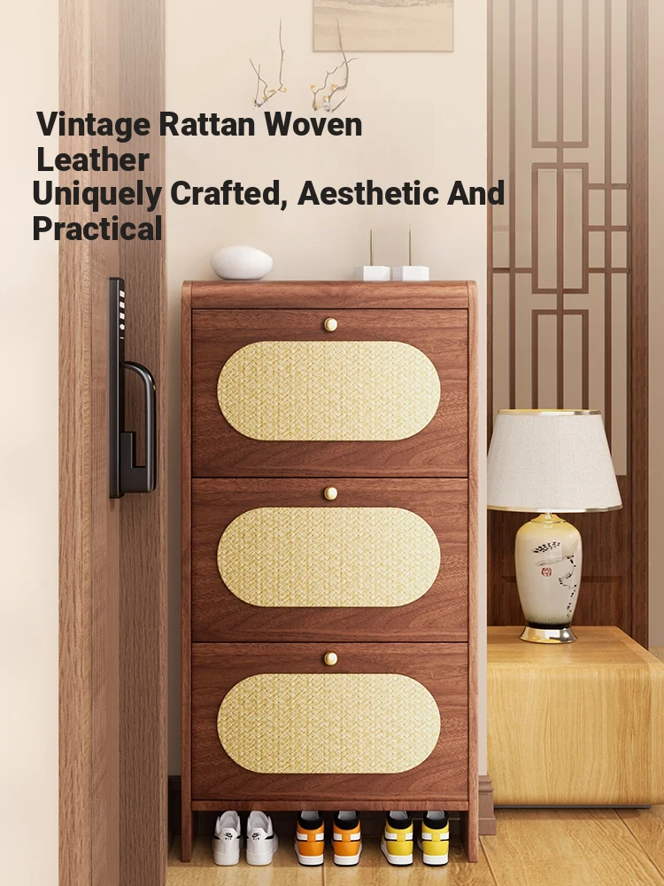 Slim Folding Shoe Cabinet for Home - Space-Saving Narrow Entryway Storage Solution with Rattan Design, Perfect for Small Apartments and Vintage Aesthetic. Ideal for Organizing Your Entryway!