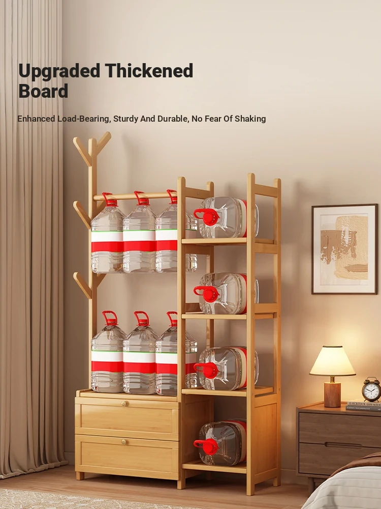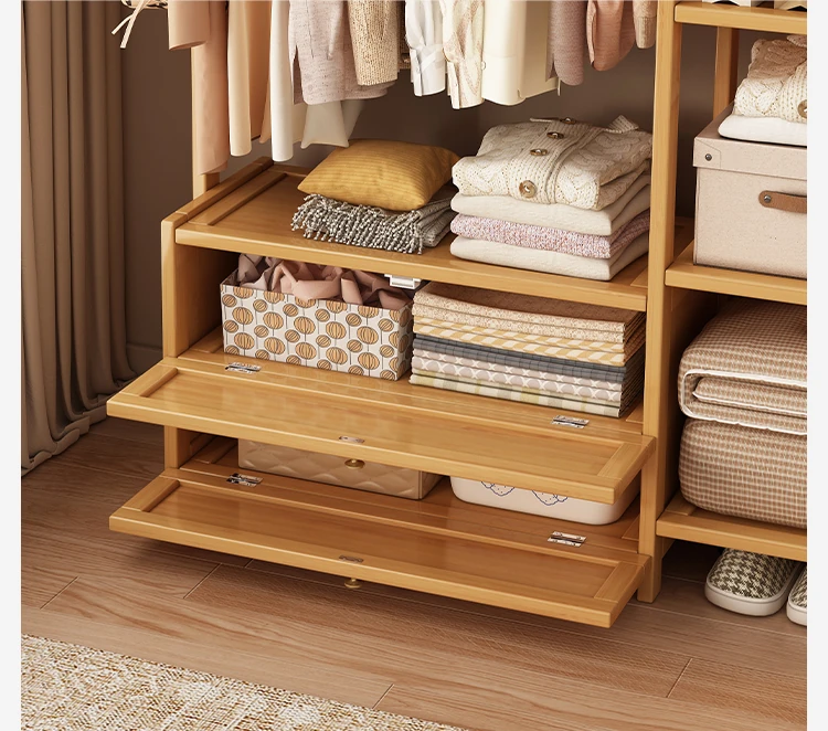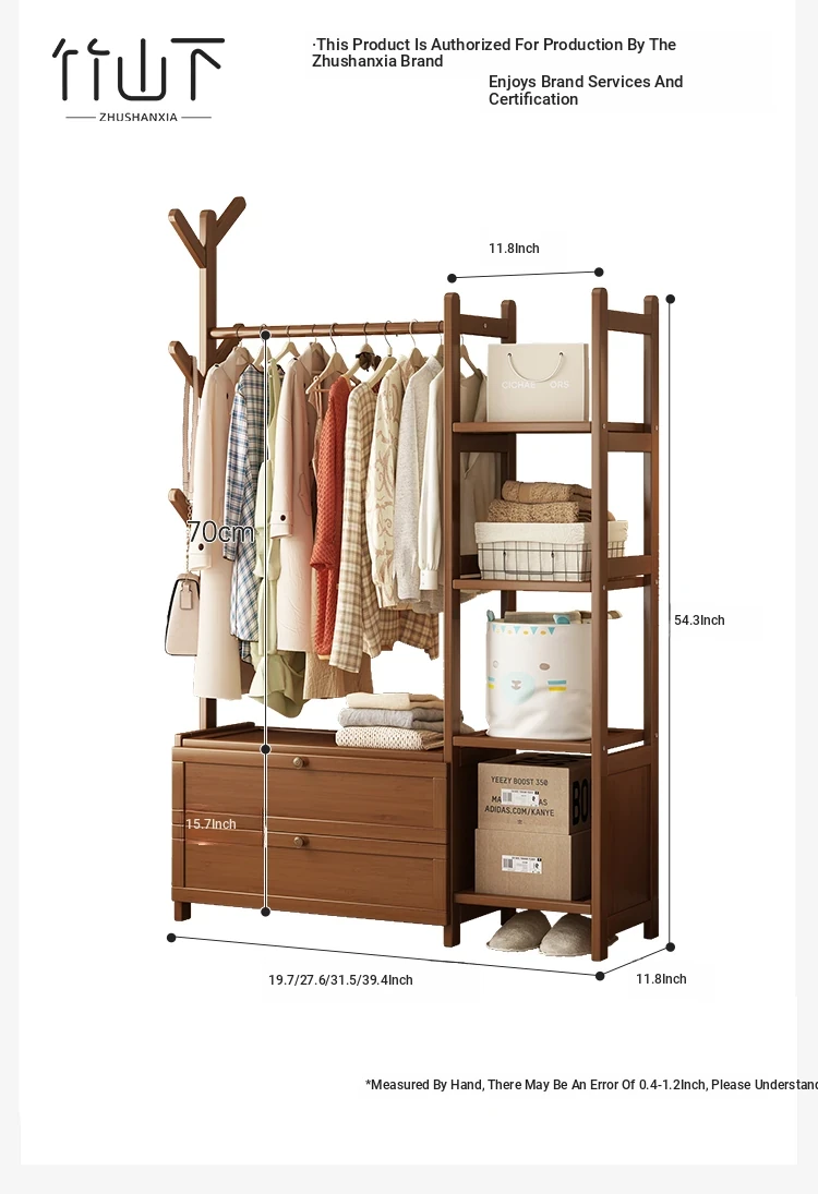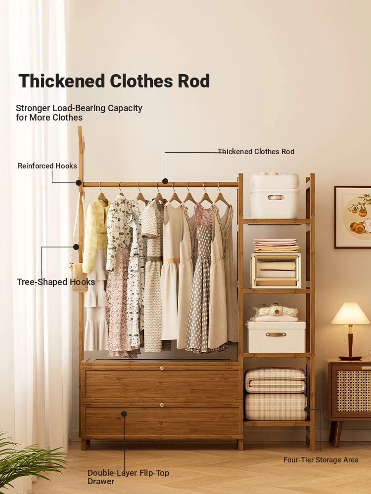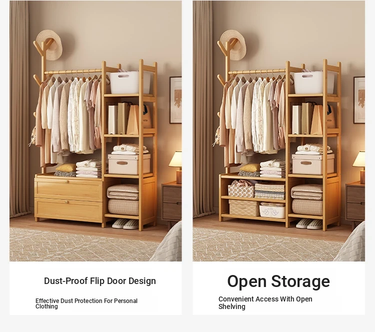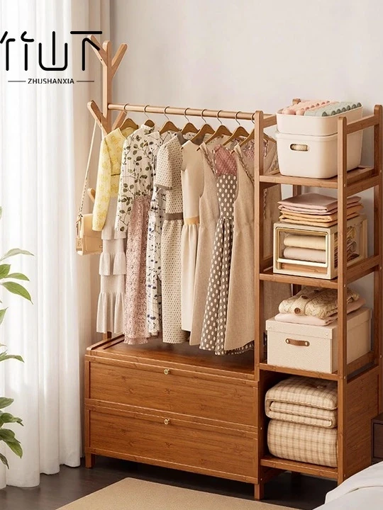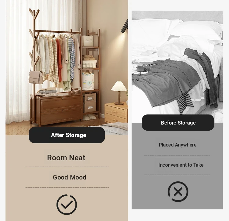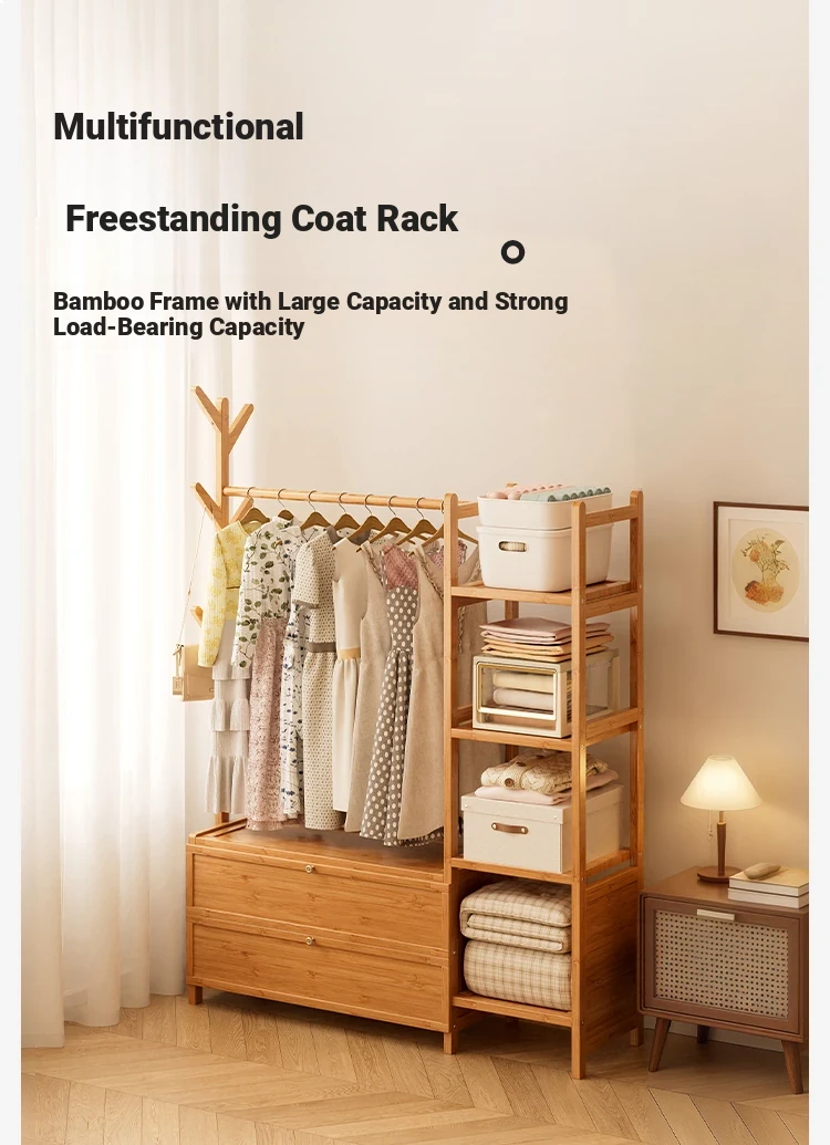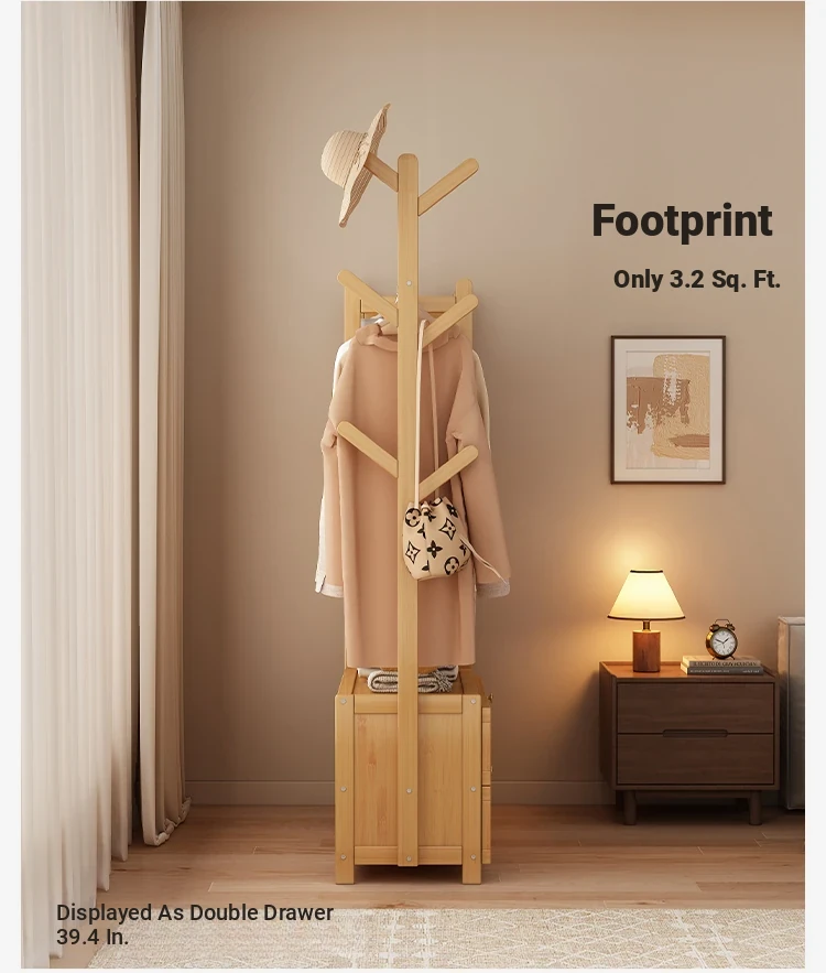Multifunctional Wooden Coat Rack with Storage Cabinet – Stylish Floor Standing Clothes Hanger for Bedroom, Perfect for Nighttime Outfit Organization and Space-Saving Solutions.
