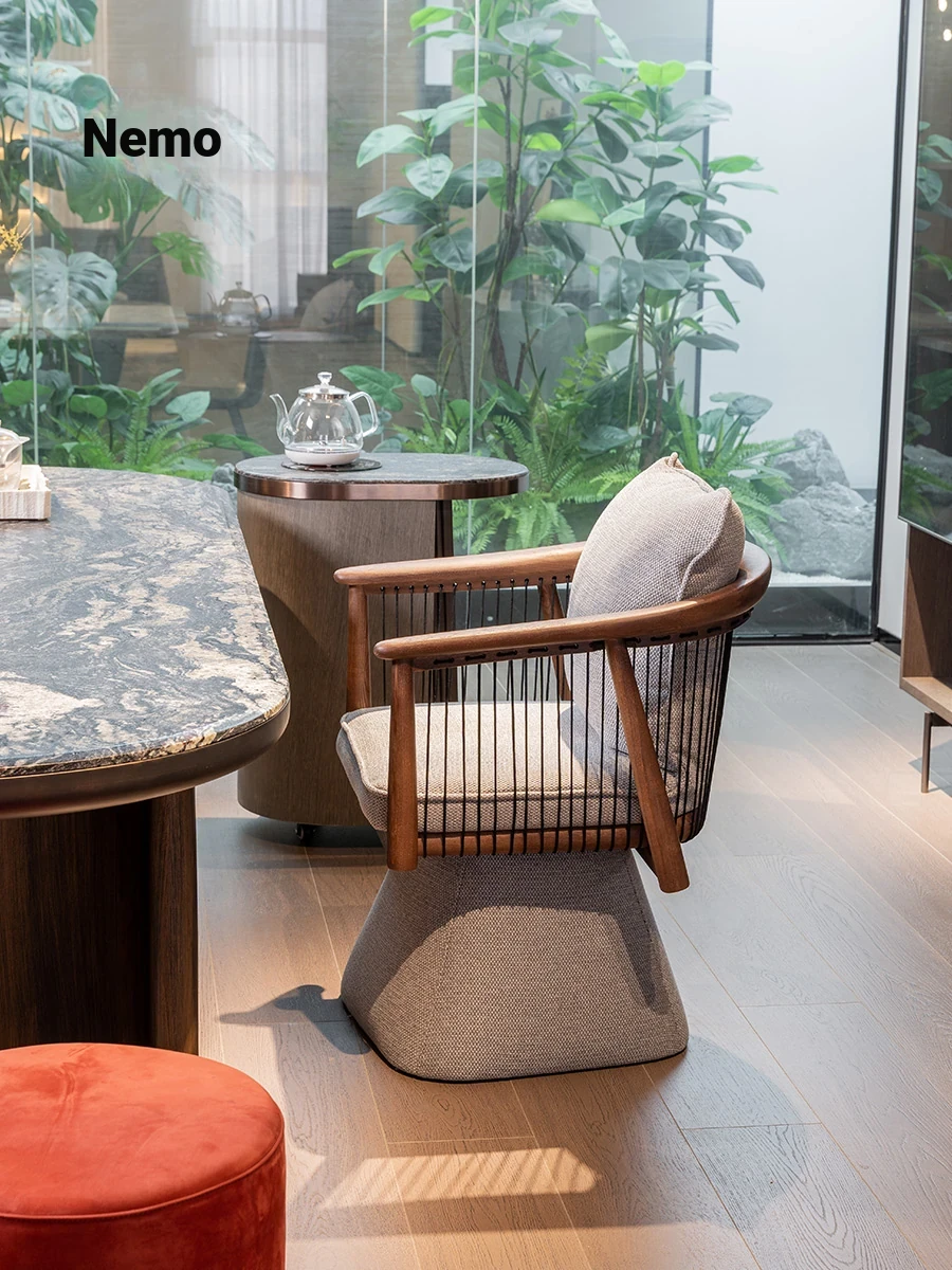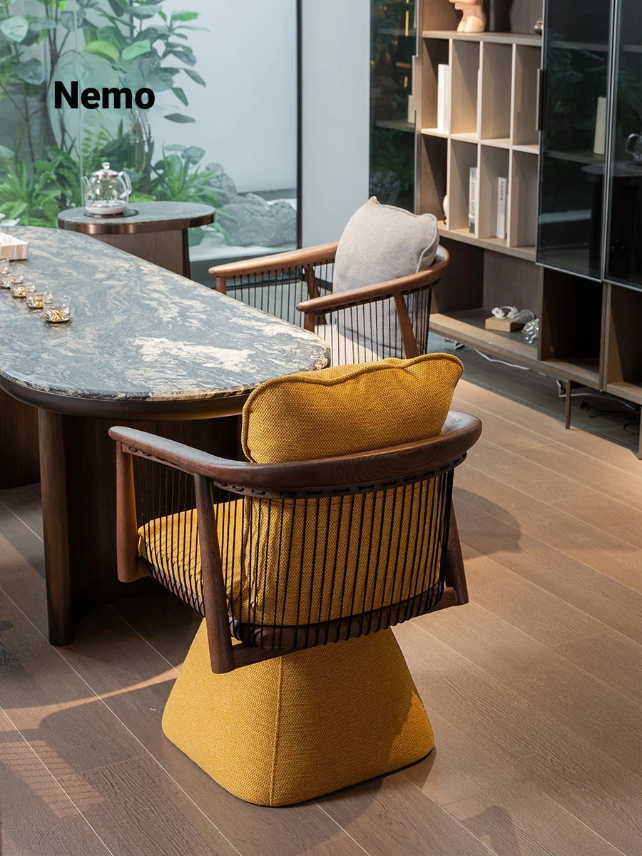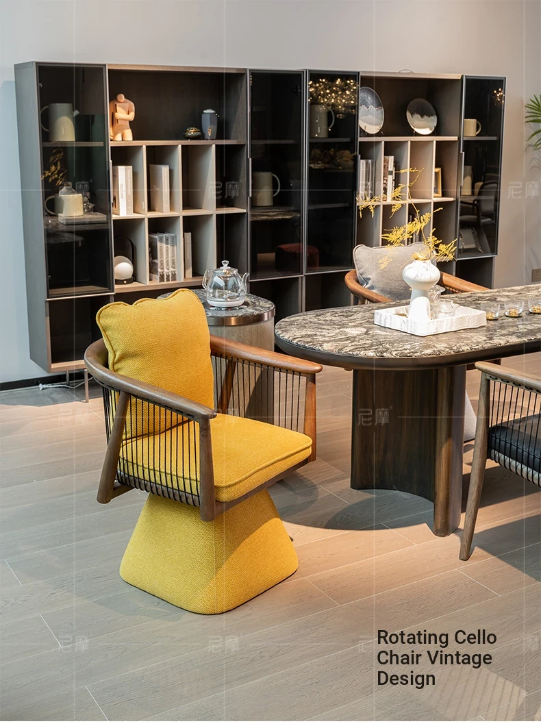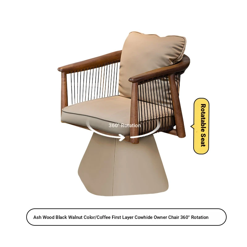 Nemo New Luxury Rotating Genuine Leather Solid Wood Armchair - Elegant Black Walnut Tea Chair with Vintage Style Backrest and Armrests, Perfect for Dining and Relaxation.