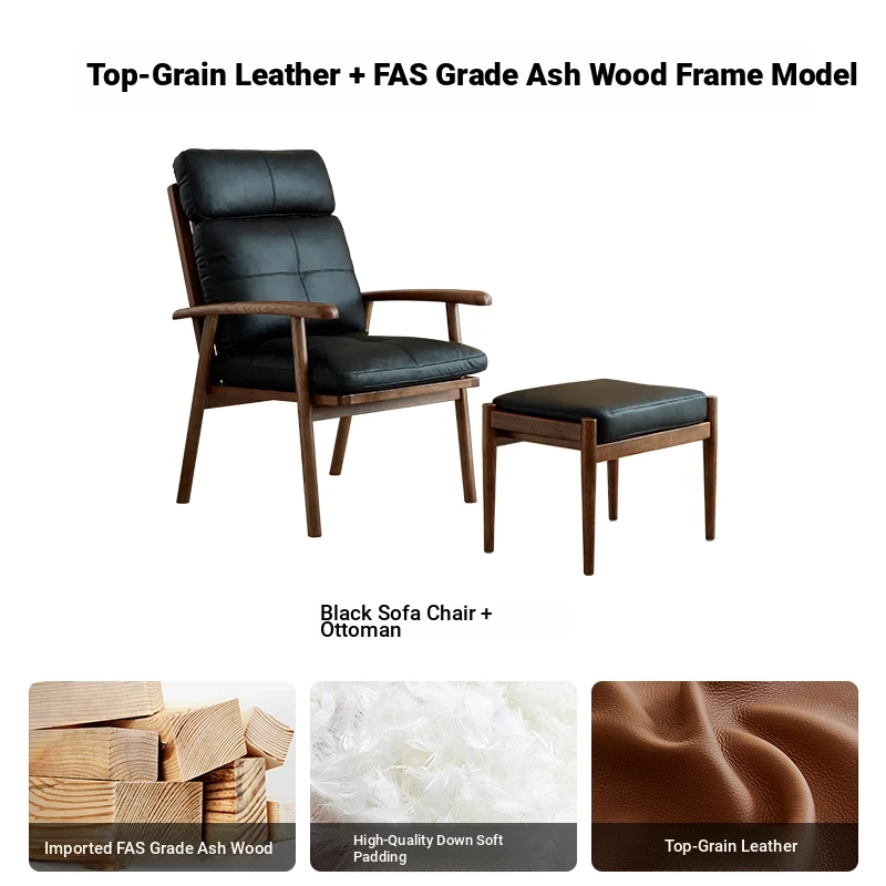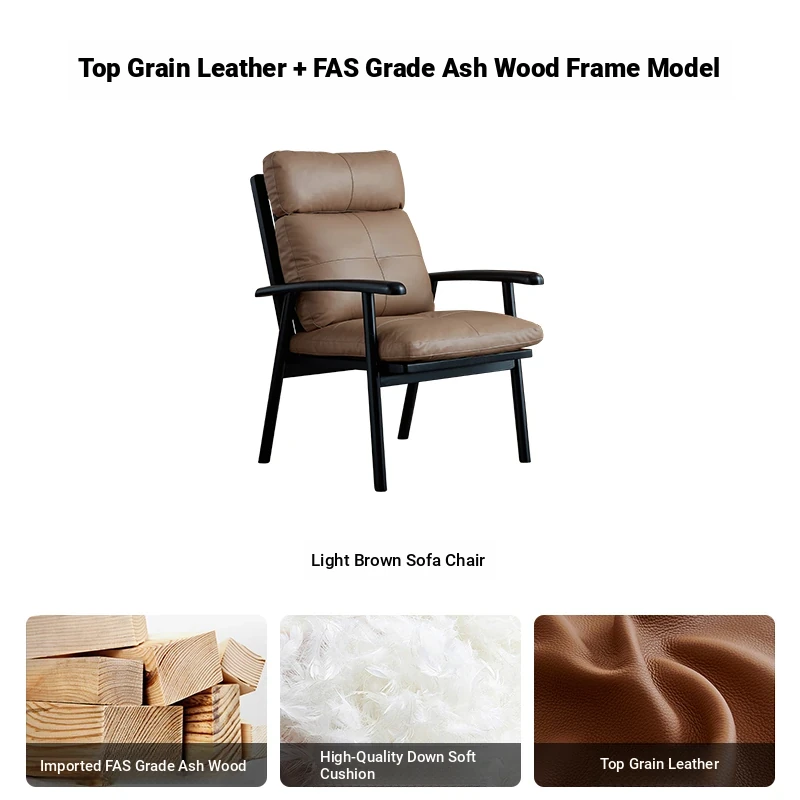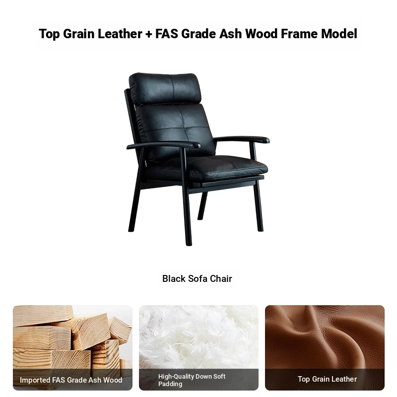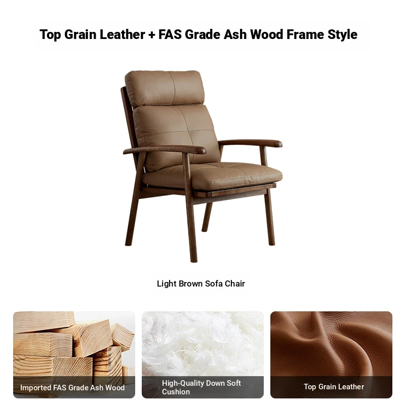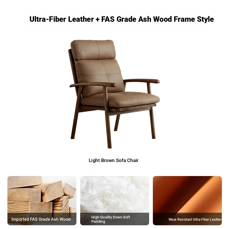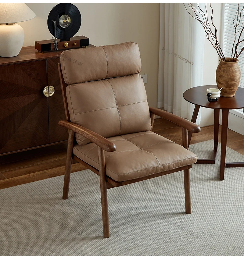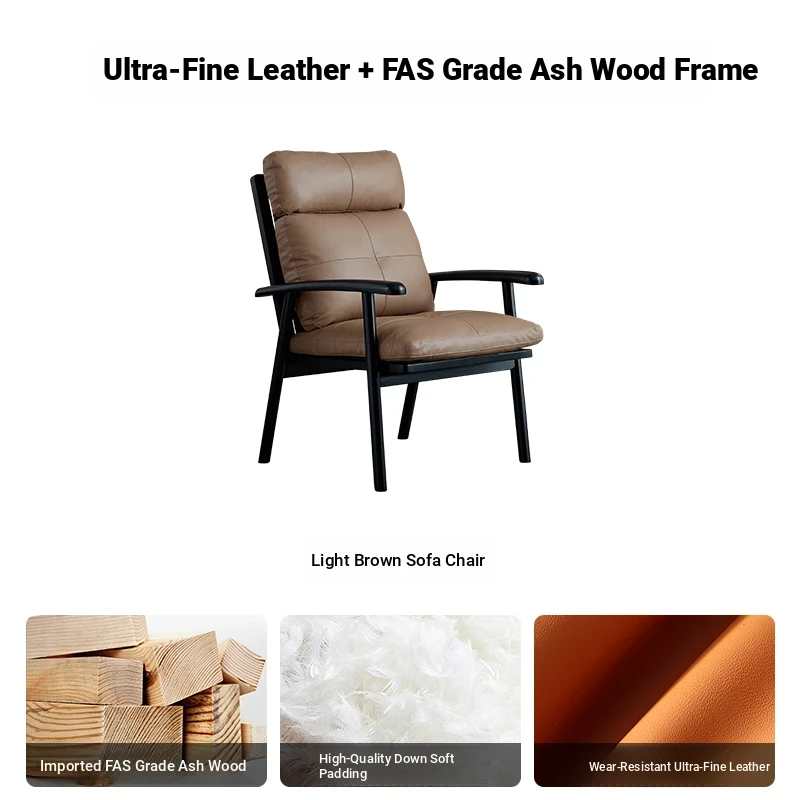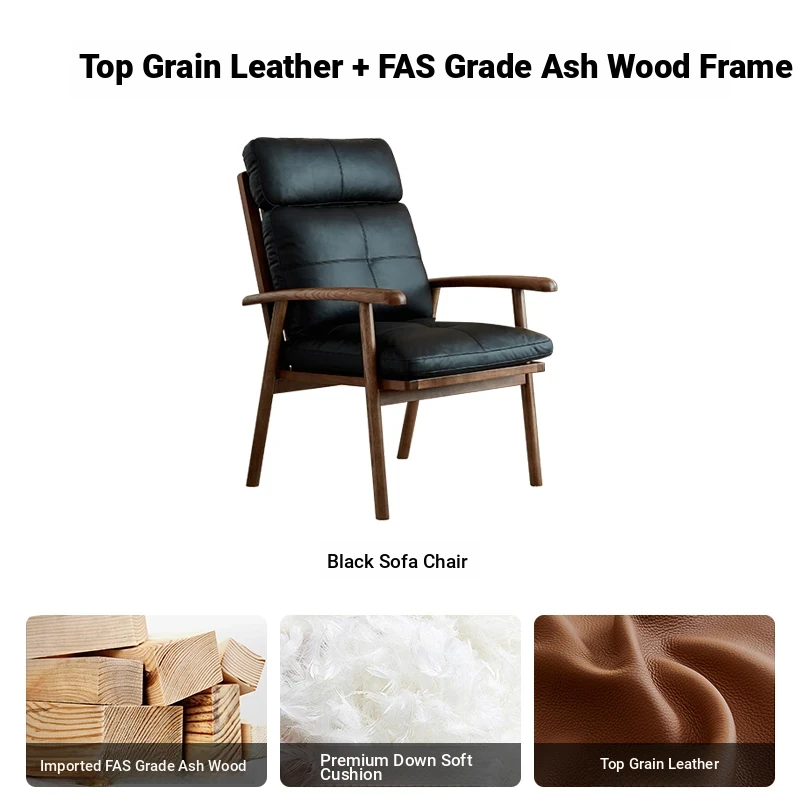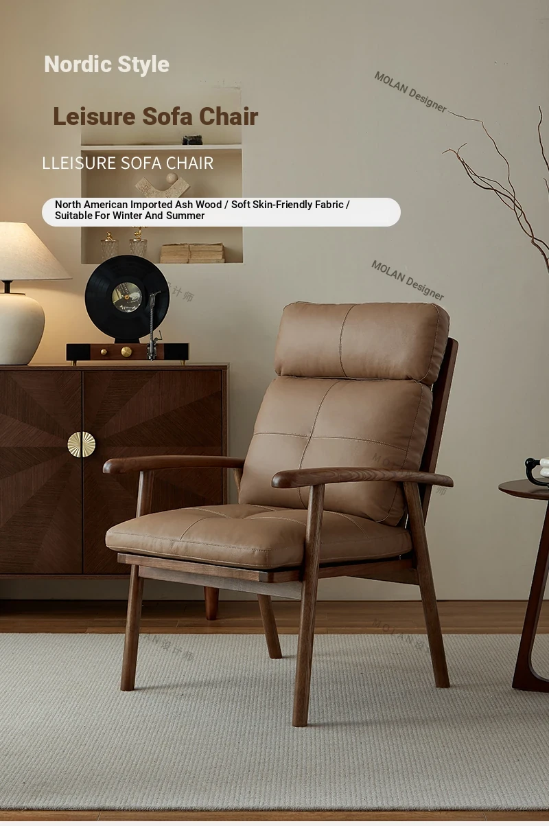 Nordic Solid Wood Genuine Leather Sofa Chair - Modern Minimalist Lounge Chair for Living Room and Balcony, Elegant Single Armchair with Headrest, Perfect for Relaxation