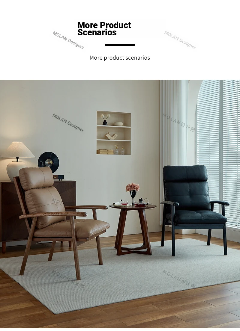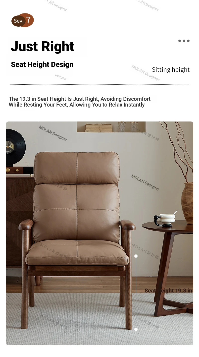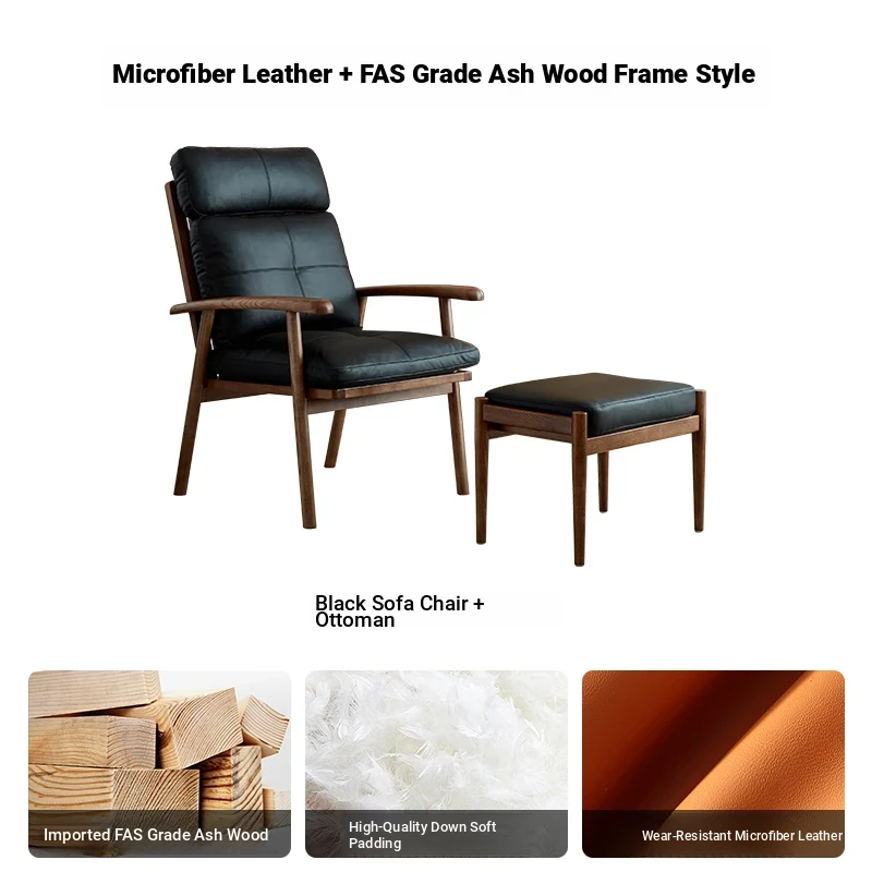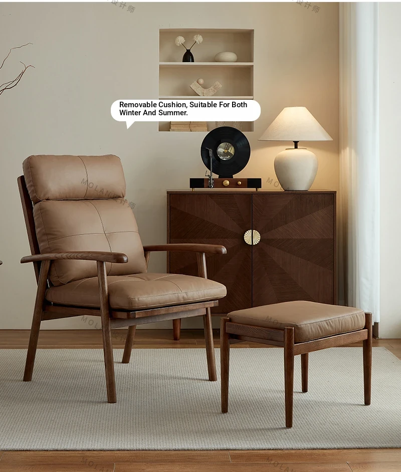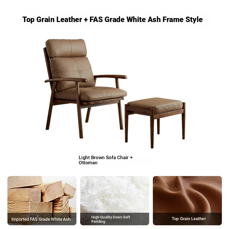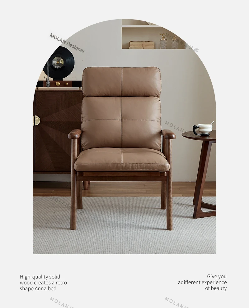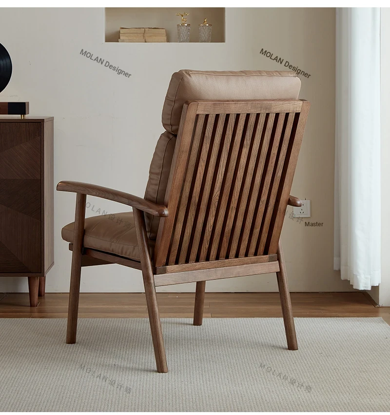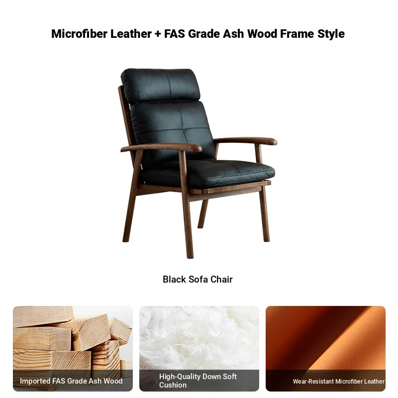 Nordic Solid Wood Genuine Leather Sofa Chair - Modern Minimalist Lounge Chair for Living Room and Balcony, Elegant Single Armchair with Headrest, Perfect for Relaxation
