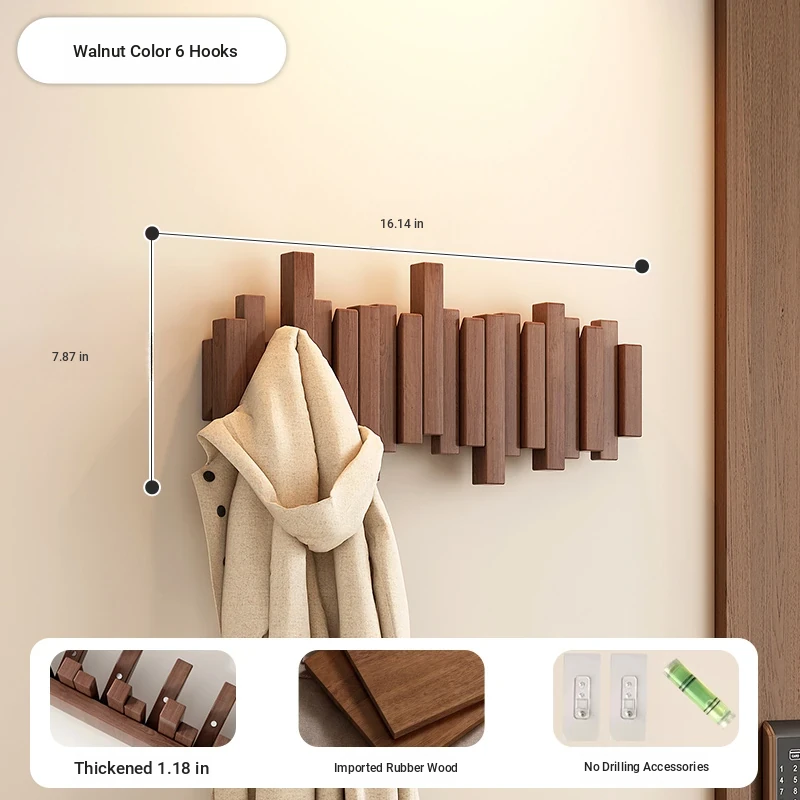 [No punching] walnut color 6 Hook [international FSC certification rubber wood] [send no punching accessories]]