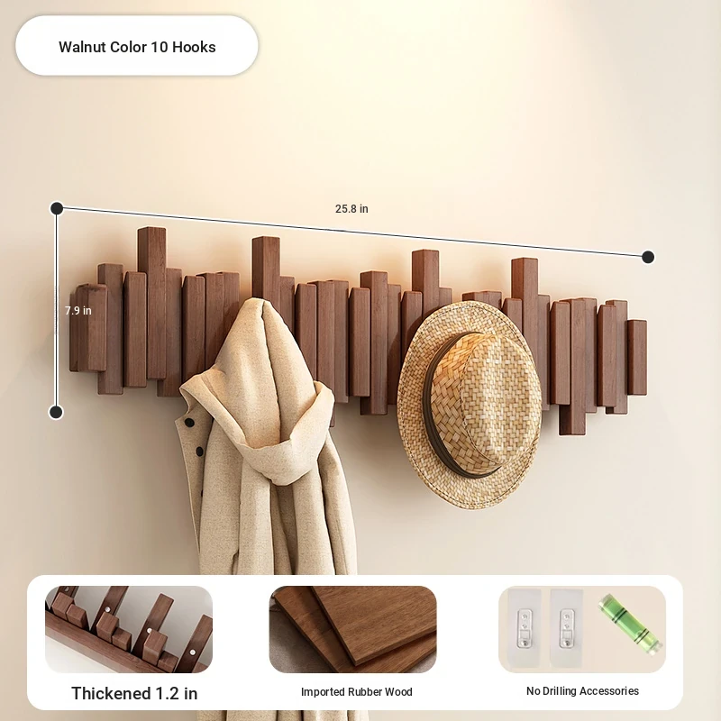 [No punching] walnut color 10 hook [international FSC certification rubber wood] [send no punching accessories]]