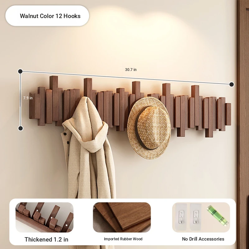 [No punching] walnut color 12 Hook [international FSC certification rubber wood] [send no punching accessories]]