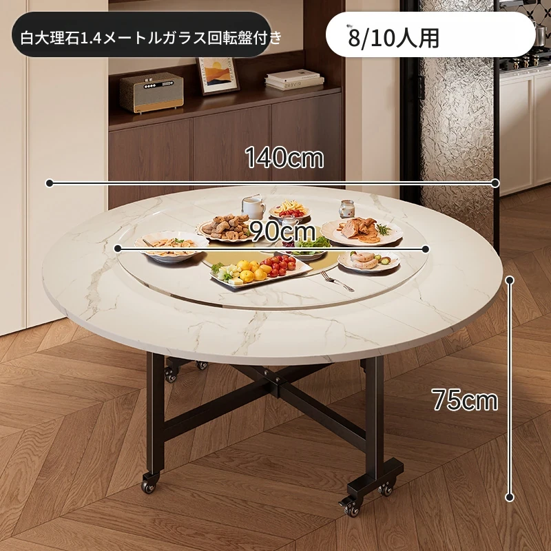 ホワイト大理石模様-ガラス天板付き1.4メートル【推奨8-10人】【防汚耐摩】【安定して崩れない】
