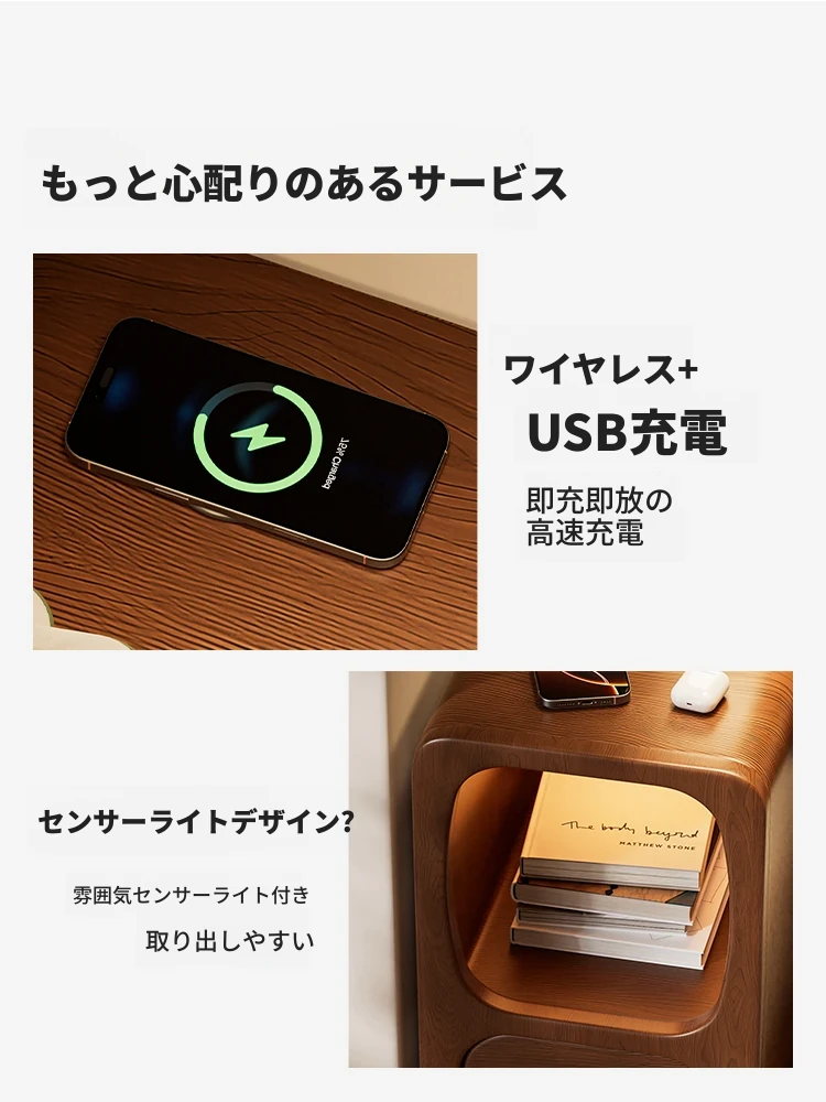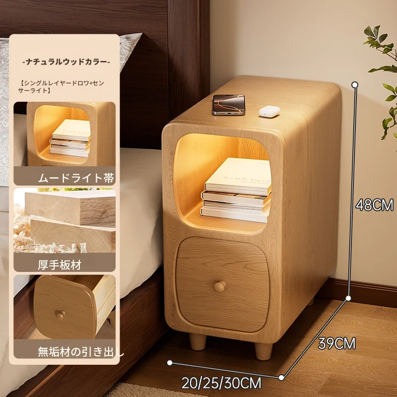 ナチュラルカラー『シングル引き出し+ワイヤレス充電+センサーライト』⭐無垢材引き出し