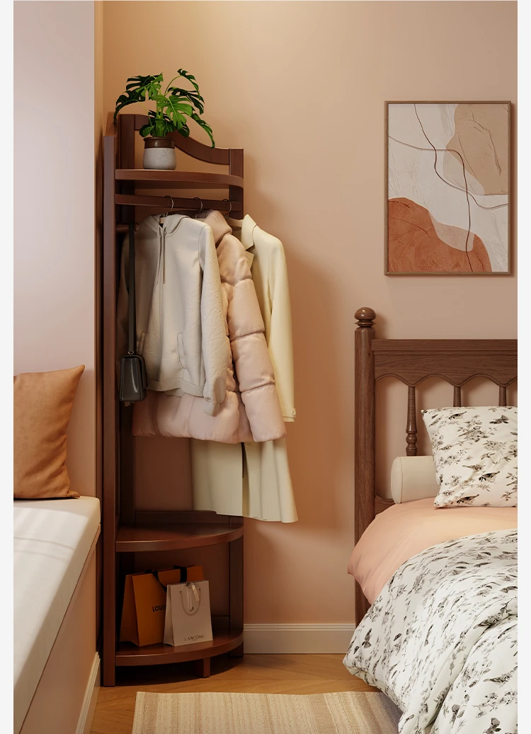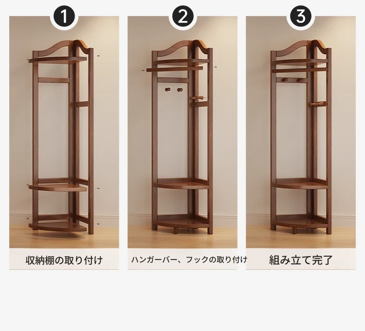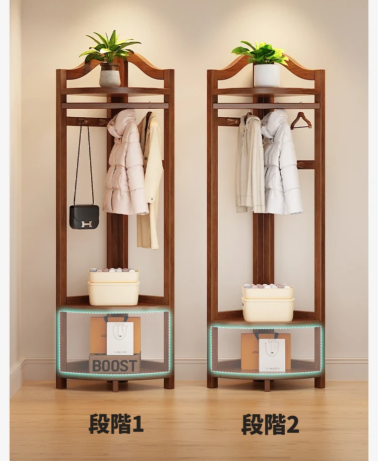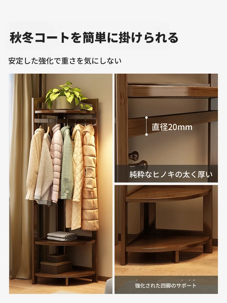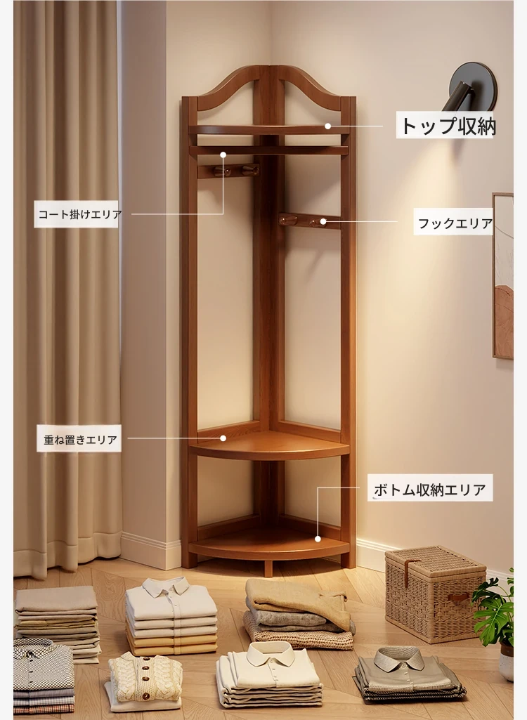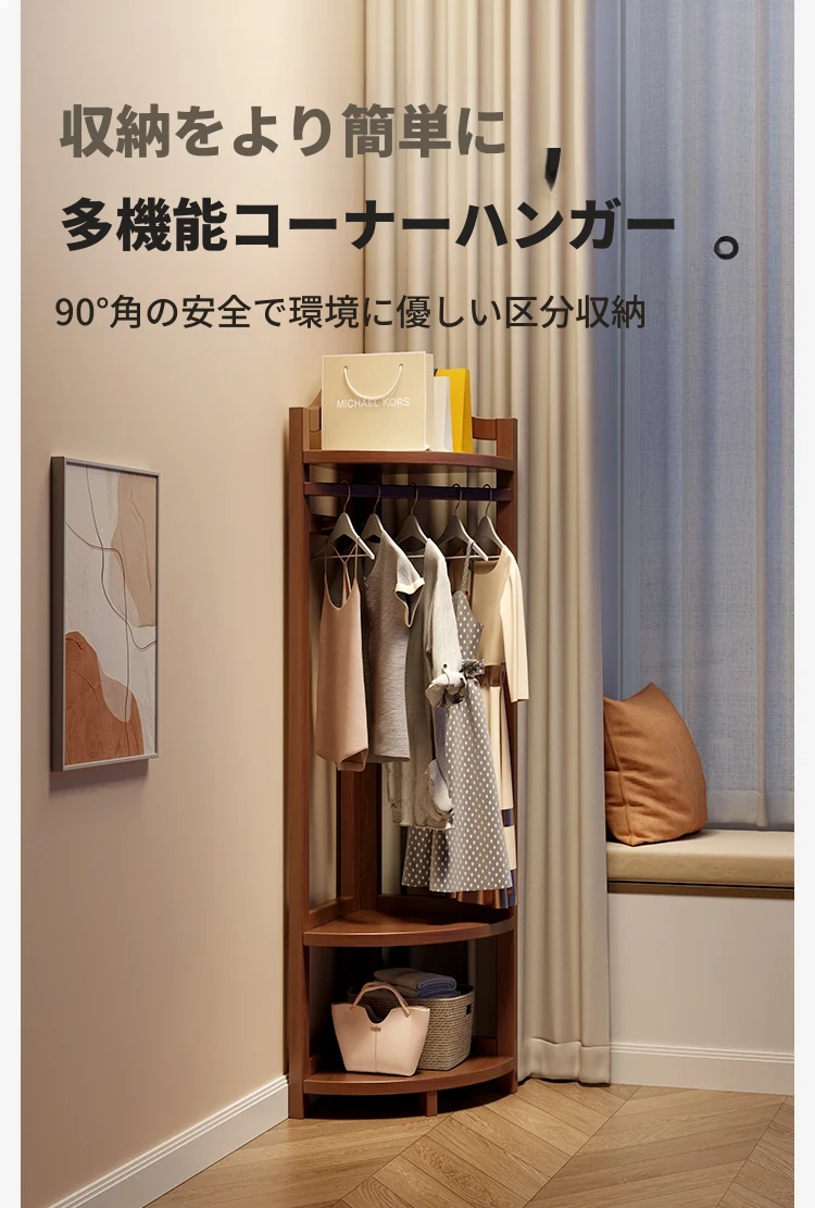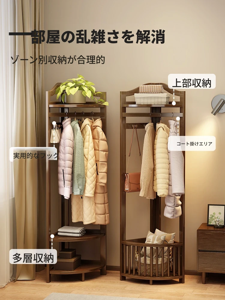 スペースを取らない!角部屋にぴったりの衣類ハンガー・コートラック。玄関や寝室で活躍するコンパクトな収納棚。バッグや衣類をスッキリ整理できる優れものです!