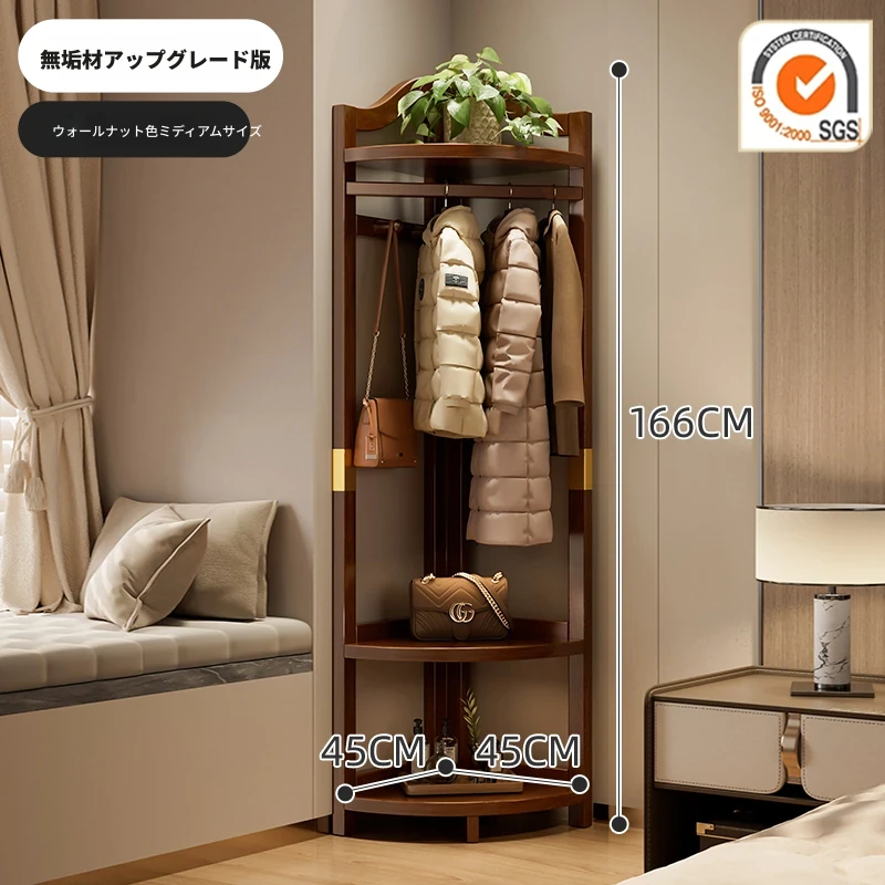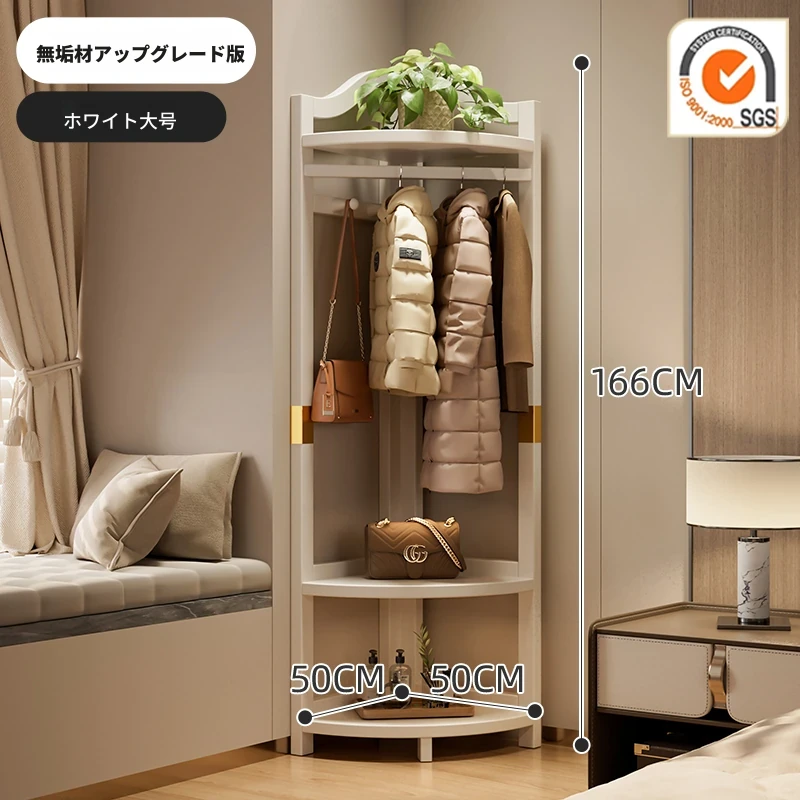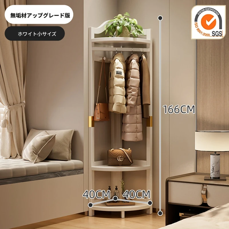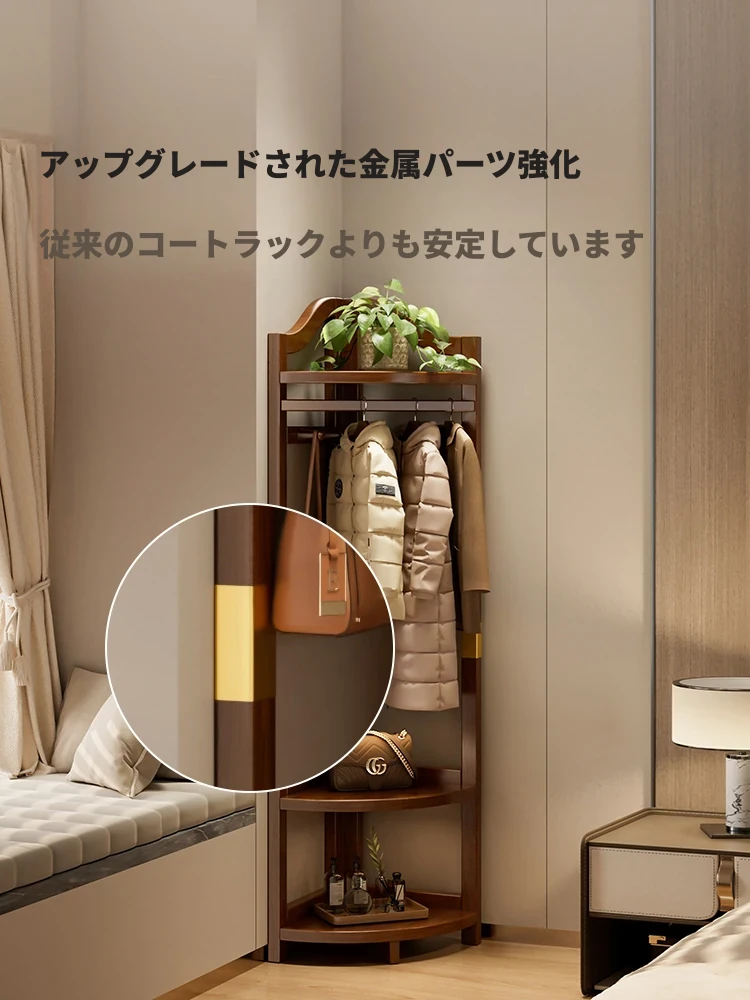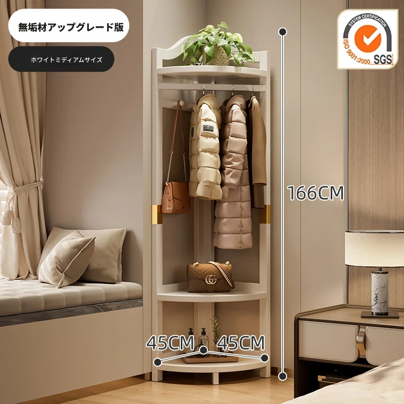 角にぴったり!省スペースで使える衣帽架 - 寝室や玄関に最適なスタイリッシュな掛ける収納ラック。ベッドサイドでも活躍する角棚で、整理整頓をお手伝いします。