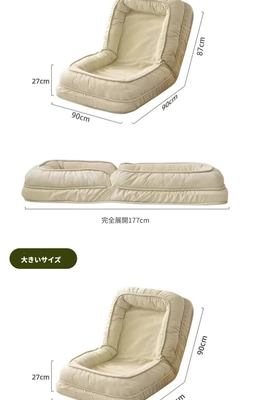 クリームホワイトテクノロジー布大サイズ【展開90*177】クッション2個プレゼント
