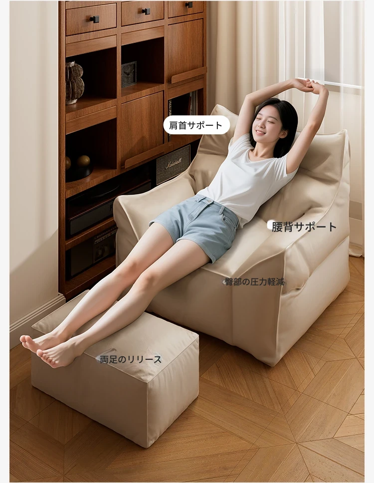 寝室にぴったりな一人用リクライニングソファ!寝転がってくつろげる、子供の読書やリラックスタイムに最適なビーズソファ。リビングやバルコニーにも最適な、快適でスタイリッシュなデザインです。