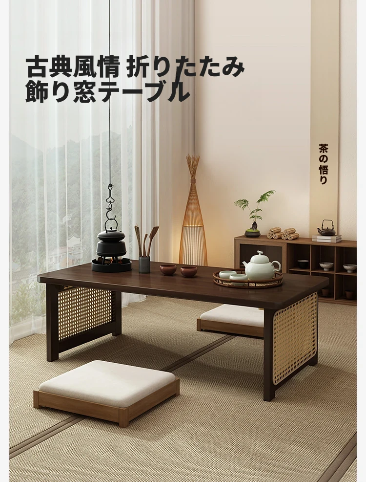 和風の小さな窓辺テーブル、畳で使える茶卓、低いダイニングテーブルとしても最適!座ってリラックスしながら、心地よい中華禅の雰囲気を楽しめる古風なデザイン。おしゃれで機能的な一品です!