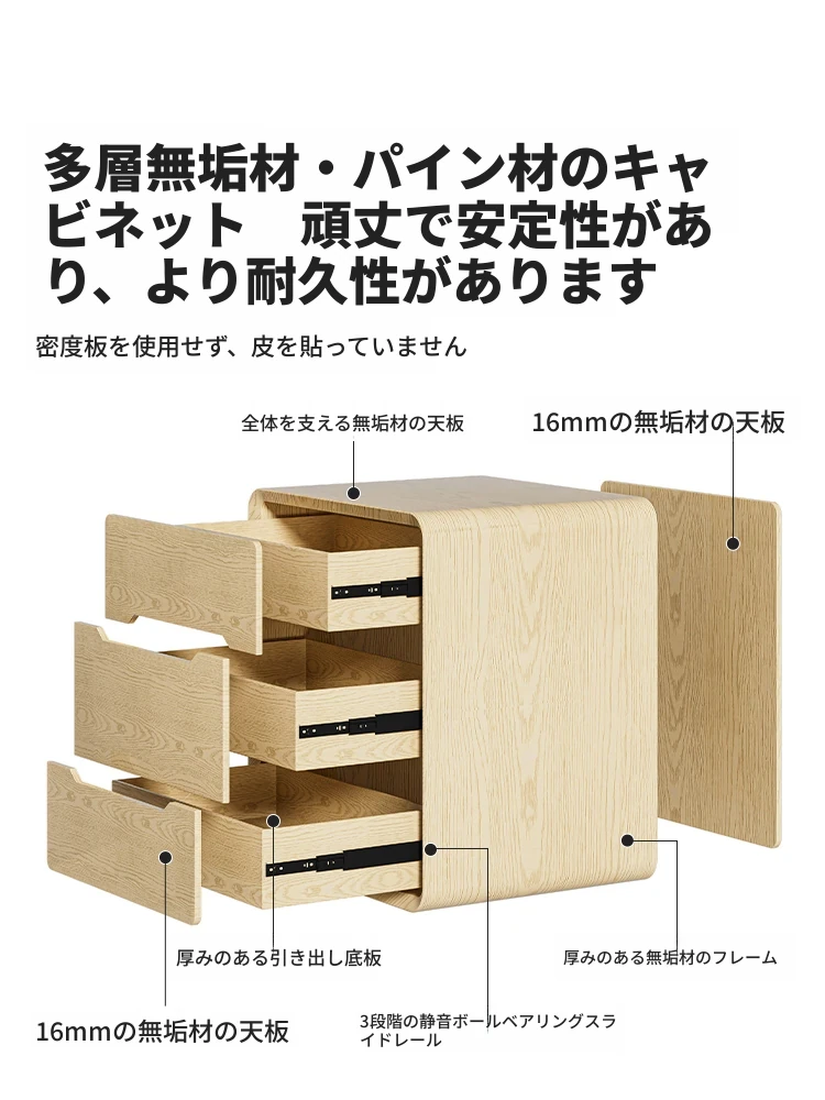 トリプル引き出し-クリーム色(厚手の多層無垢材フレーム+無垢材引き出し)