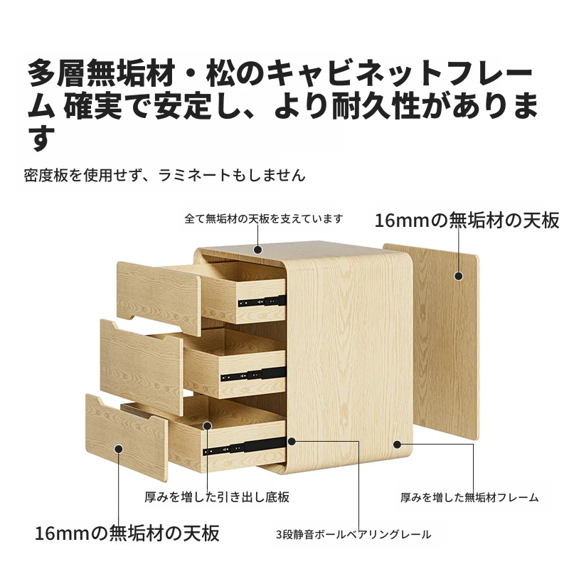トリプル引き出し-アイボリー色(厚手の多層無垢材フレーム+無垢材引き出し)