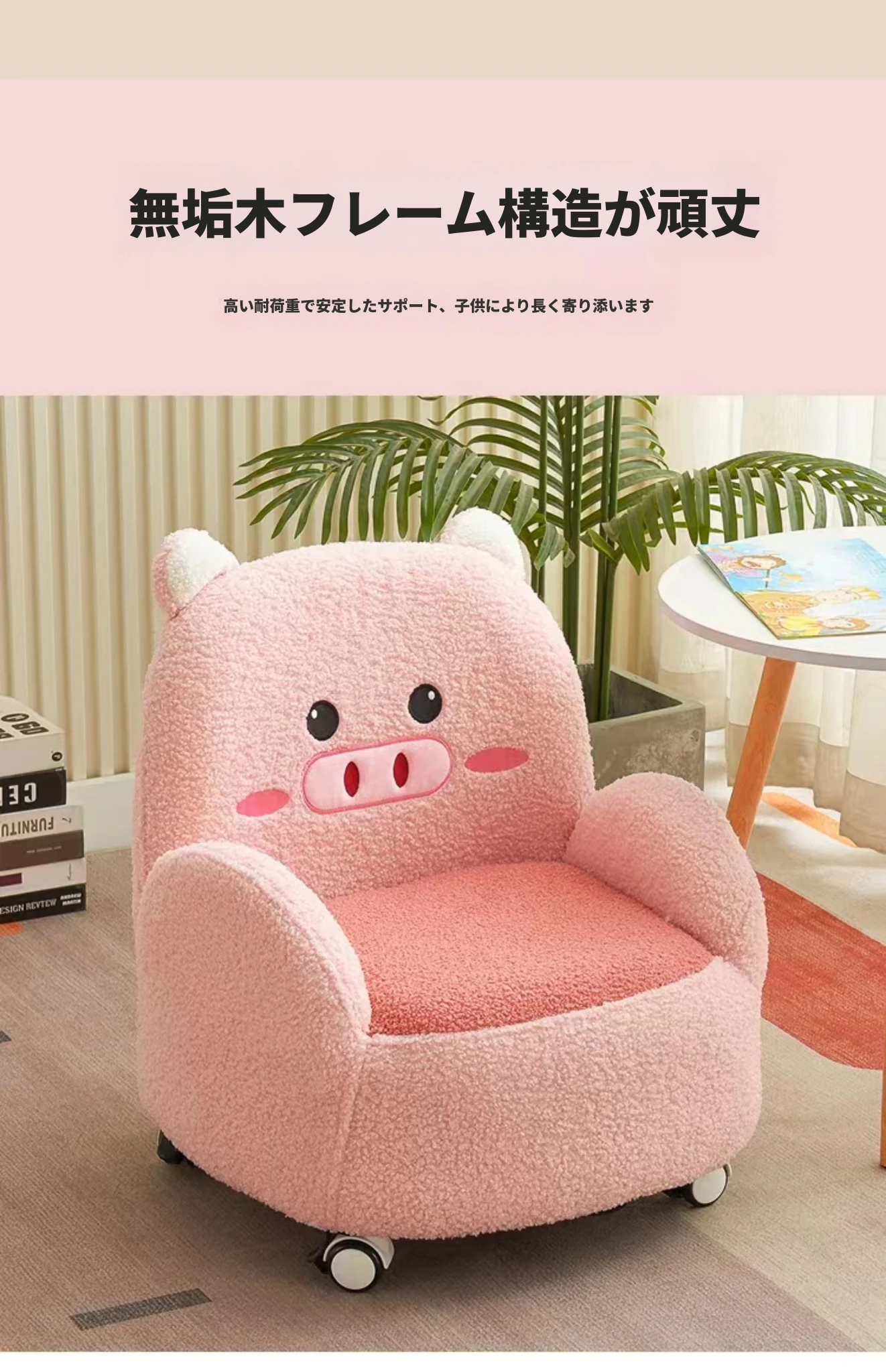 ピンクの花の豚-ベーシックタイプ【車輪なし・無垢材脚】