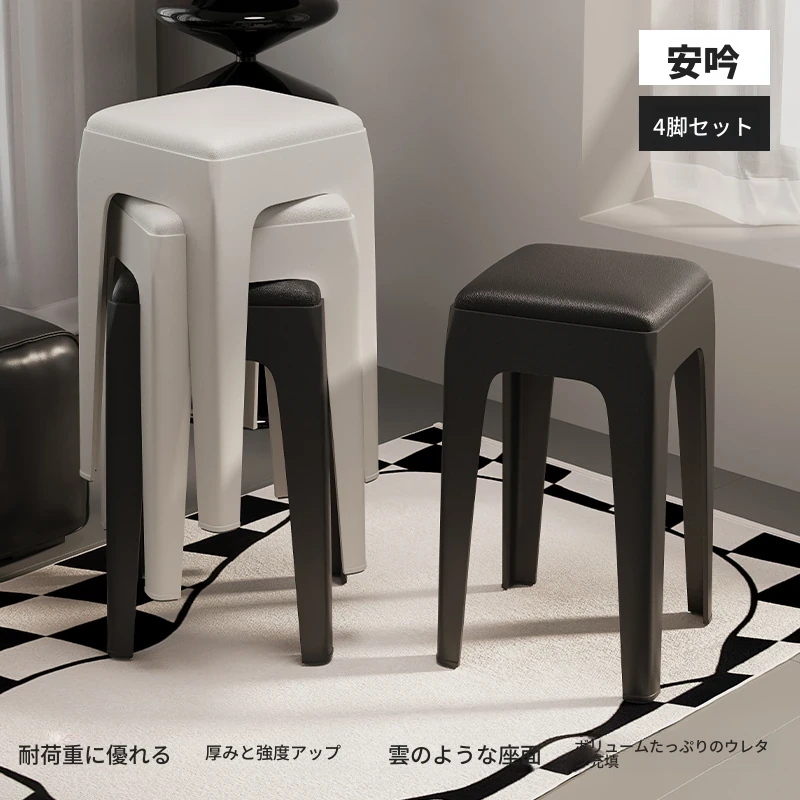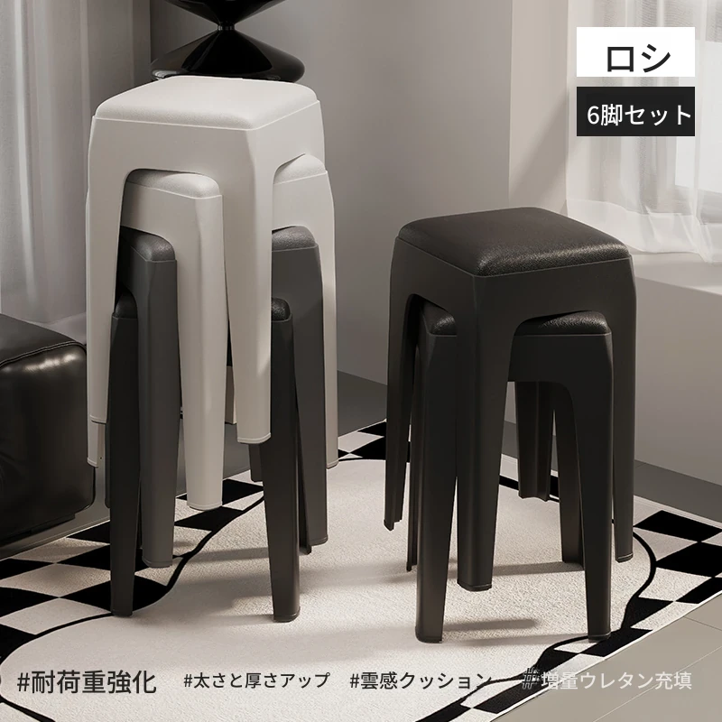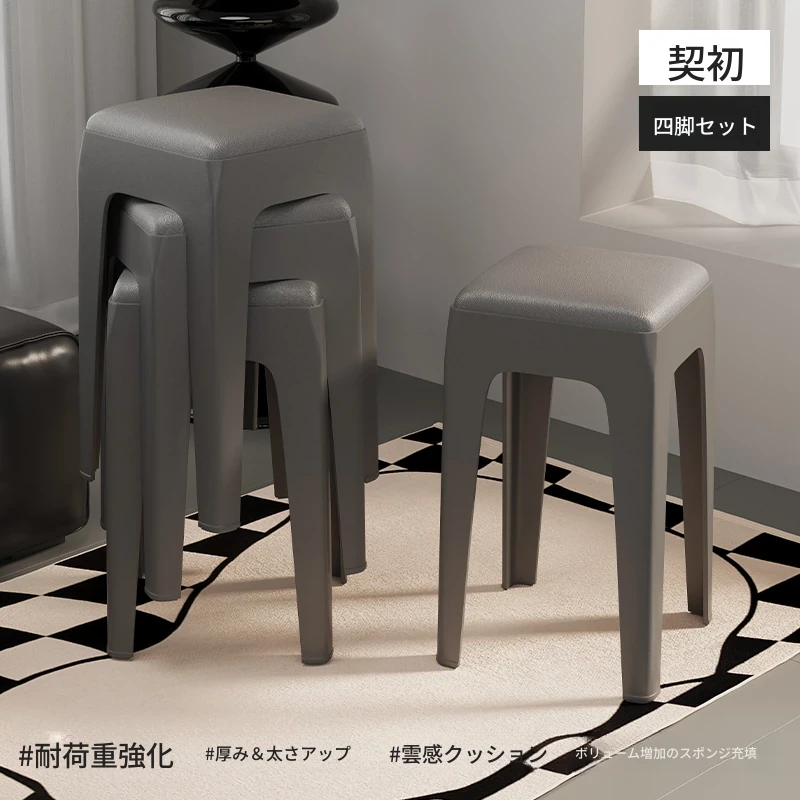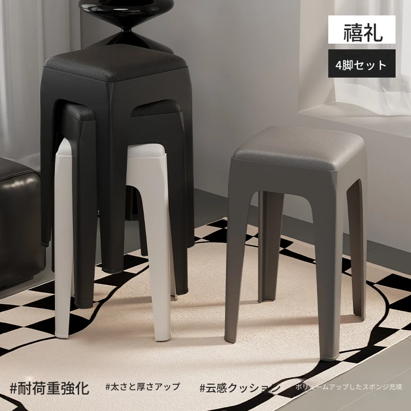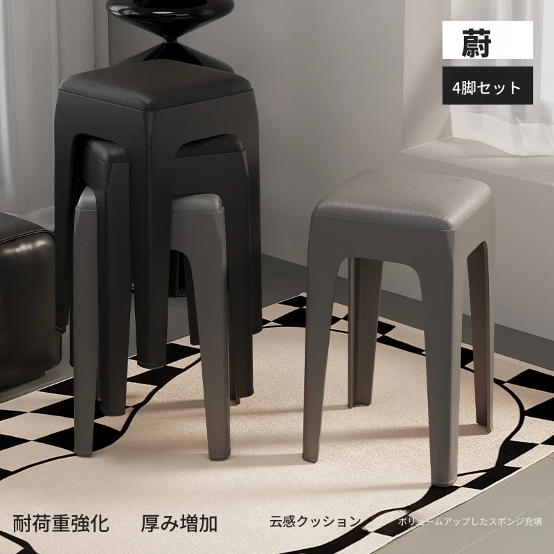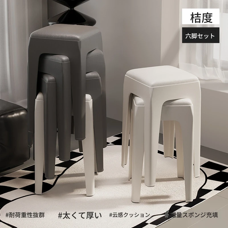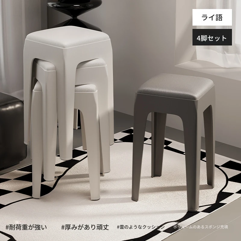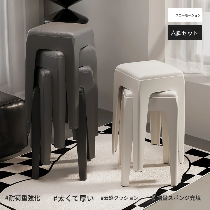 スタイリッシュな重ねられるプラスチックスツール - 家庭用に最適!頑丈で耐久性抜群、リビングやゲスト用に便利。高級感漂うソフトパッド付きで、快適さとデザインを両立!