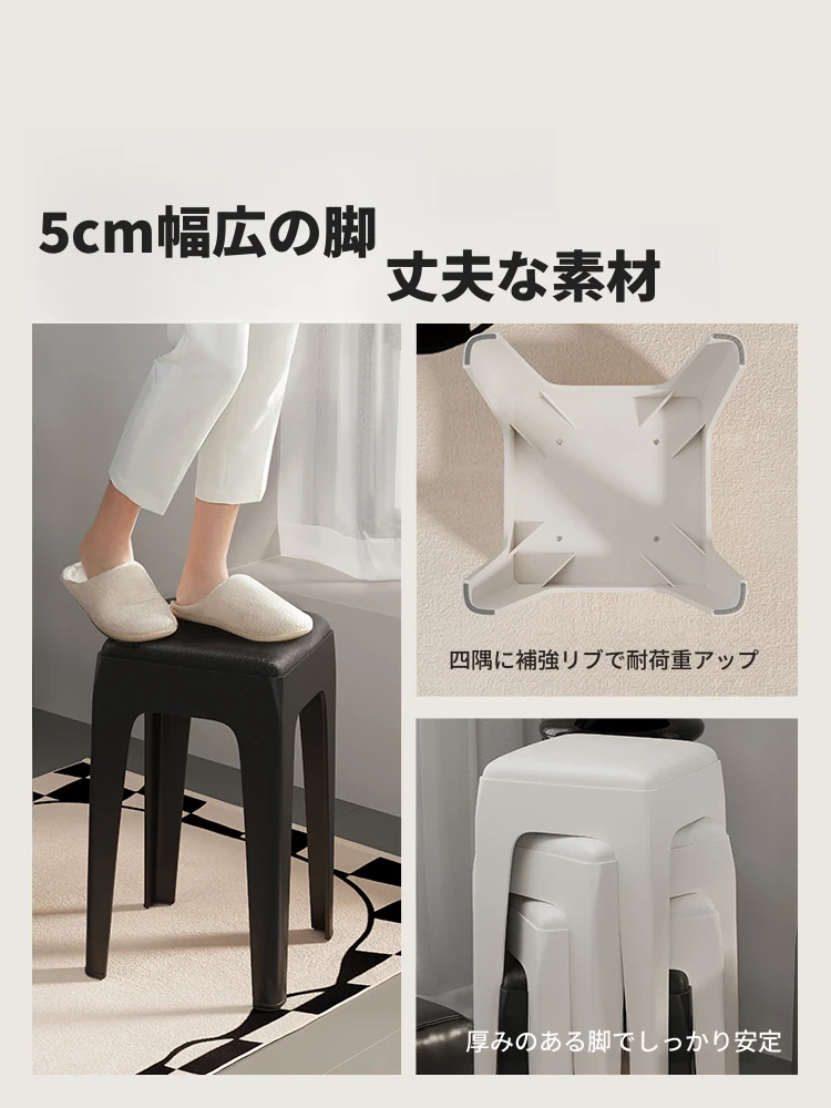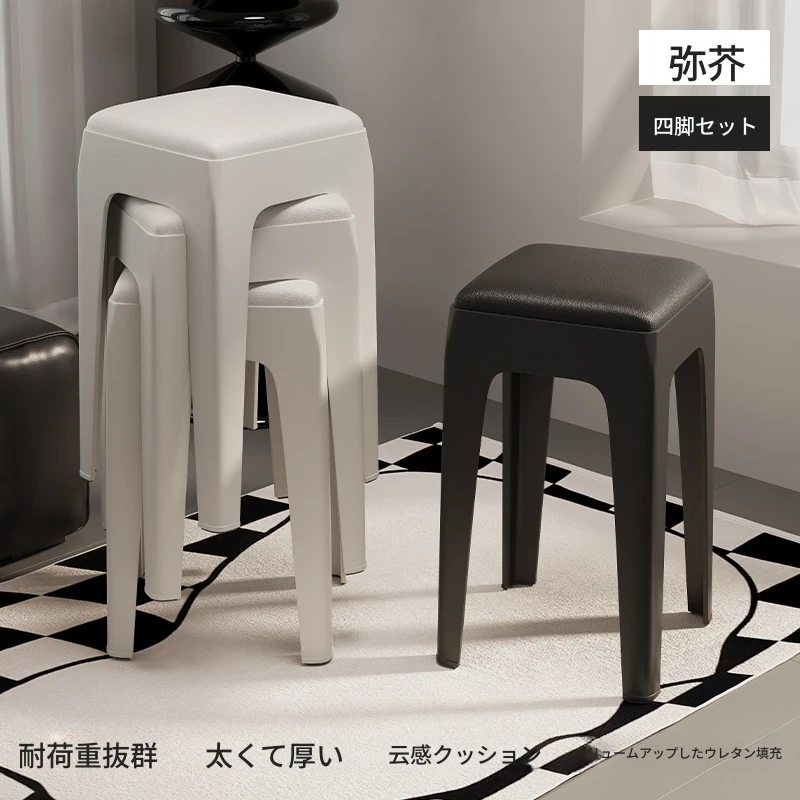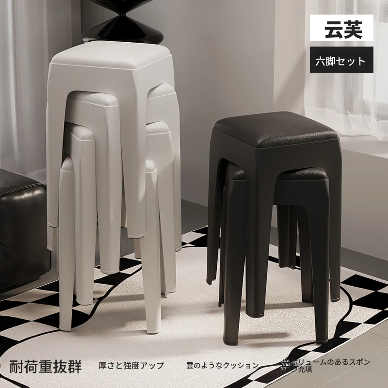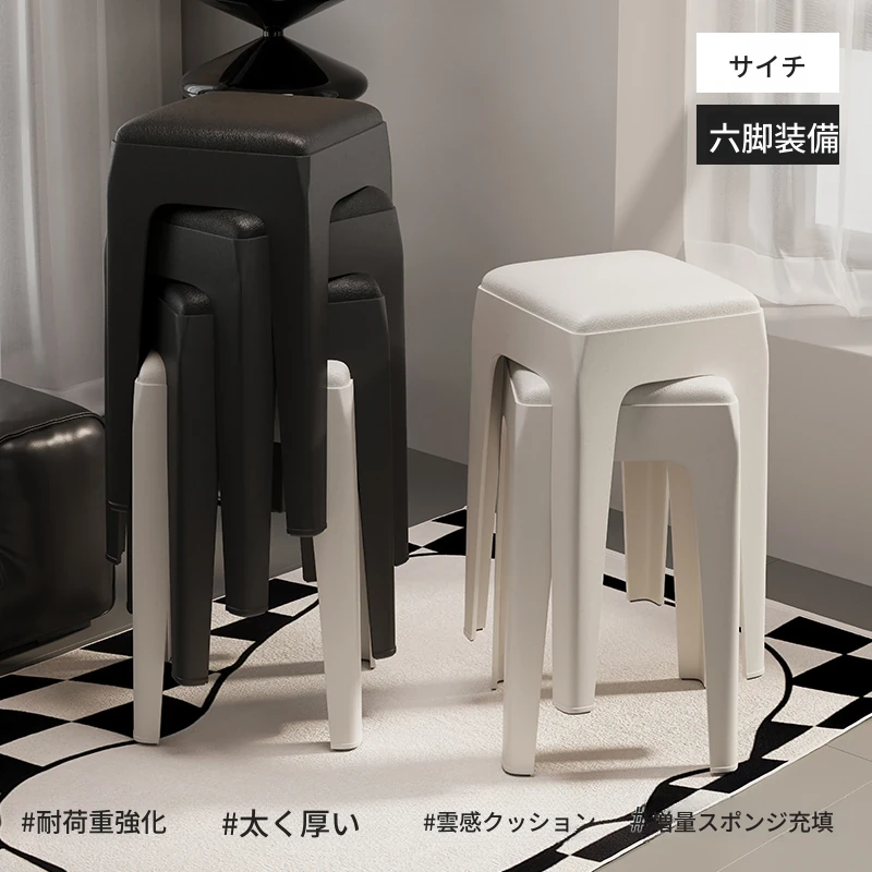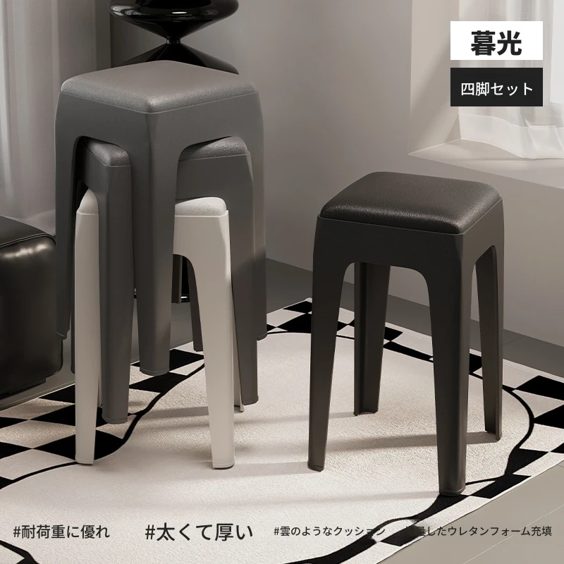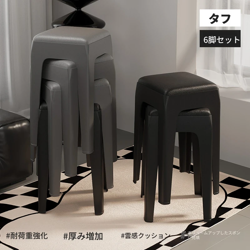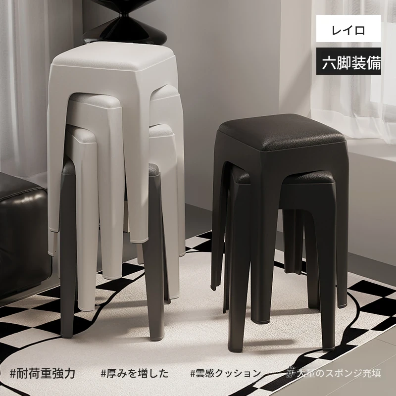 スタイリッシュな重ねられるプラスチックスツール - 家庭用に最適!頑丈で耐久性抜群、リビングやゲスト用に便利。高級感漂うソフトパッド付きで、快適さとデザインを両立!