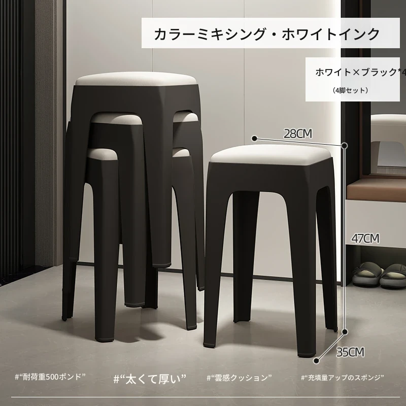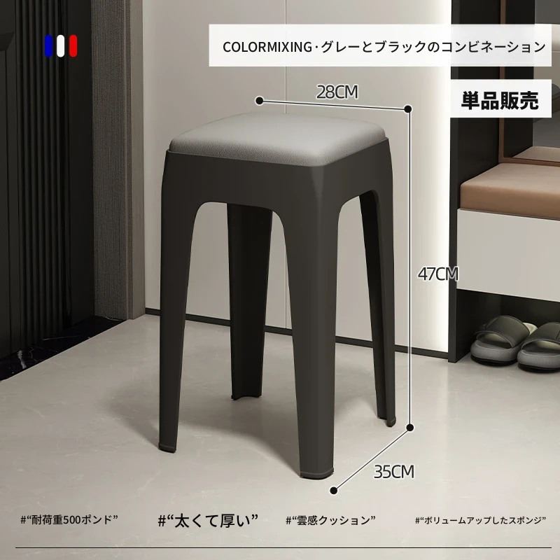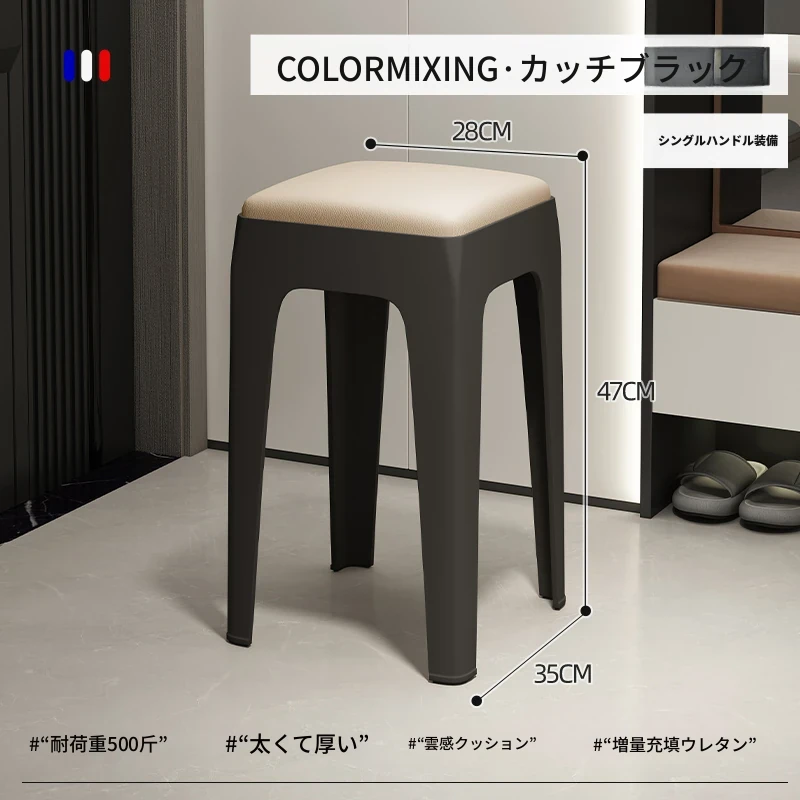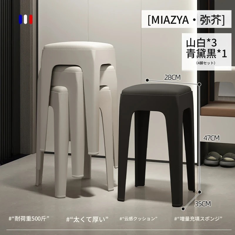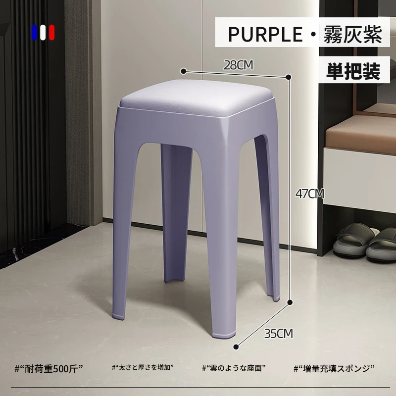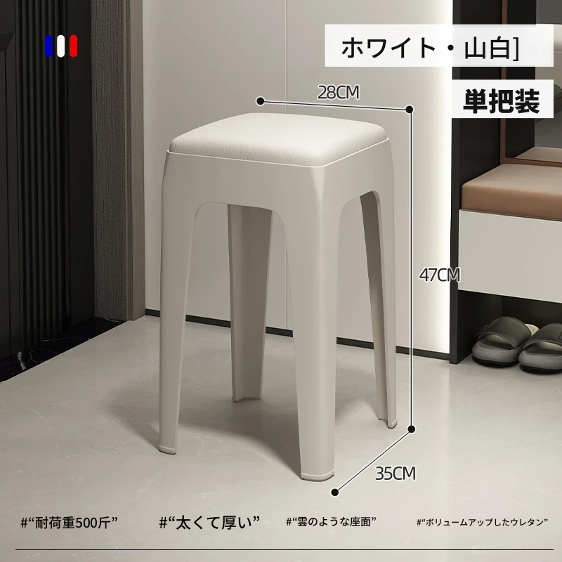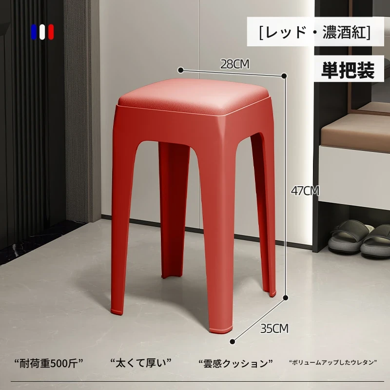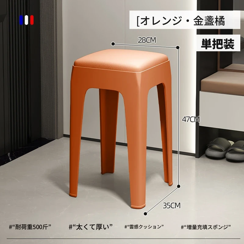 家庭用プラスチック厚手ソフトクッション四角スツール、頑丈で耐久性抜群!ゲスト用にも最適、スタッキング可能で化粧用やベンチとしても活躍。収納も簡単で、インテリアにもぴったり!