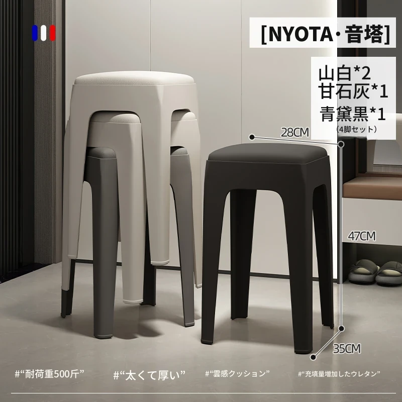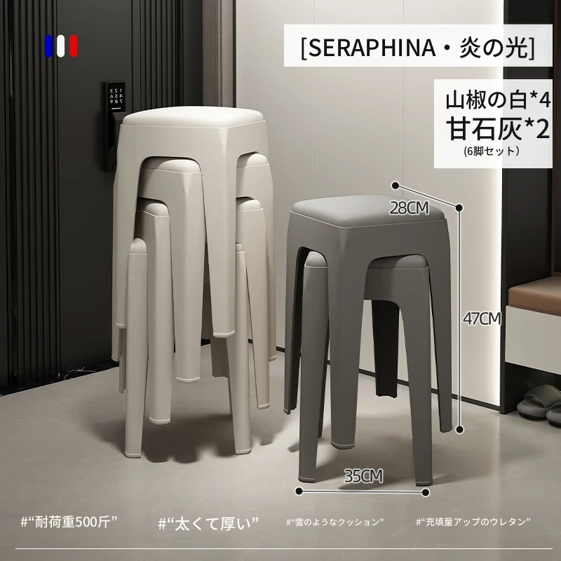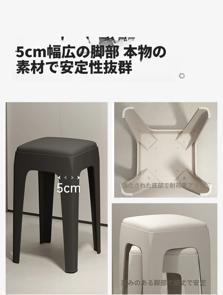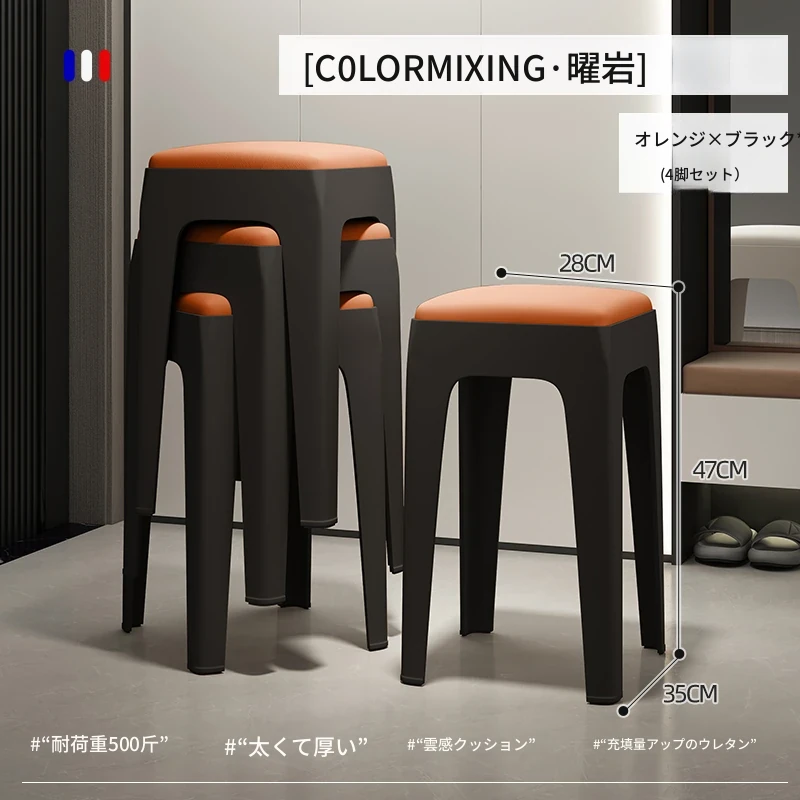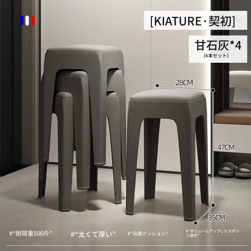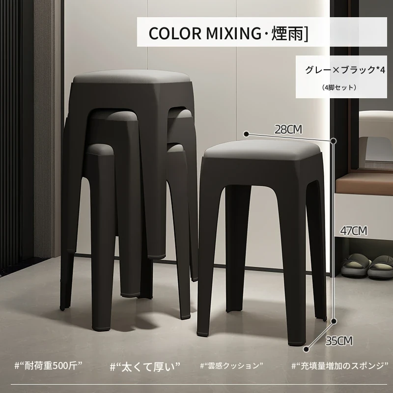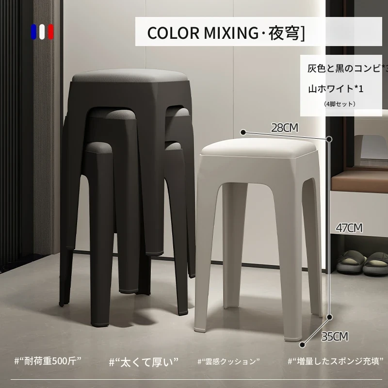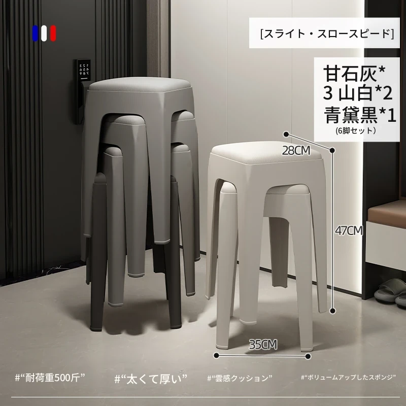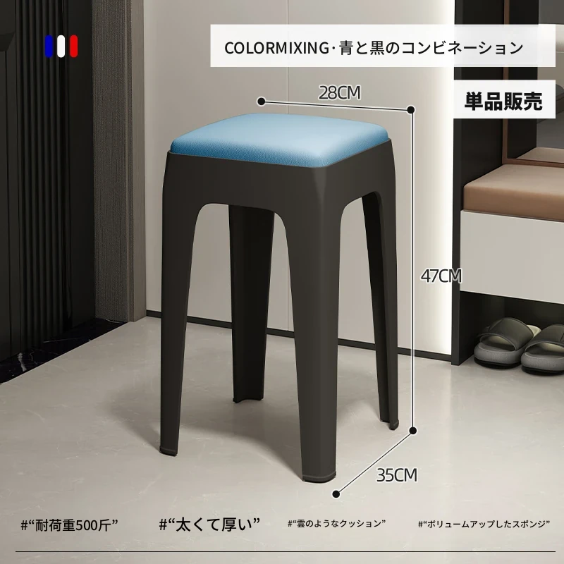 家庭用プラスチック厚手ソフトクッション四角スツール、頑丈で耐久性抜群!ゲスト用にも最適、スタッキング可能で化粧用やベンチとしても活躍。収納も簡単で、インテリアにもぴったり!