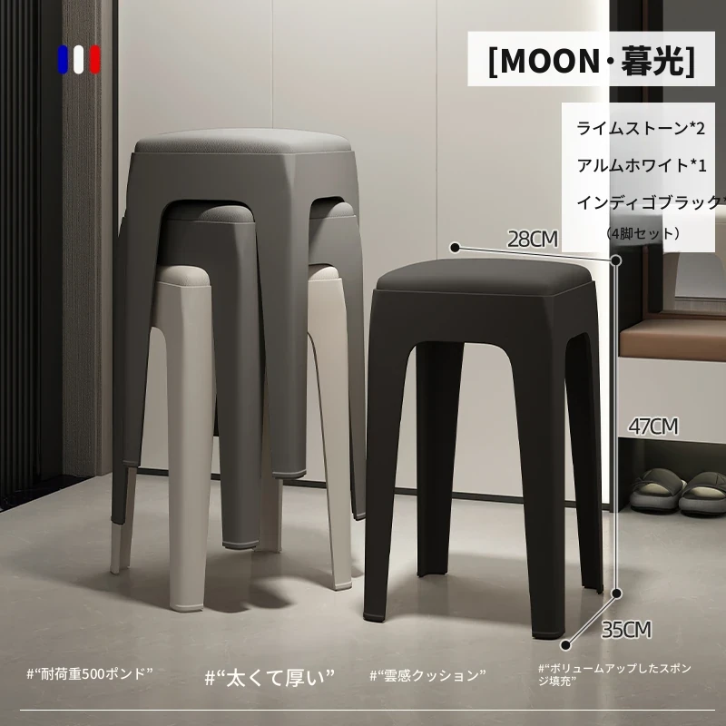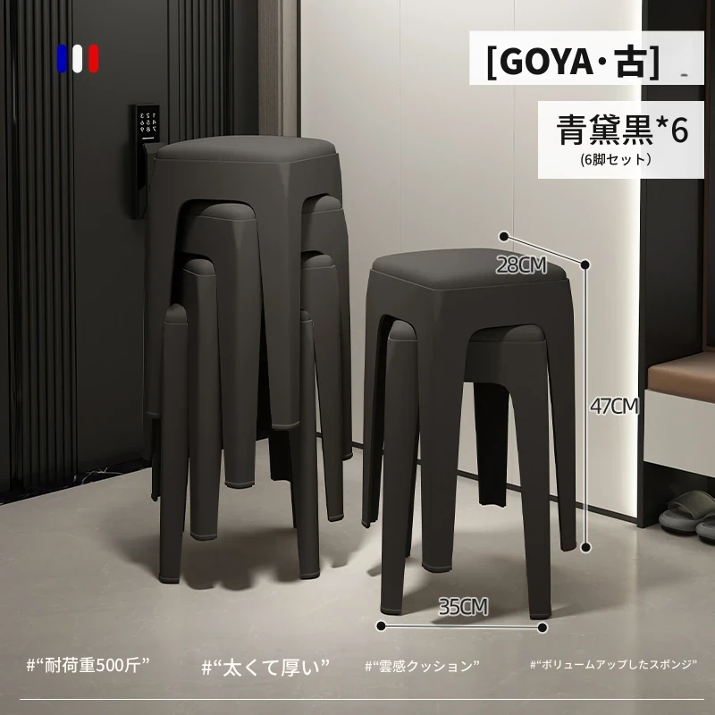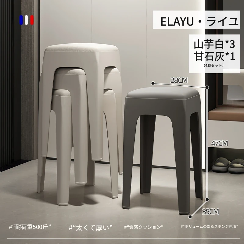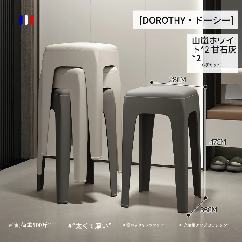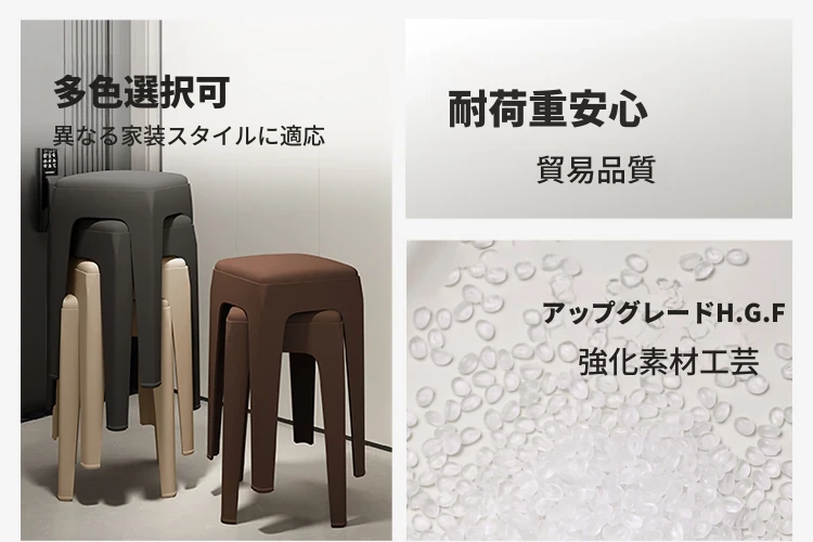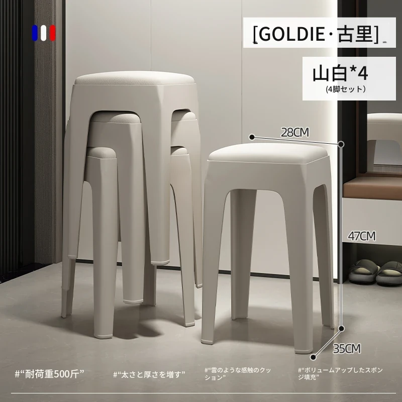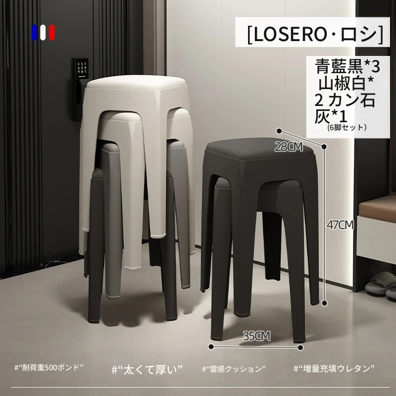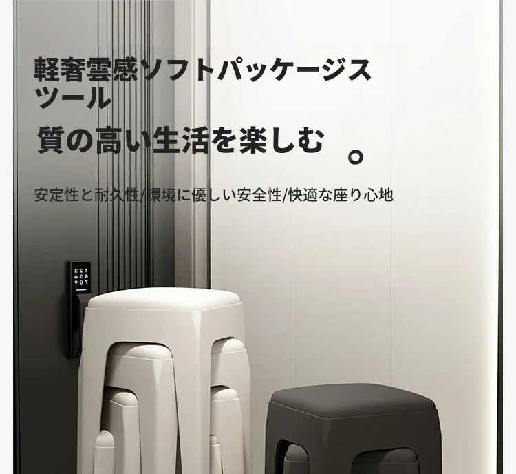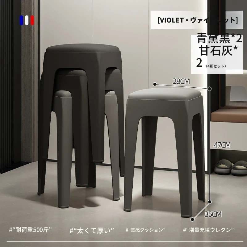 家庭用プラスチック厚手ソフトクッション四角スツール、頑丈で耐久性抜群!ゲスト用にも最適、スタッキング可能で化粧用やベンチとしても活躍。収納も簡単で、インテリアにもぴったり!