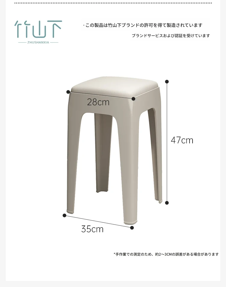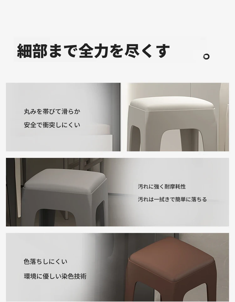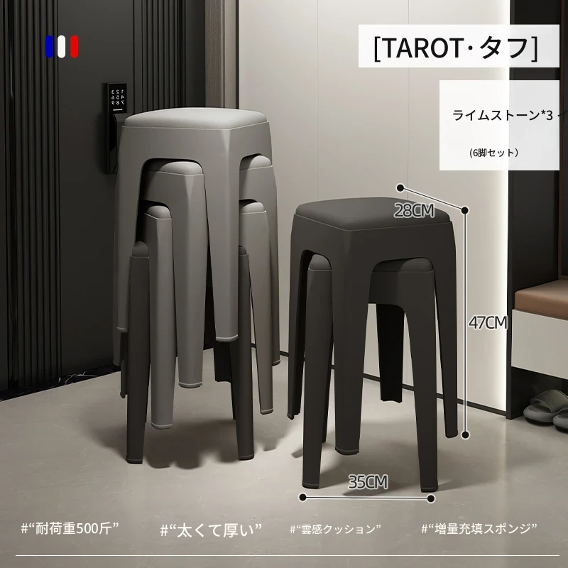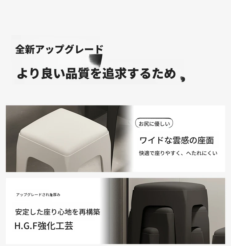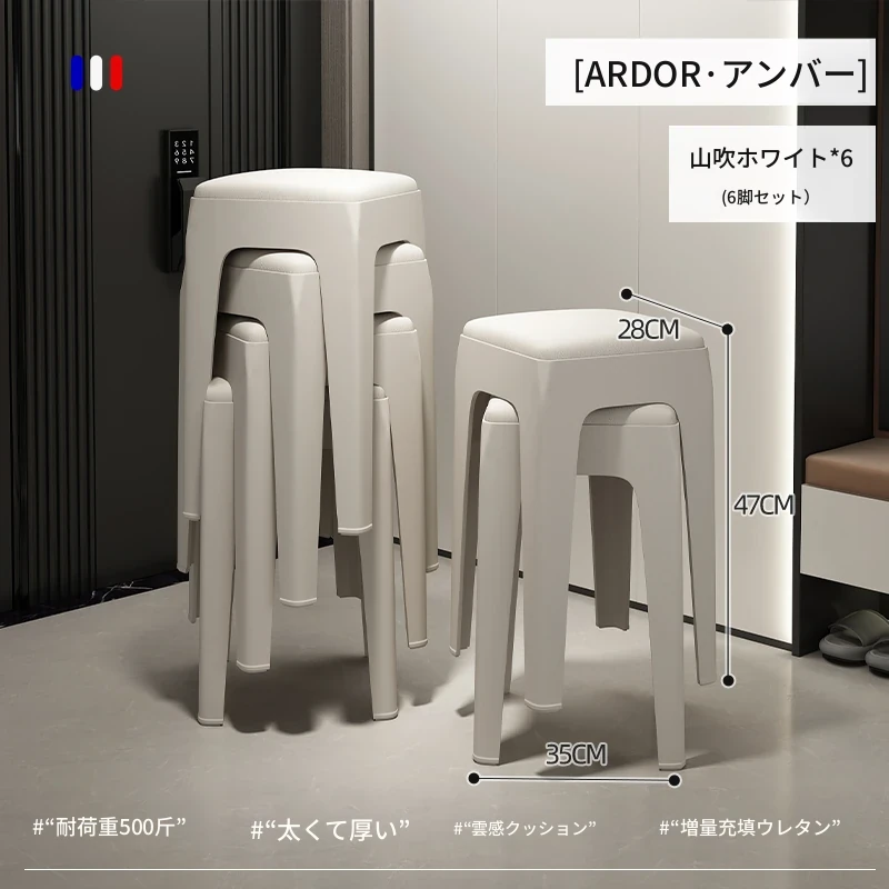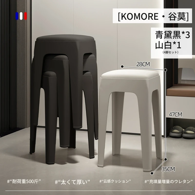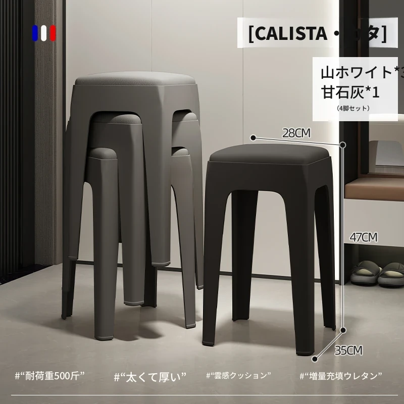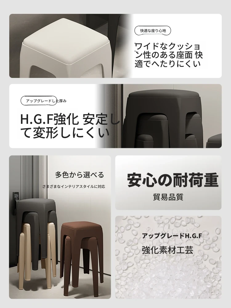 家庭用プラスチック厚手ソフトクッション四角スツール、頑丈で耐久性抜群!ゲスト用にも最適、スタッキング可能で化粧用やベンチとしても活躍。収納も簡単で、インテリアにもぴったり!