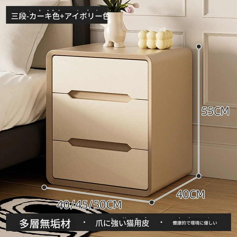 三段引き出し-カーキ色+アイボリー(厚手多層無垢材フレーム+無垢材引き出し)