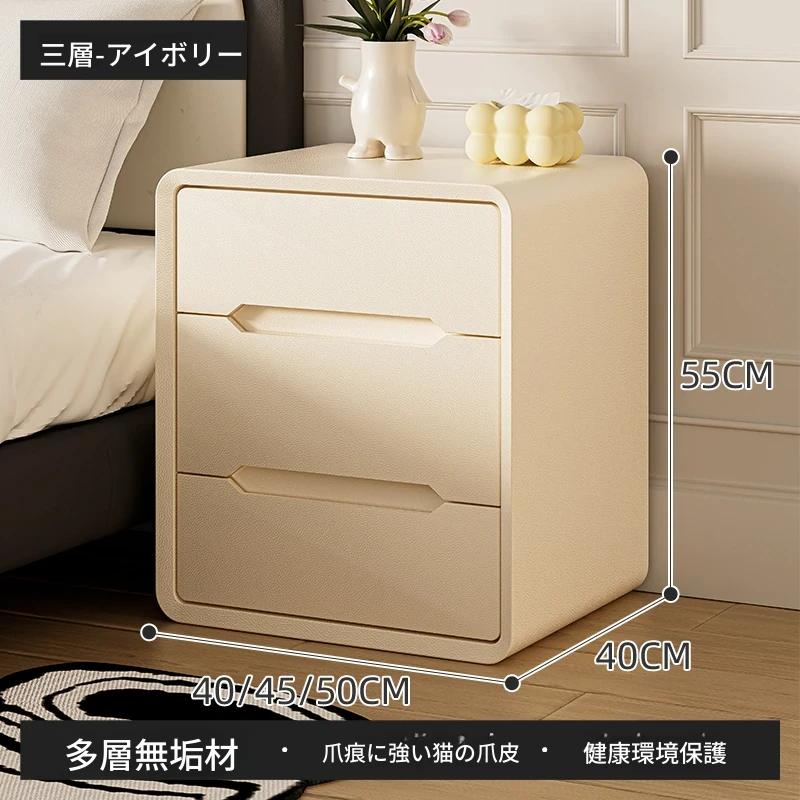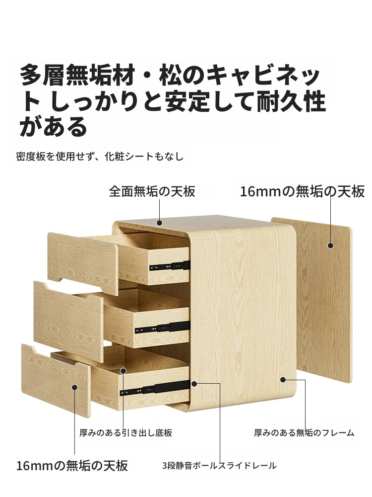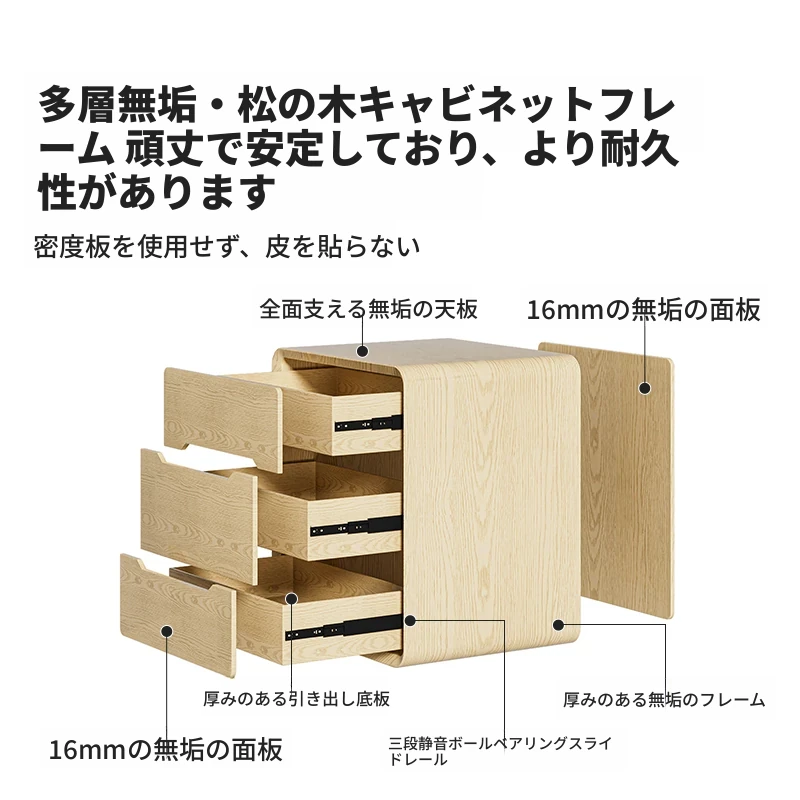 三段引き出し-アイボリー(厚手多層無垢材フレーム+無垢材引き出し)