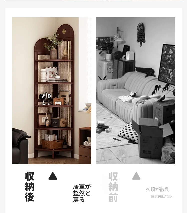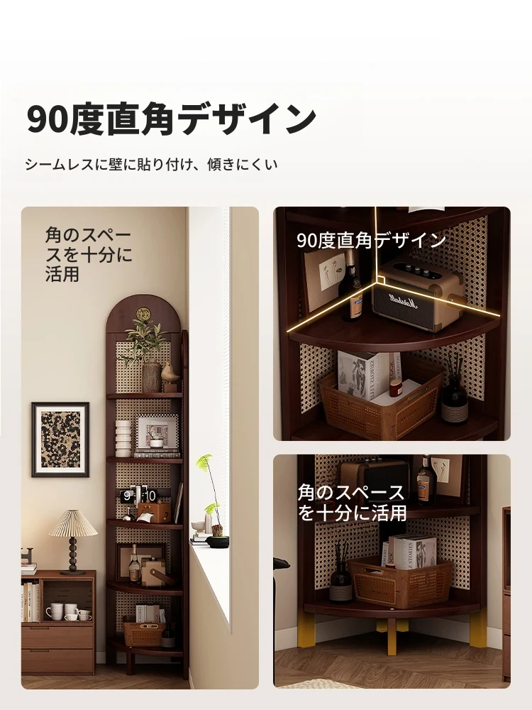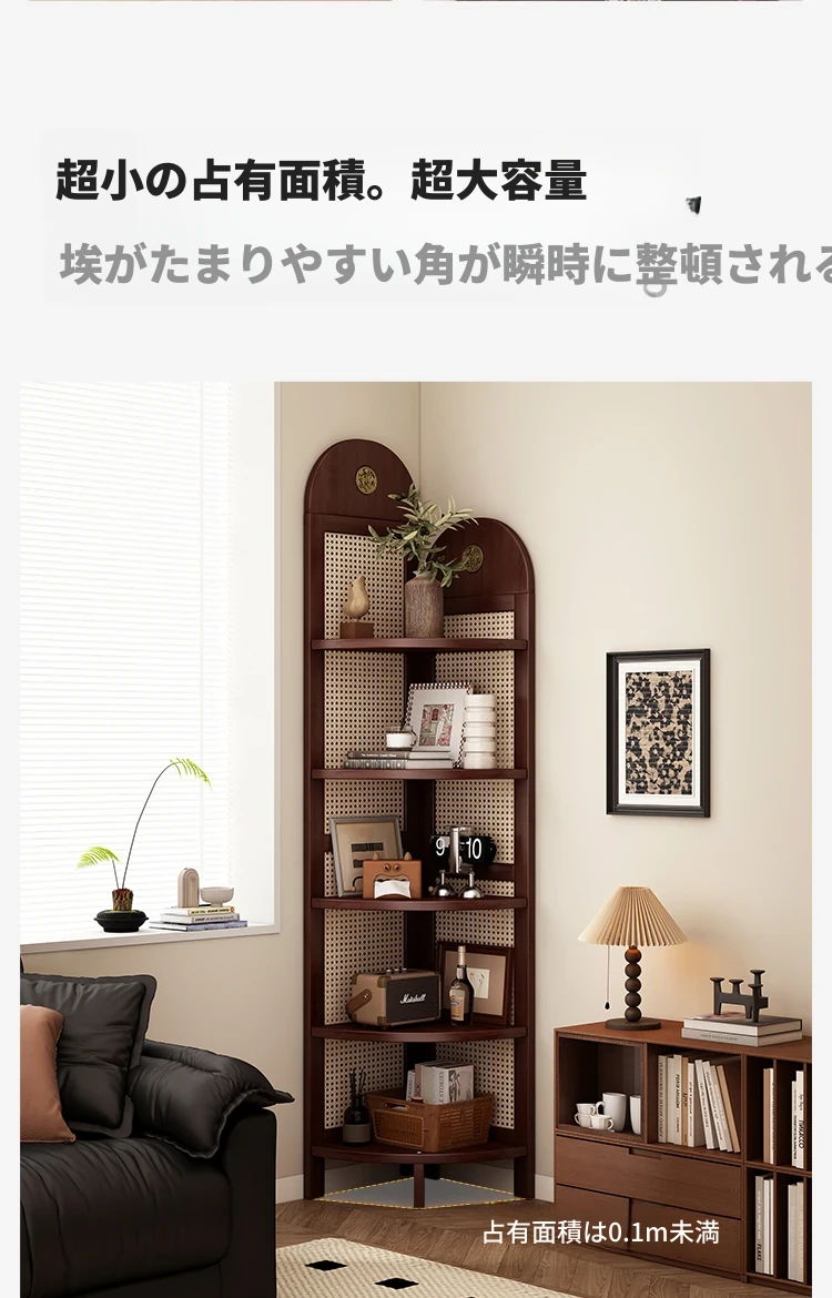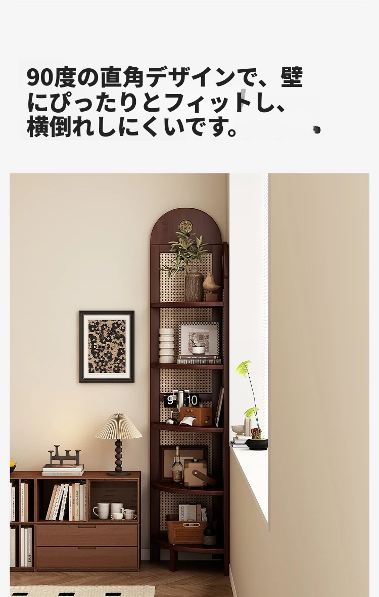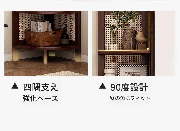 角度を活かしたスタイリッシュな収納!高級感溢れるラタン編みの角置き棚&書架、壁にぴったりフィットする90度コーナーキャビネット。お部屋をオシャレに演出し、空間を有効活用!