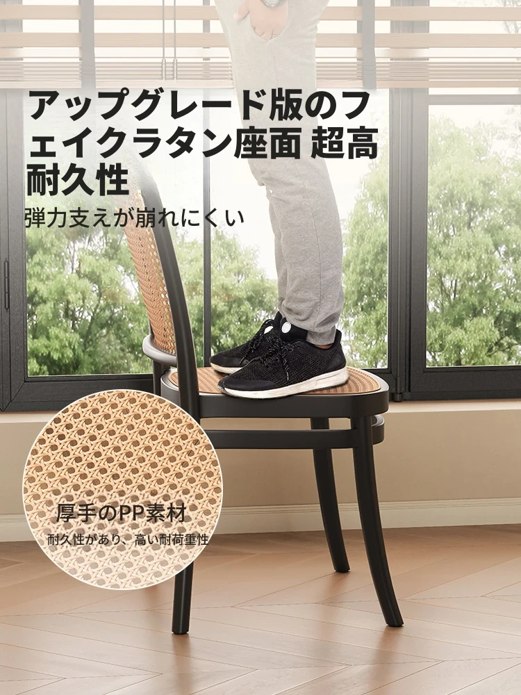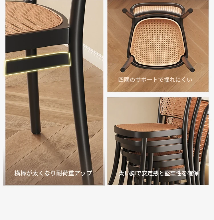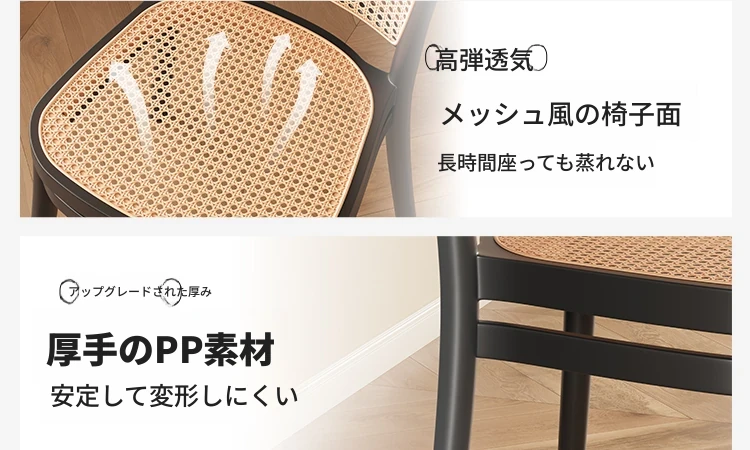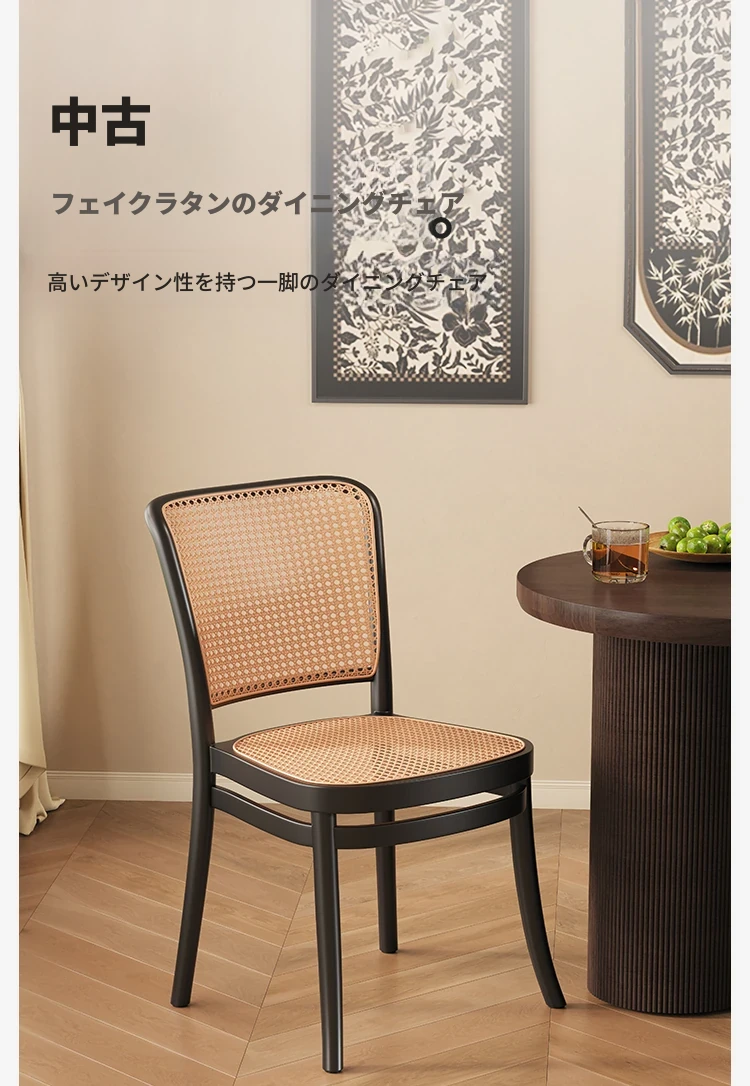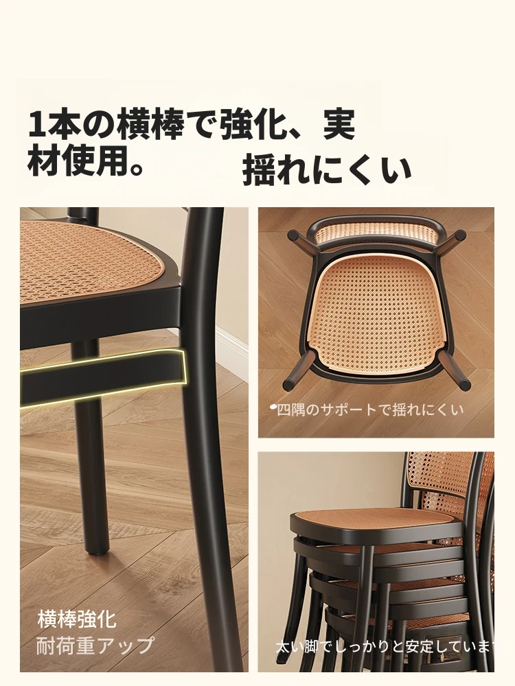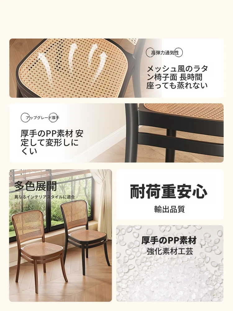 おしゃれな中古風ラタンチェア|家庭用・ダイニングに最適!スタッキング可能なプラスチック背もたれ付きで、軽やかな高級感を演出。ティーテーブルにもぴったりな一品です。