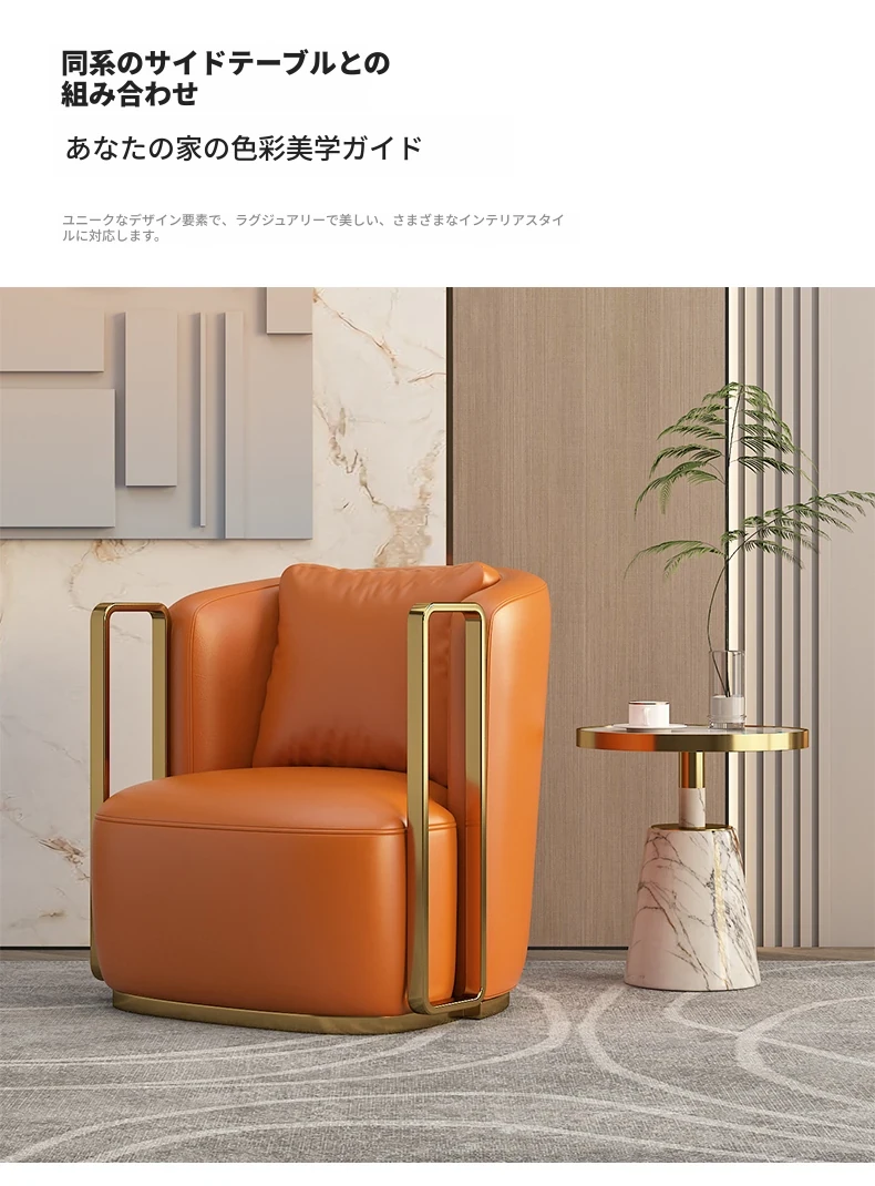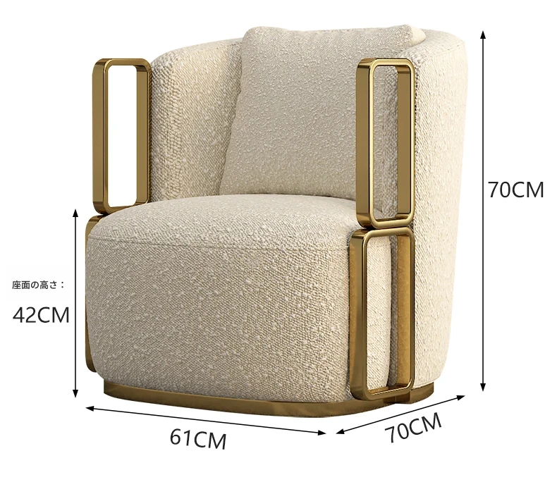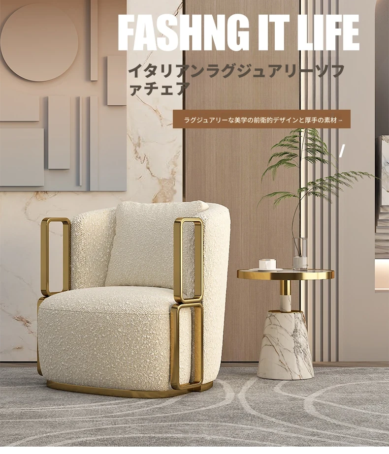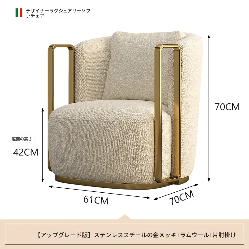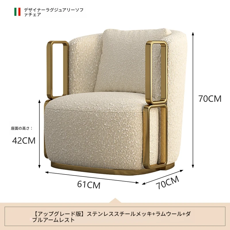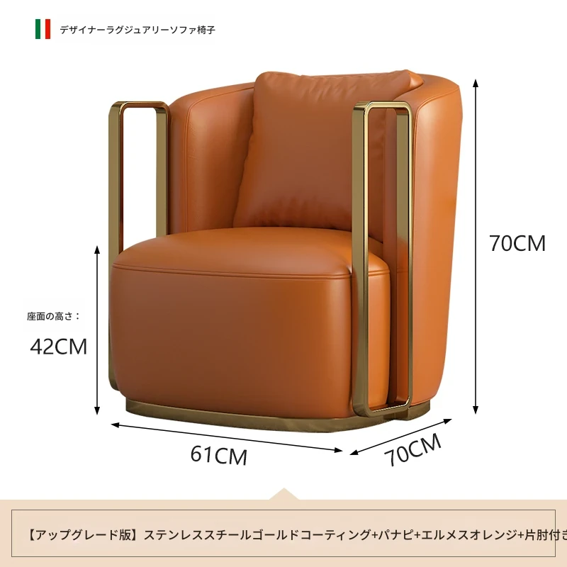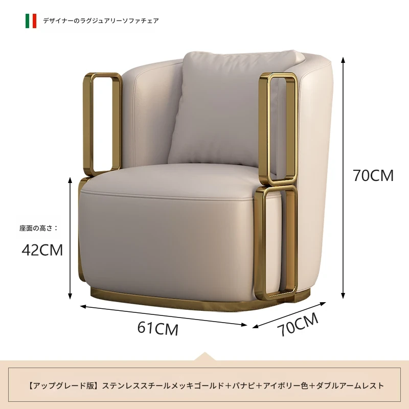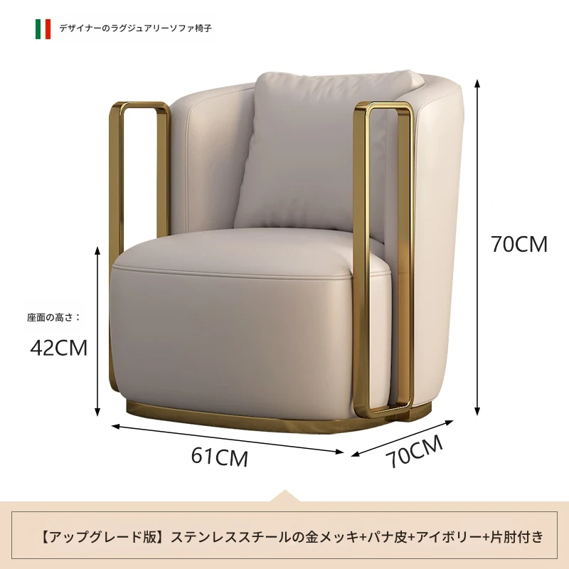 イタリアンラグジュアリー シングルソファチェア - リビングルームやバルコニーに最適なステンレス製のラウンジチェア。ホテルやクラブでの商談にもぴったりな、スタイリッシュで快適な一脚です。