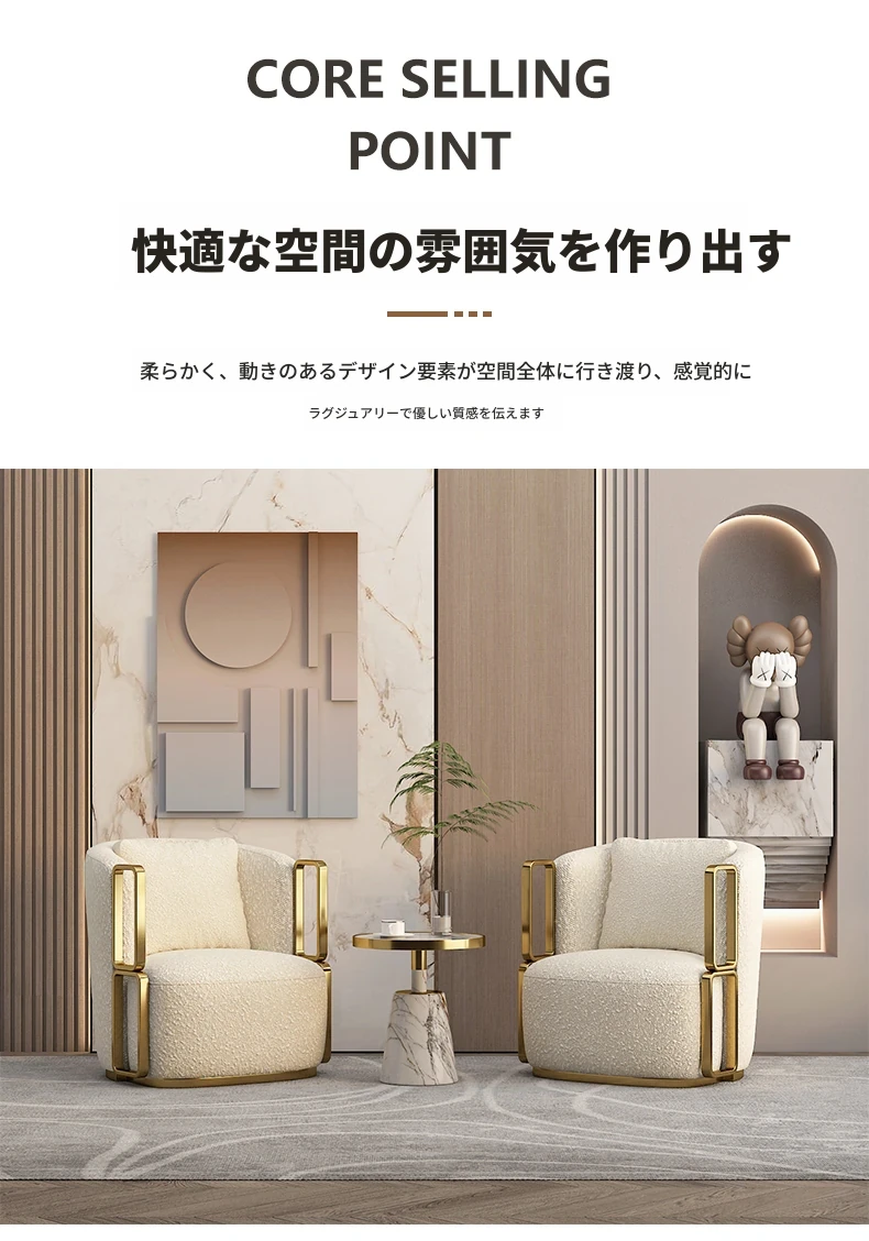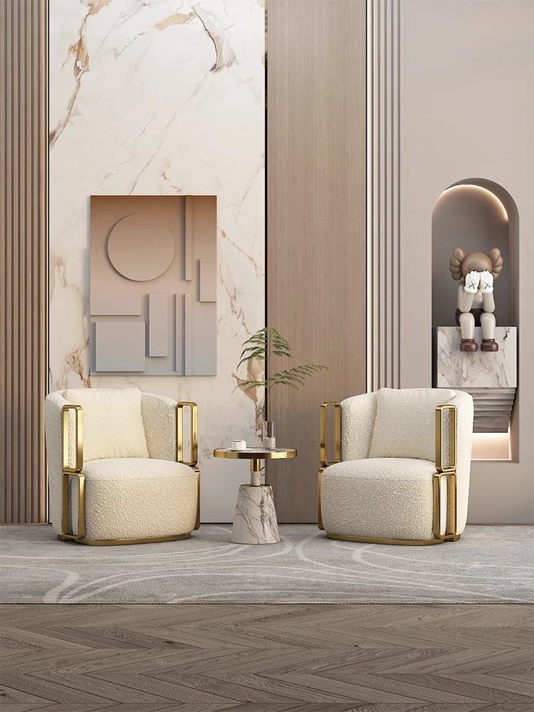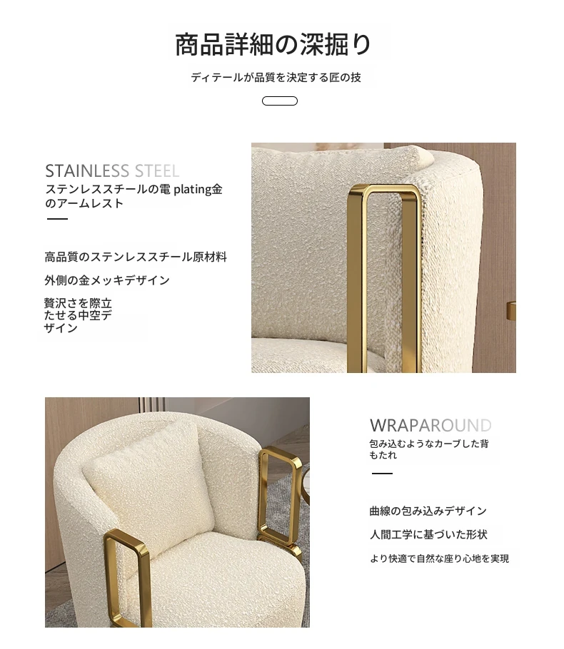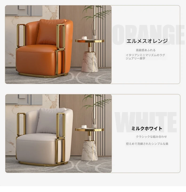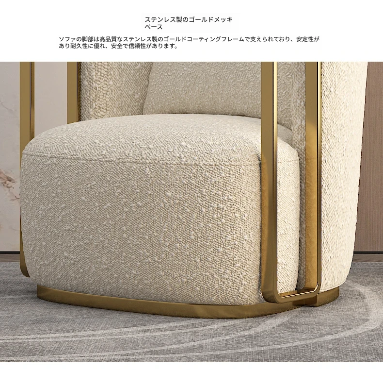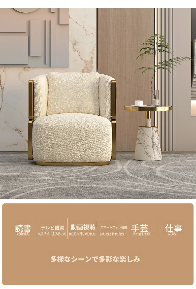 イタリアンラグジュアリー シングルソファチェア - リビングルームやバルコニーに最適なステンレス製のラウンジチェア。ホテルやクラブでの商談にもぴったりな、スタイリッシュで快適な一脚です。