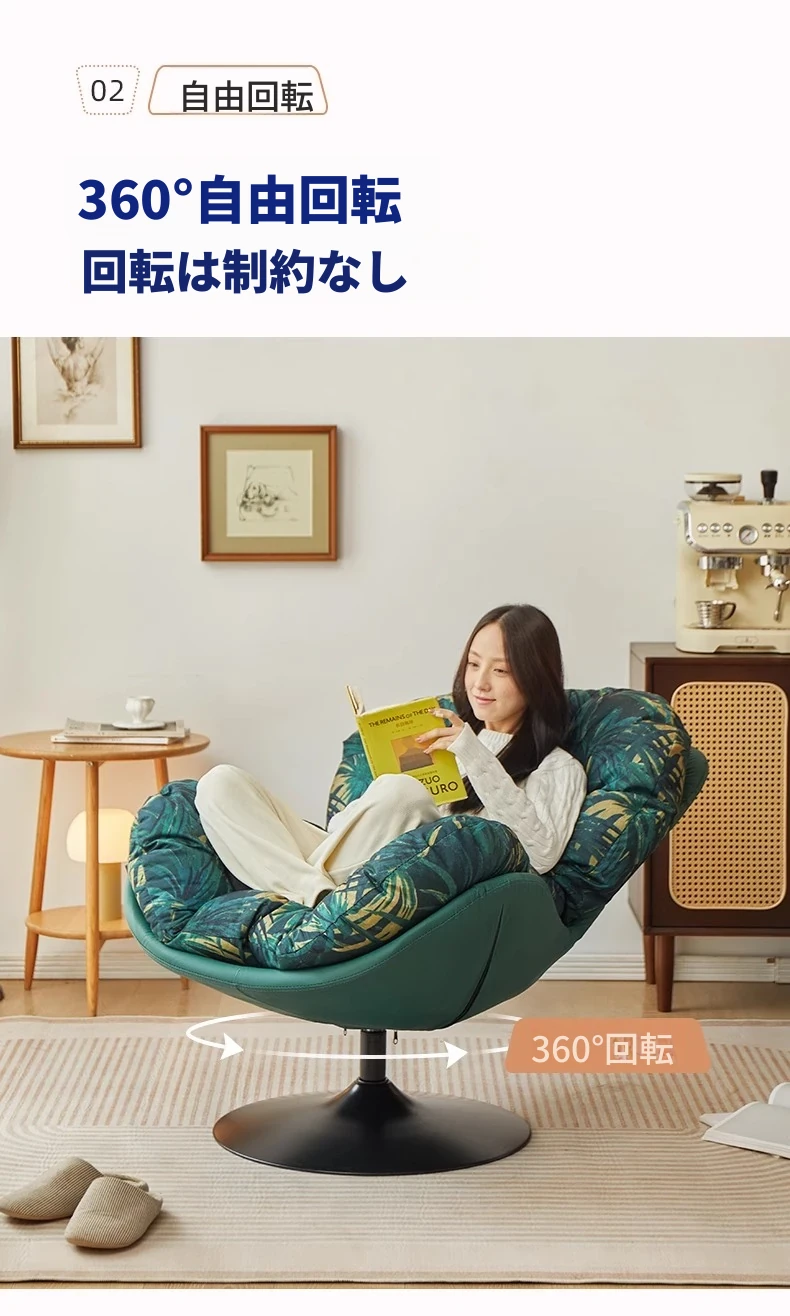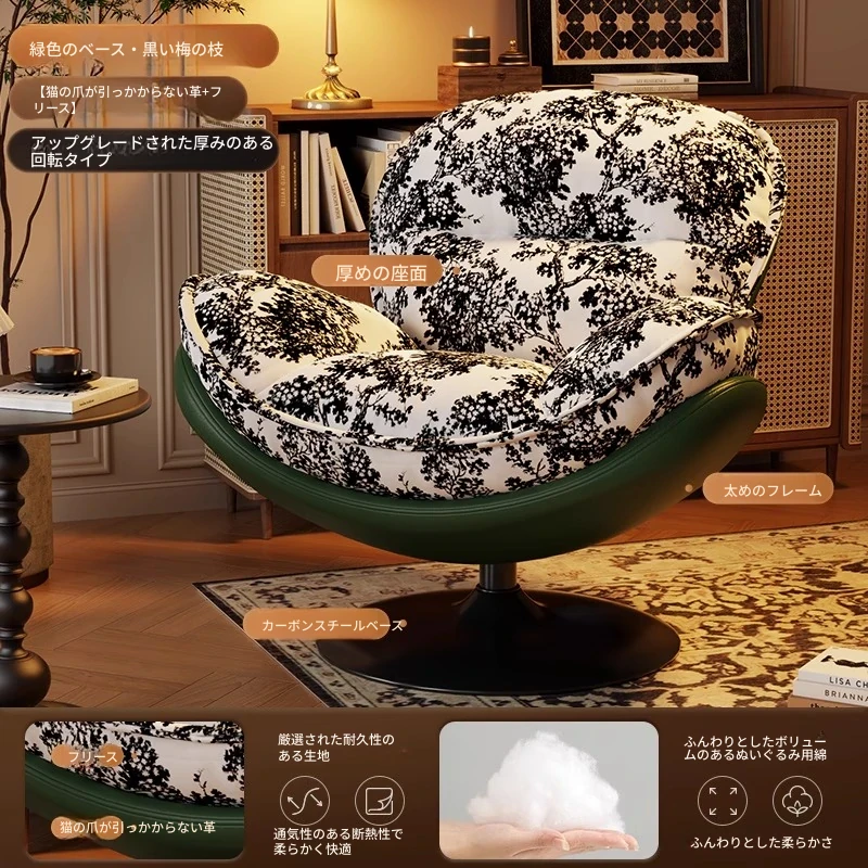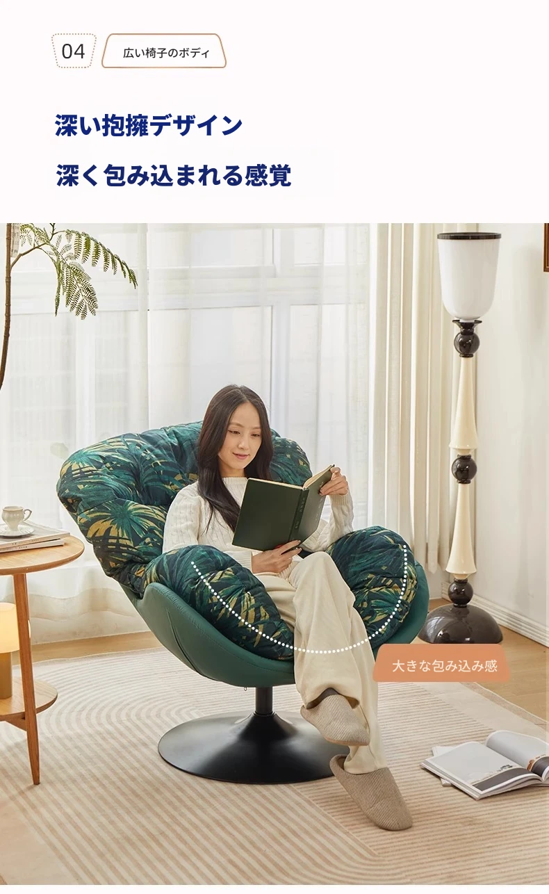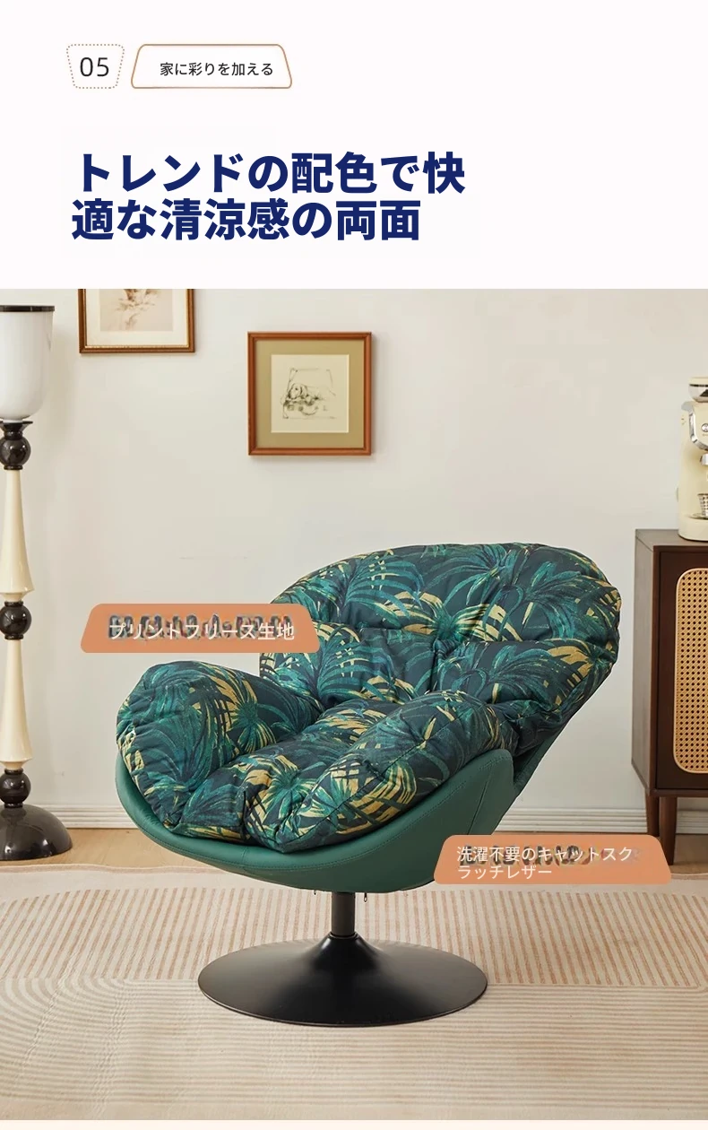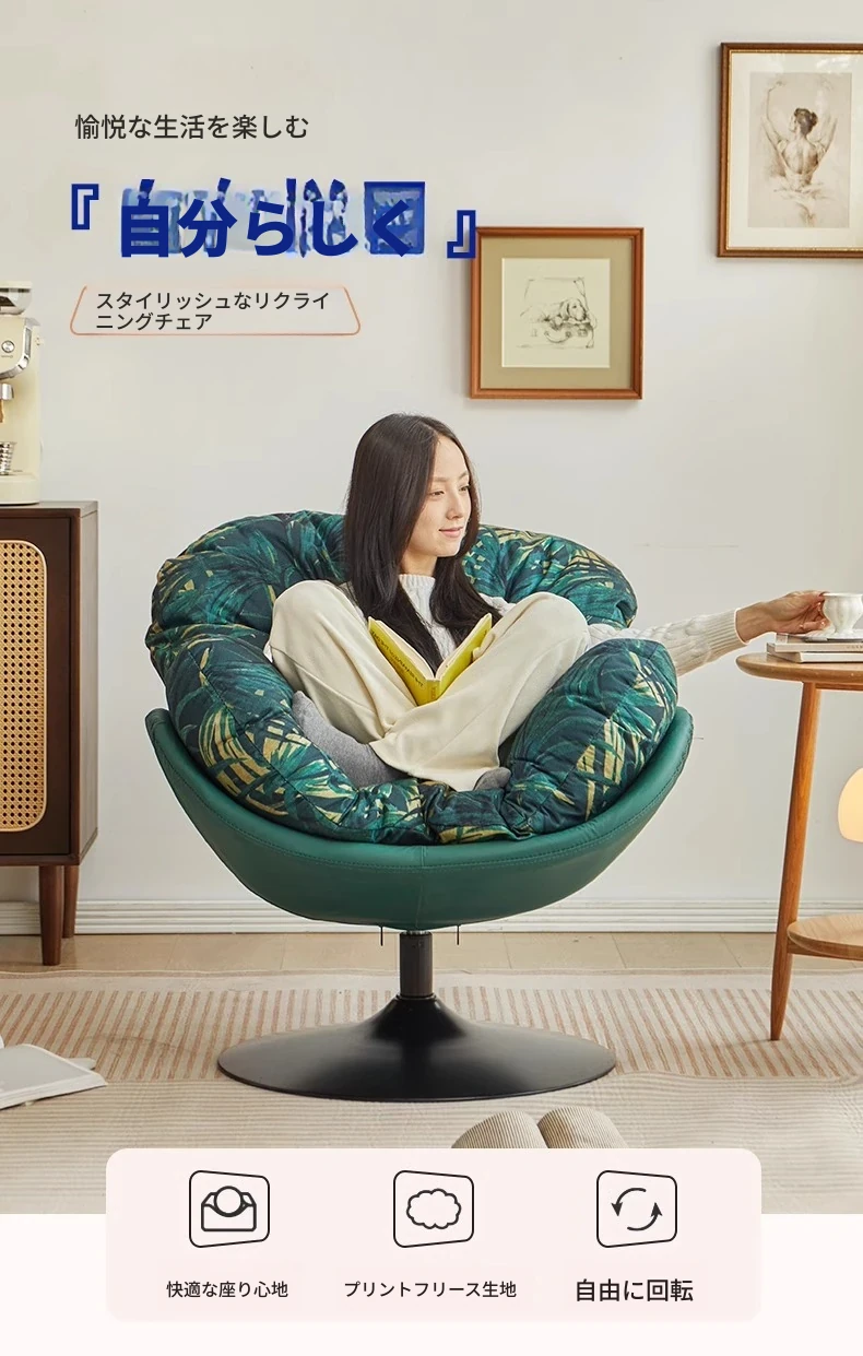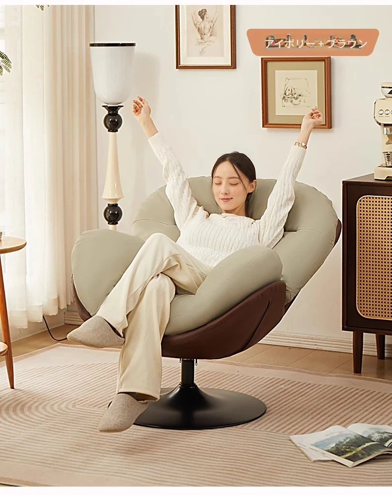 リラックスできるラウンジソファ!寝転びながらくつろげる一人用の回転リクライニングチェア。軽やかな高級感あふれるエッグシェイプデザインで、寝室にもぴったりのソファチェアです。