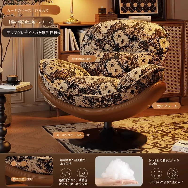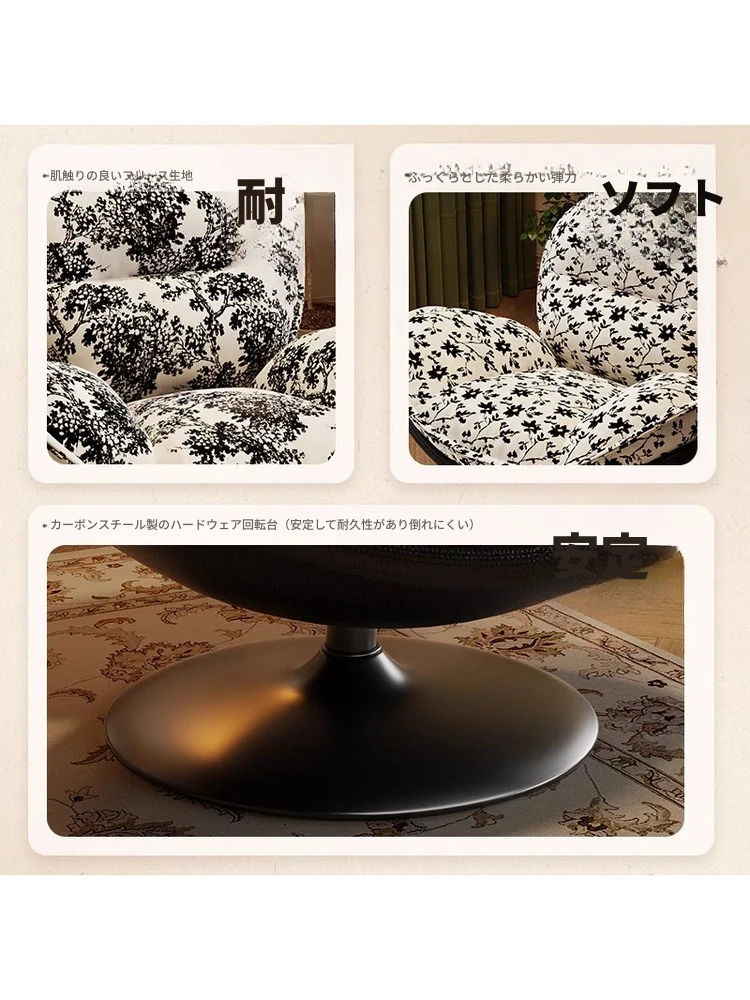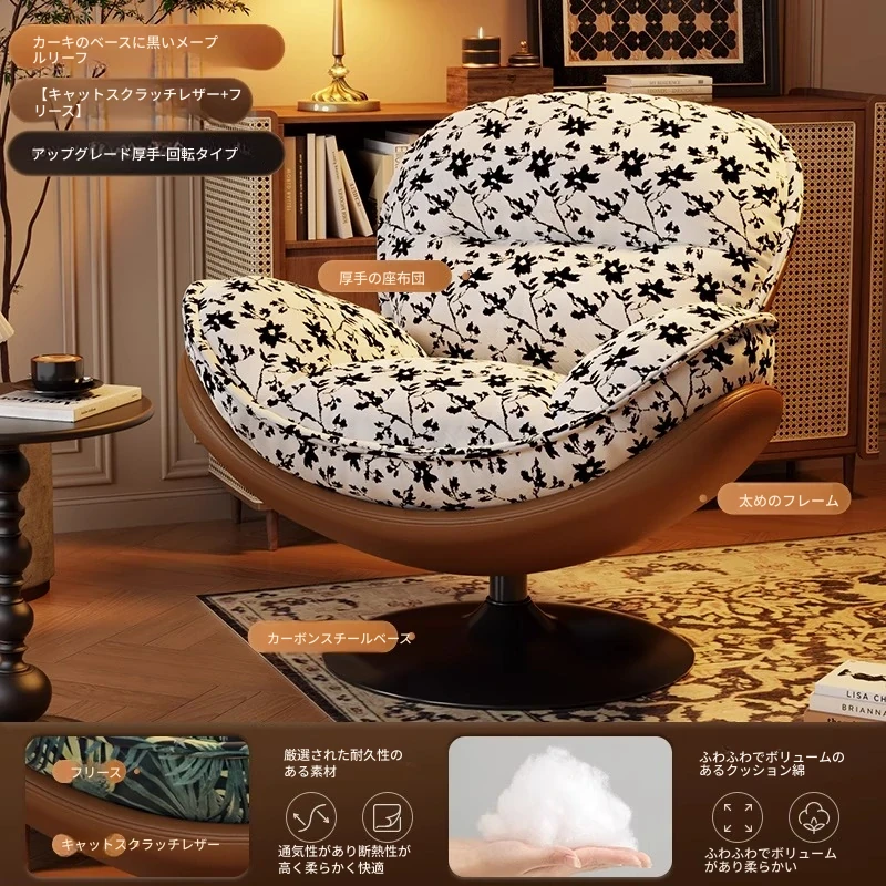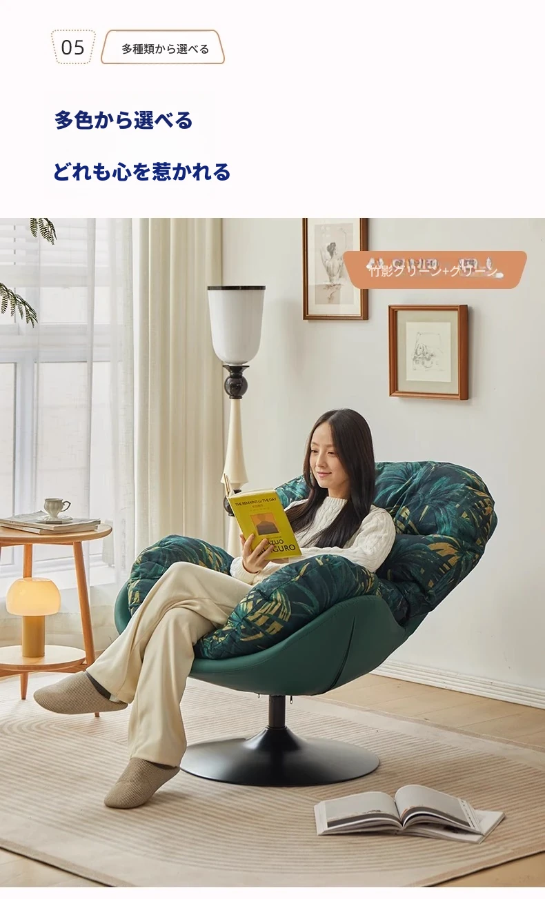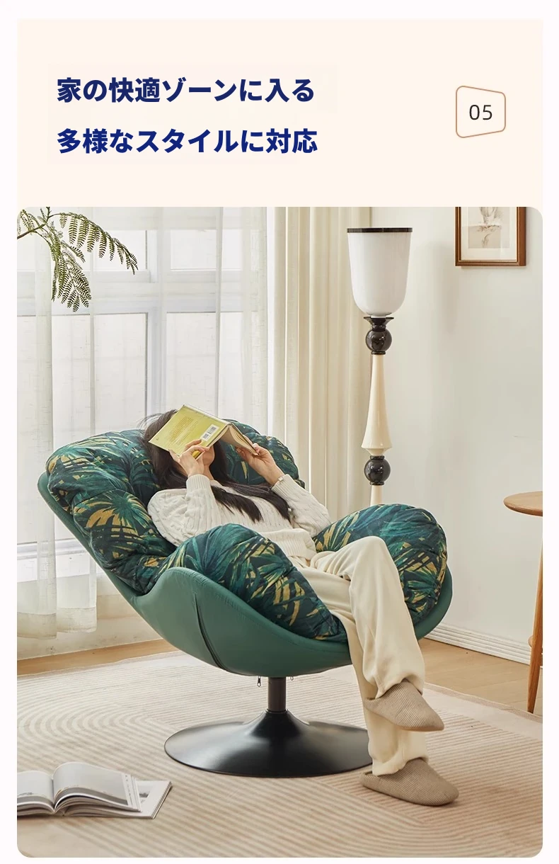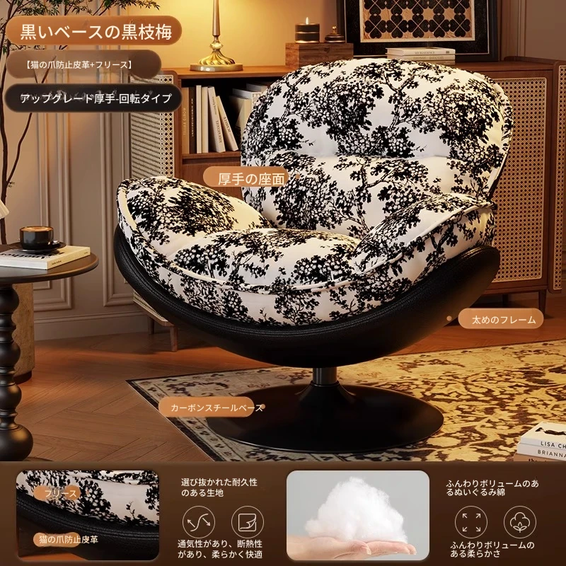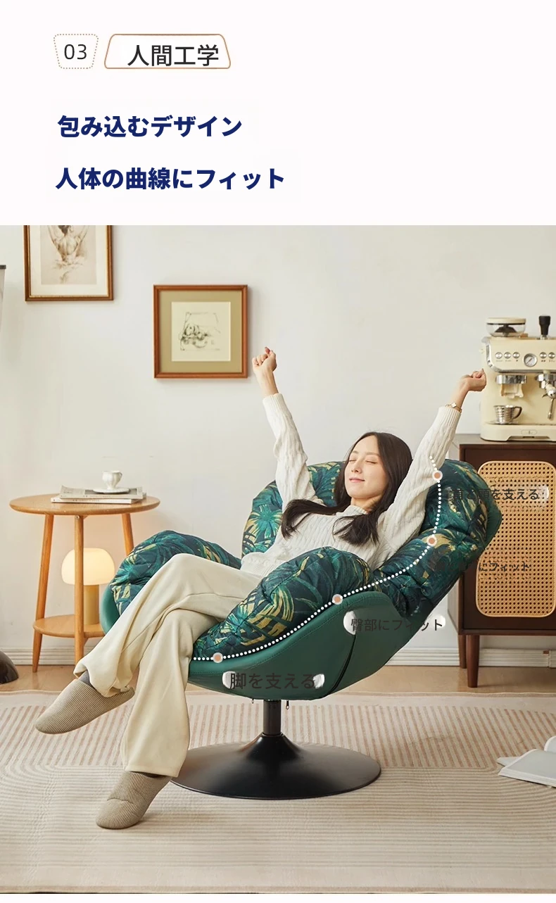 リラックスできるラウンジソファ!寝転びながらくつろげる一人用の回転リクライニングチェア。軽やかな高級感あふれるエッグシェイプデザインで、寝室にもぴったりのソファチェアです。