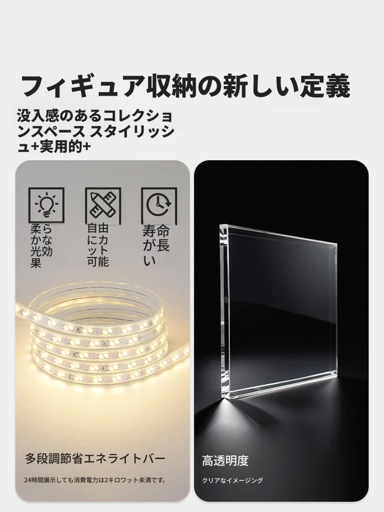 LEDライト付き!透明ガラスとアクリルのフィギュア展示キャビネット - おしゃれな陳列棚であなたのコレクションを美しく飾ろう!収納力抜群のスタンド式ディスプレイラック。