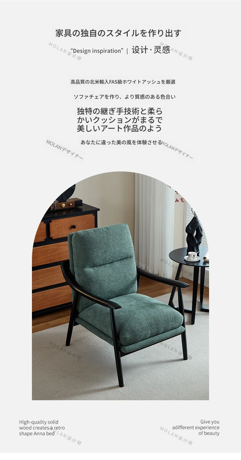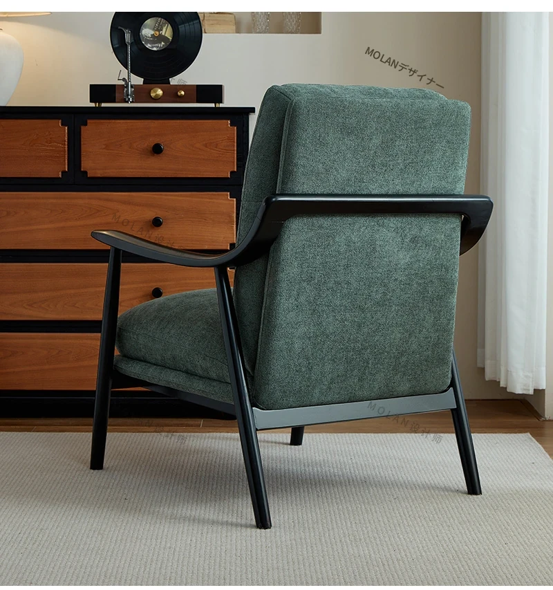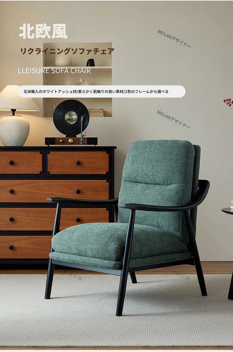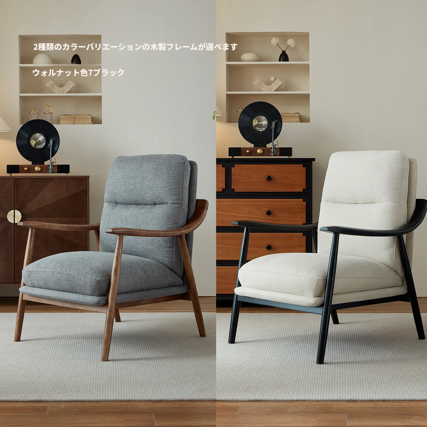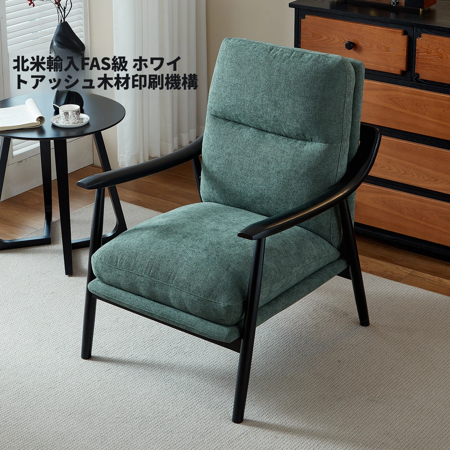北欧スタイルの無垢材とファブリックを使用したモダンなリビング・バルコニー用のシンプルな一人掛けソファチェア。頭を支えるデザインで、快適なリラックスタイムを提供する黒色の椅子。
