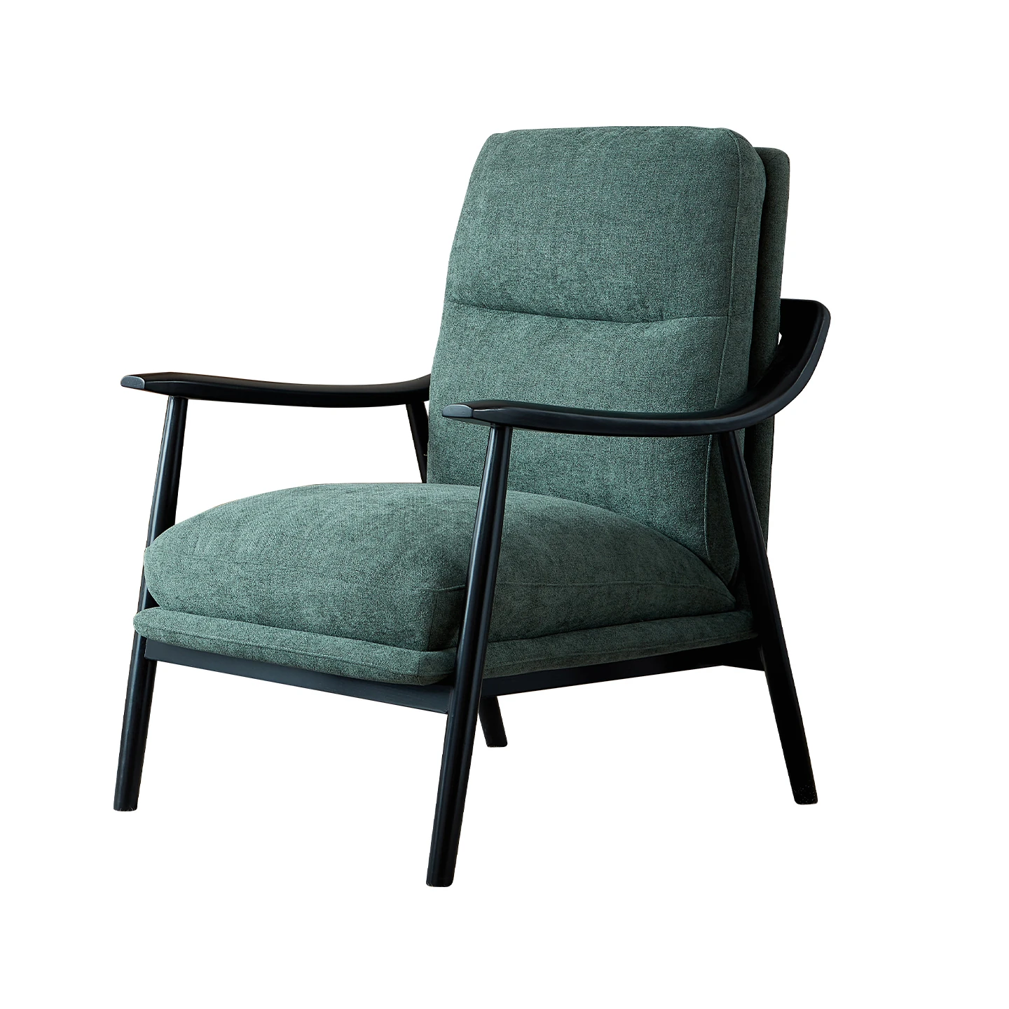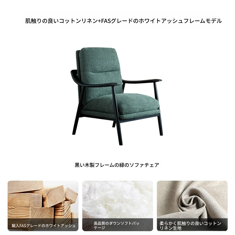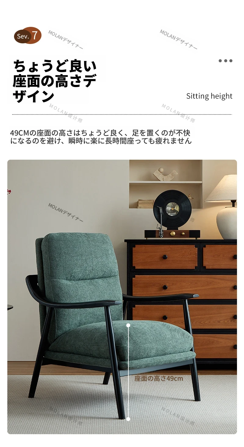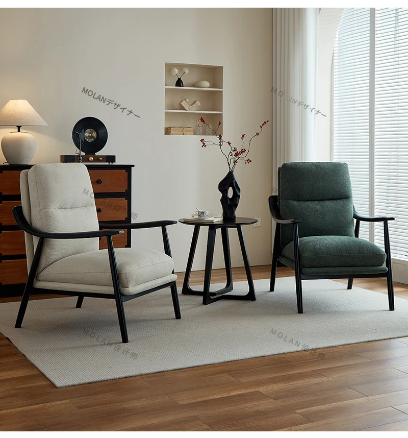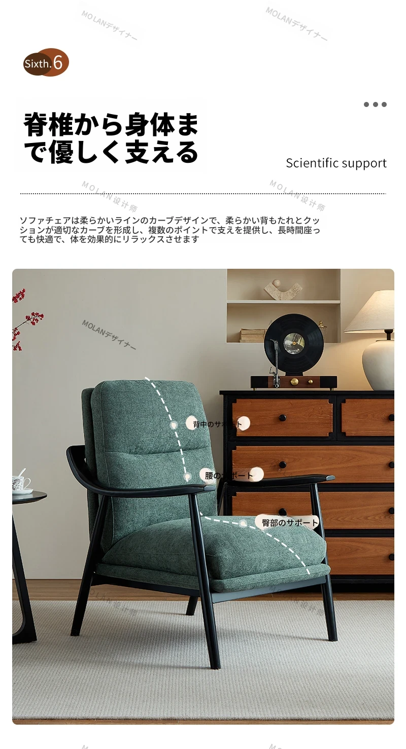 北欧スタイルの無垢材とファブリックを使用したモダンなリビング・バルコニー用のシンプルな一人掛けソファチェア。頭を支えるデザインで、快適なリラックスタイムを提供する黒色の椅子。