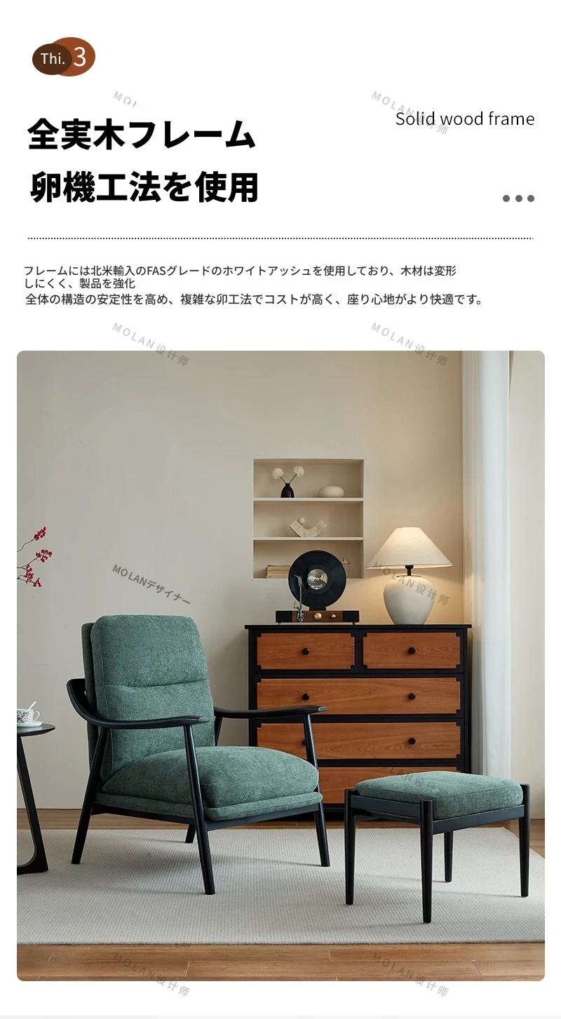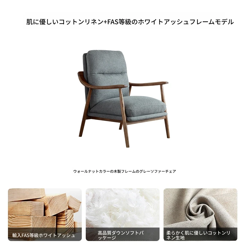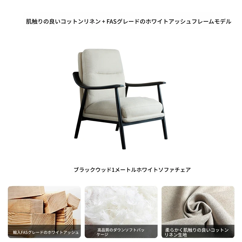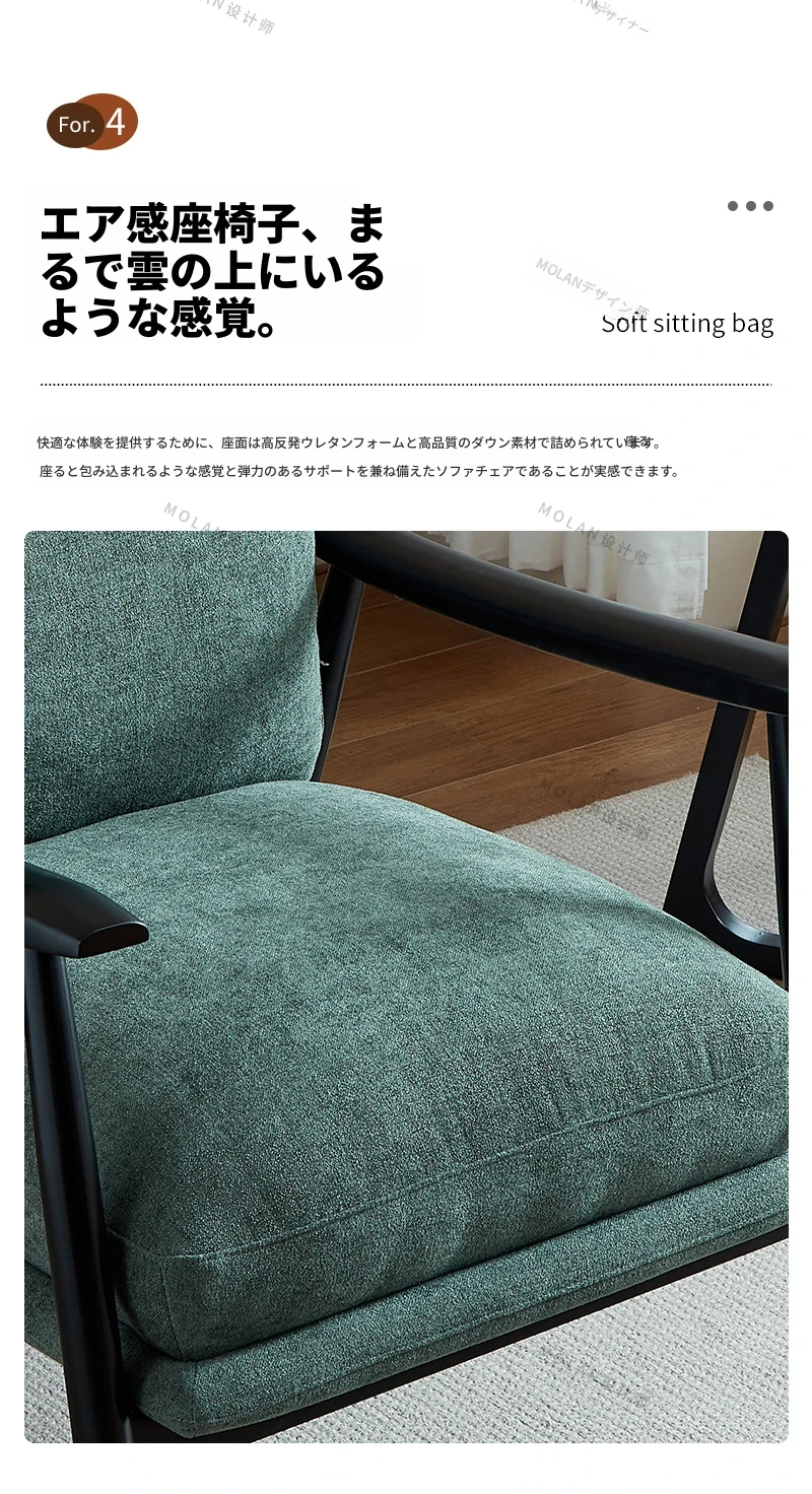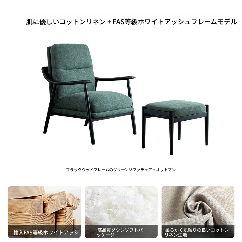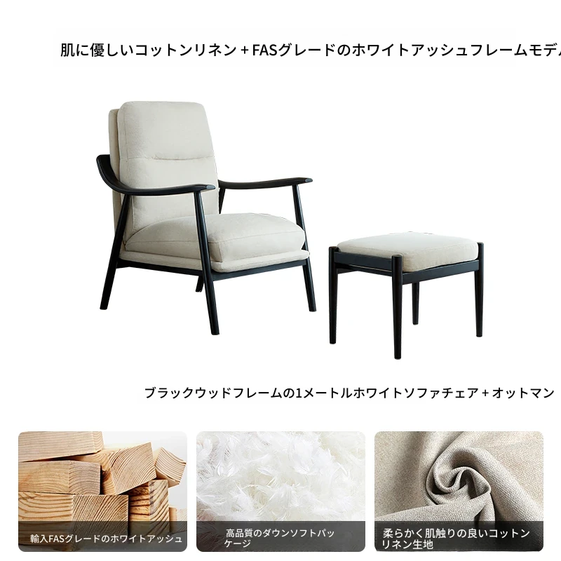 北欧スタイルの無垢材とファブリックを使用したモダンなリビング・バルコニー用のシンプルな一人掛けソファチェア。頭を支えるデザインで、快適なリラックスタイムを提供する黒色の椅子。