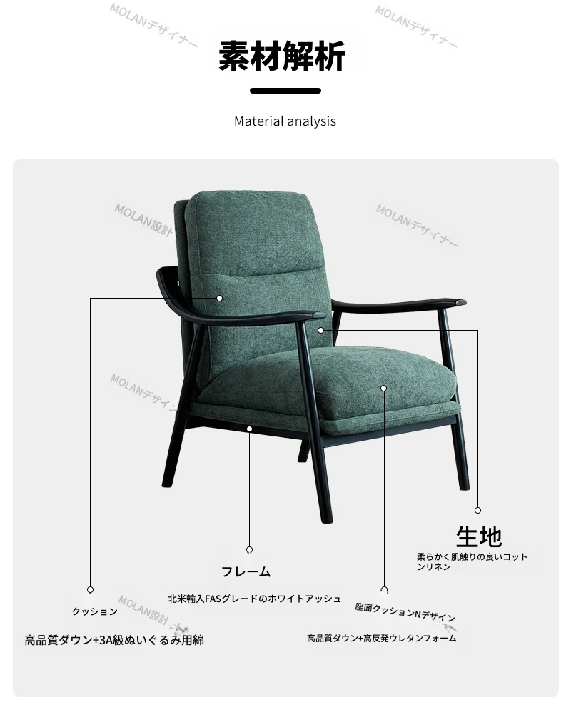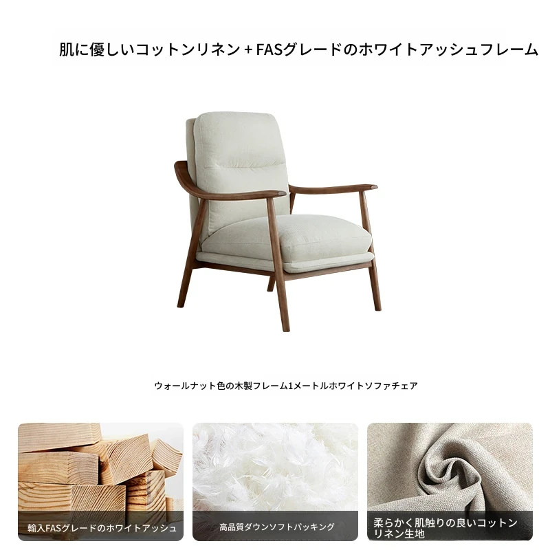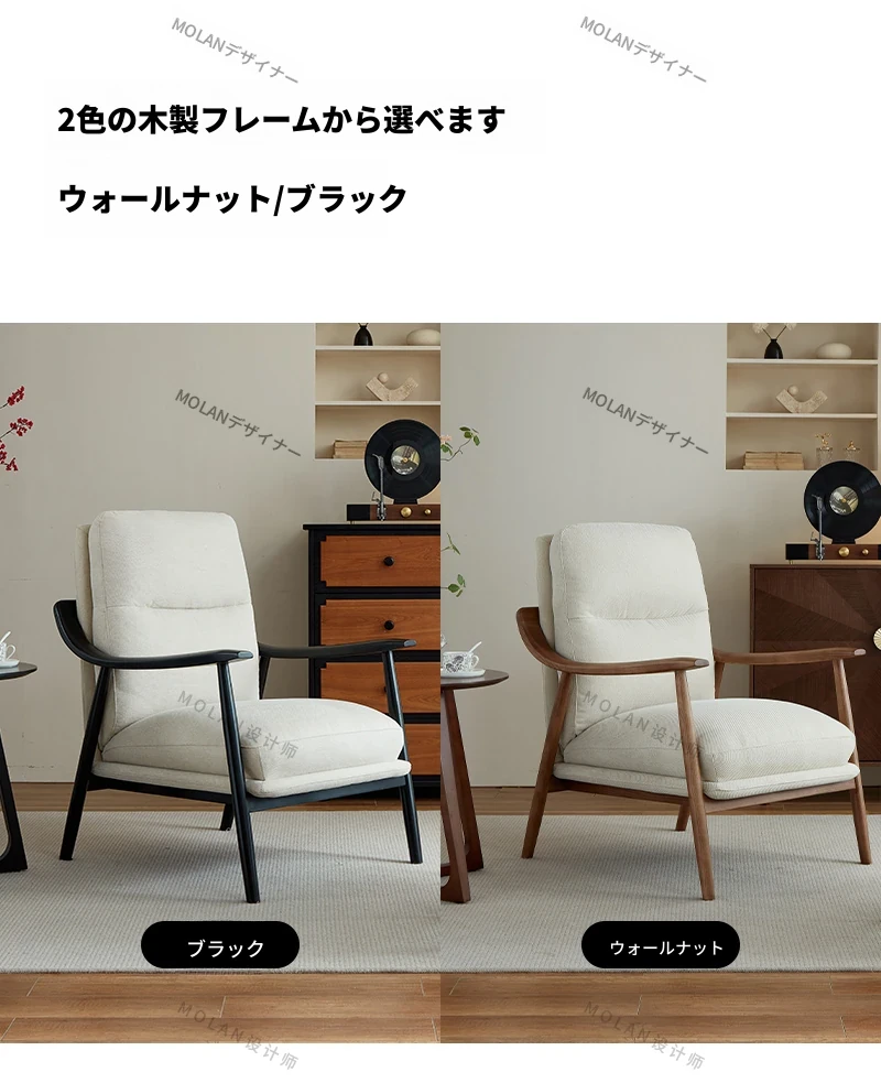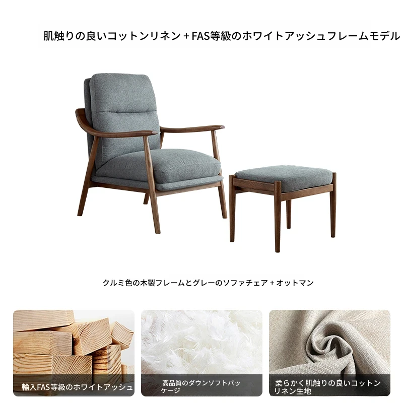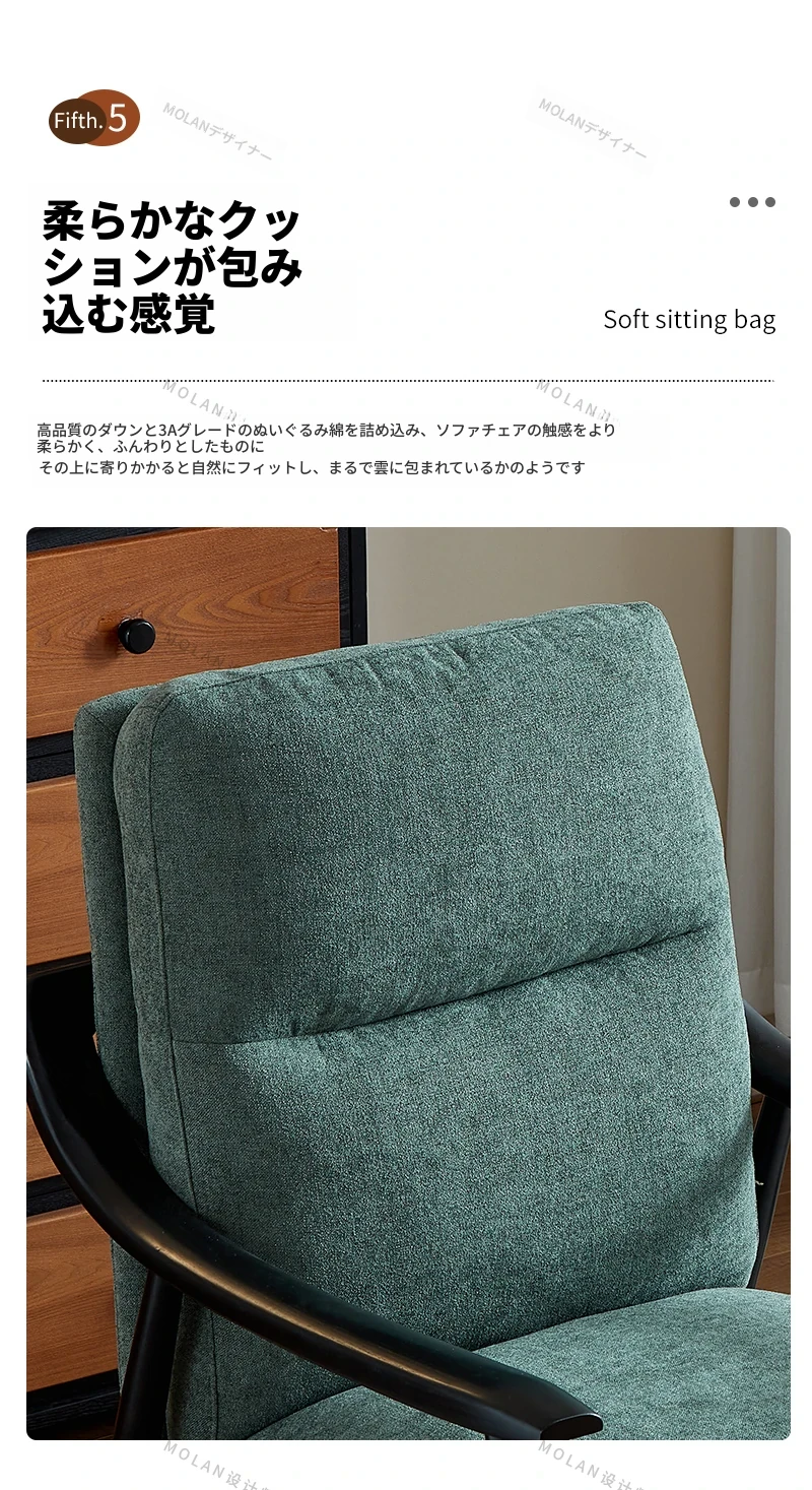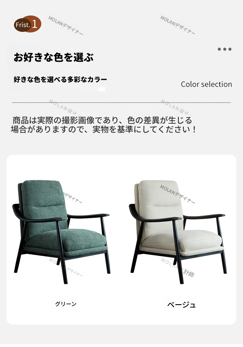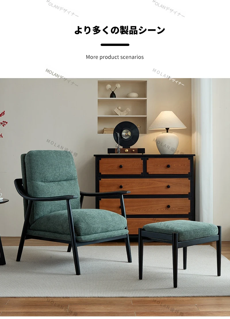 北欧スタイルの無垢材とファブリックを使用したモダンなリビング・バルコニー用のシンプルな一人掛けソファチェア。頭を支えるデザインで、快適なリラックスタイムを提供する黒色の椅子。