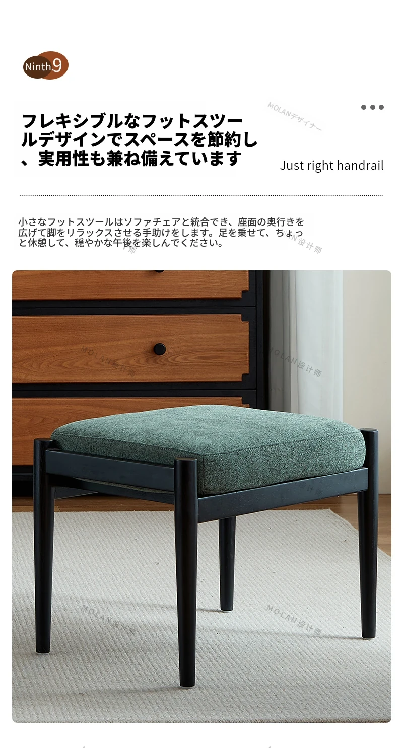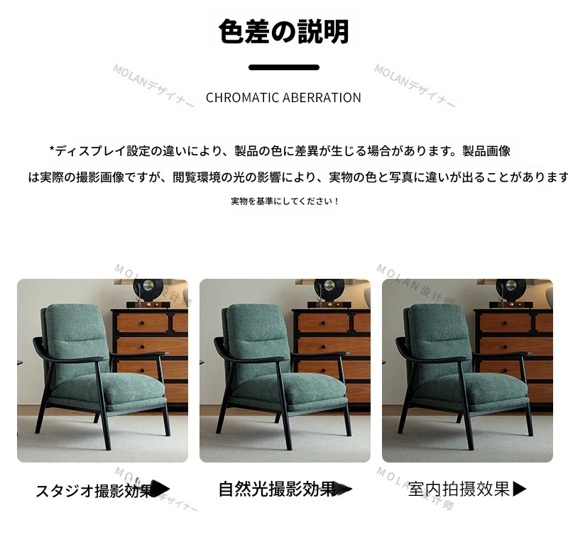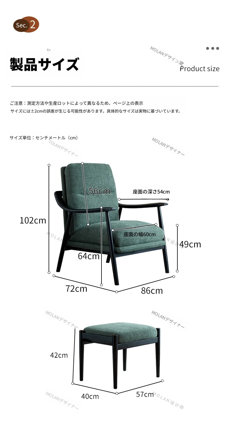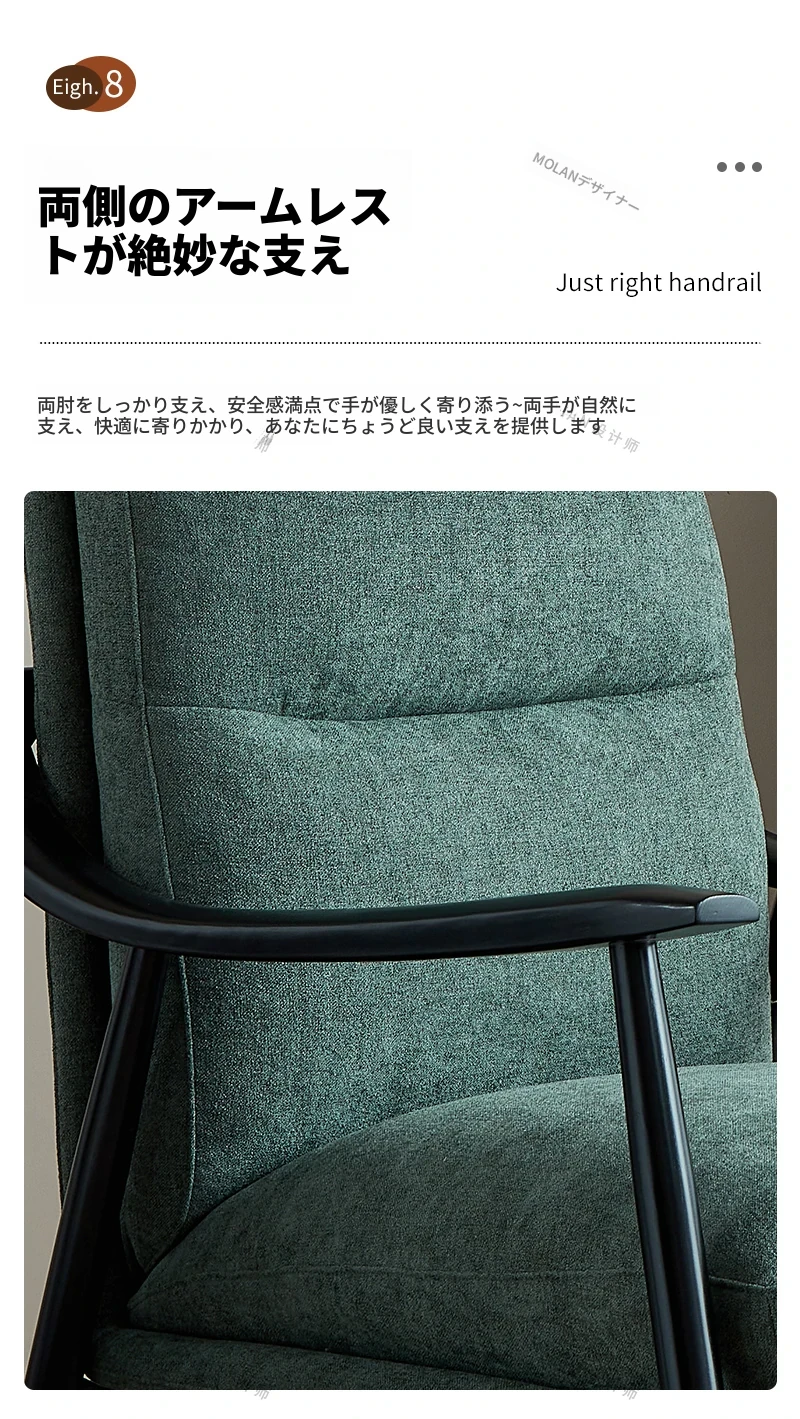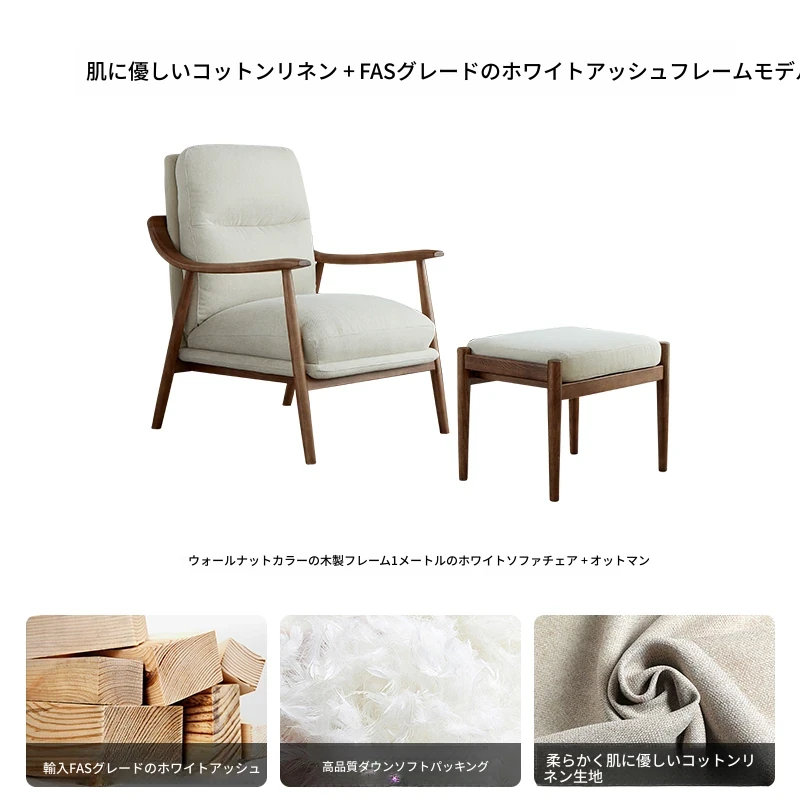 北欧スタイルの無垢材とファブリックを使用したモダンなリビング・バルコニー用のシンプルな一人掛けソファチェア。頭を支えるデザインで、快適なリラックスタイムを提供する黒色の椅子。