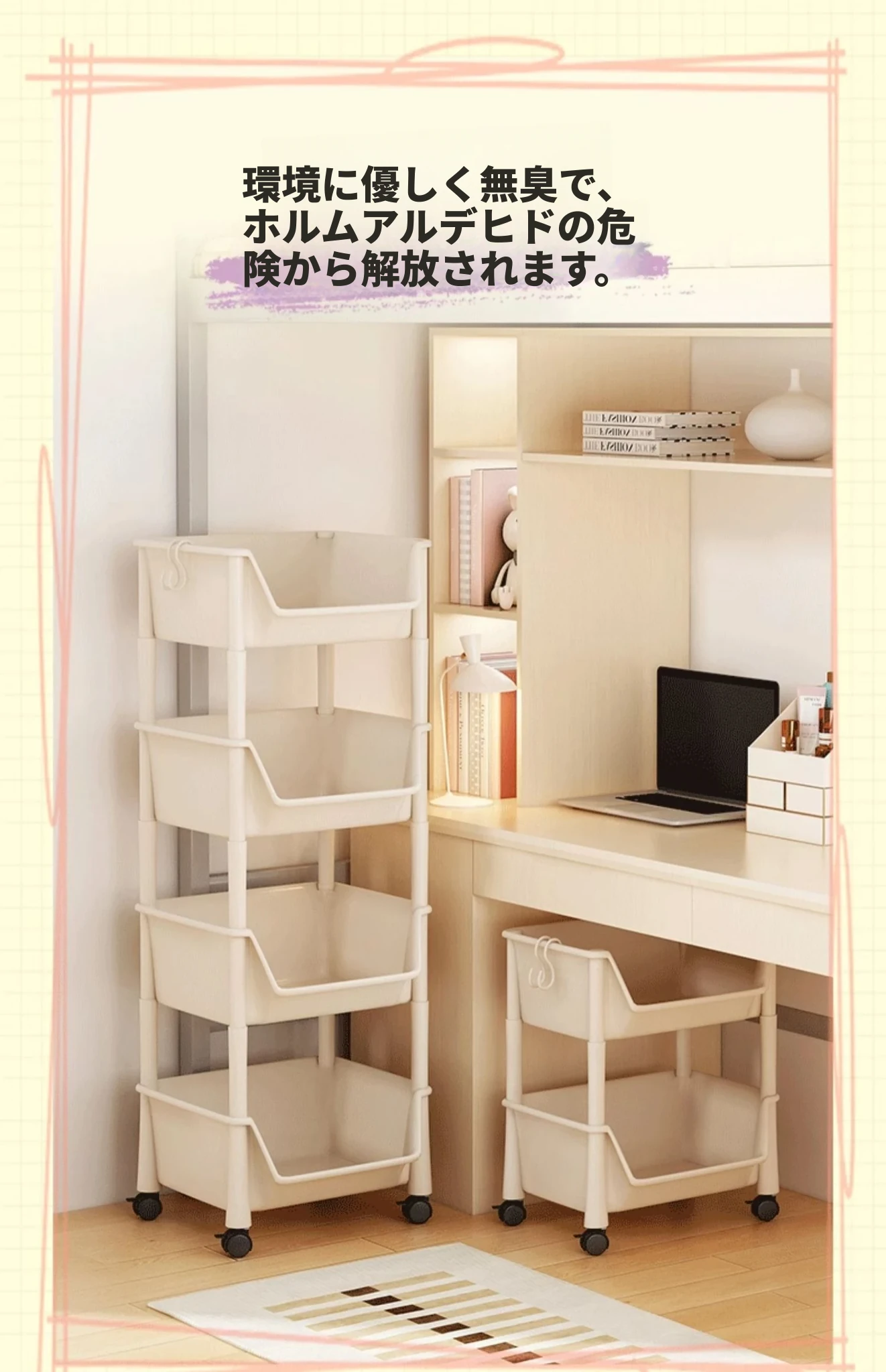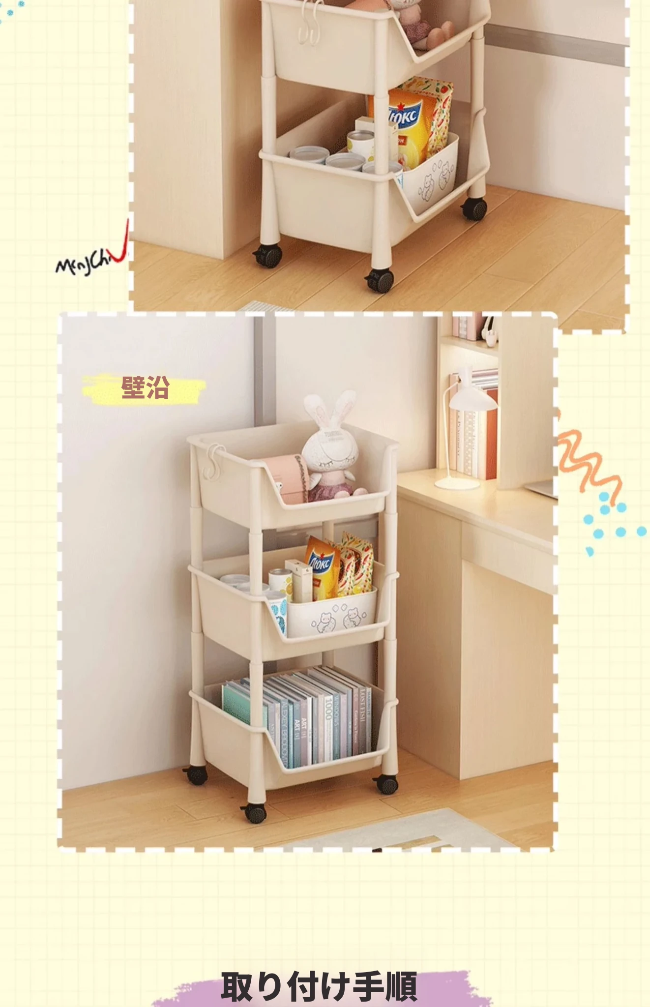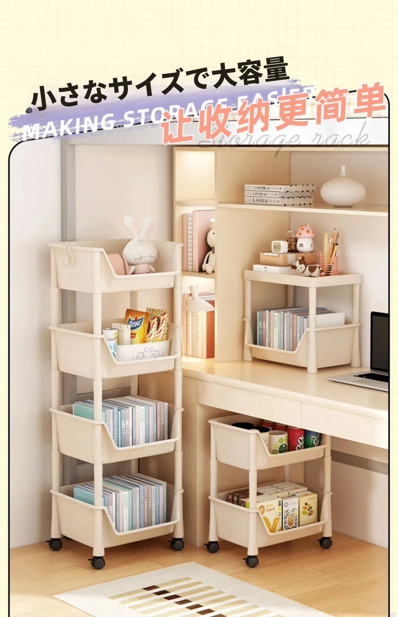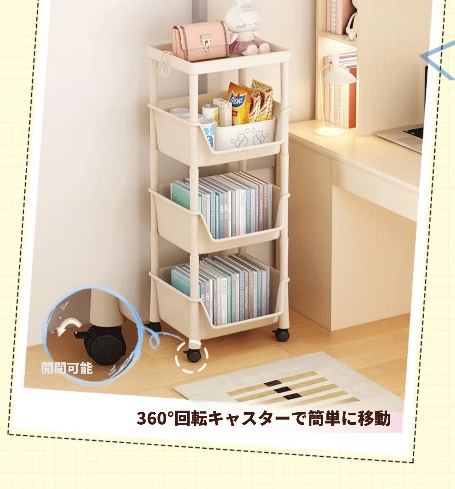移動式ブックシェルフ・マルチレイヤー収納ラック!おもちゃやスナックもスッキリ整理できる、家や寮にぴったりの小型キャスター付きストレージラック!おしゃれで実用的な収納ソリューションを手に入れよう!