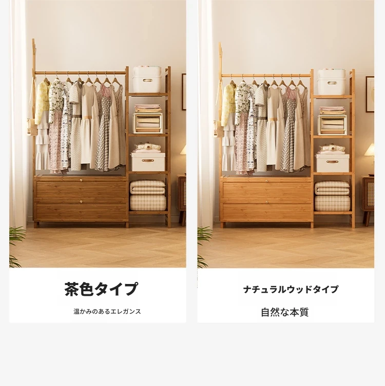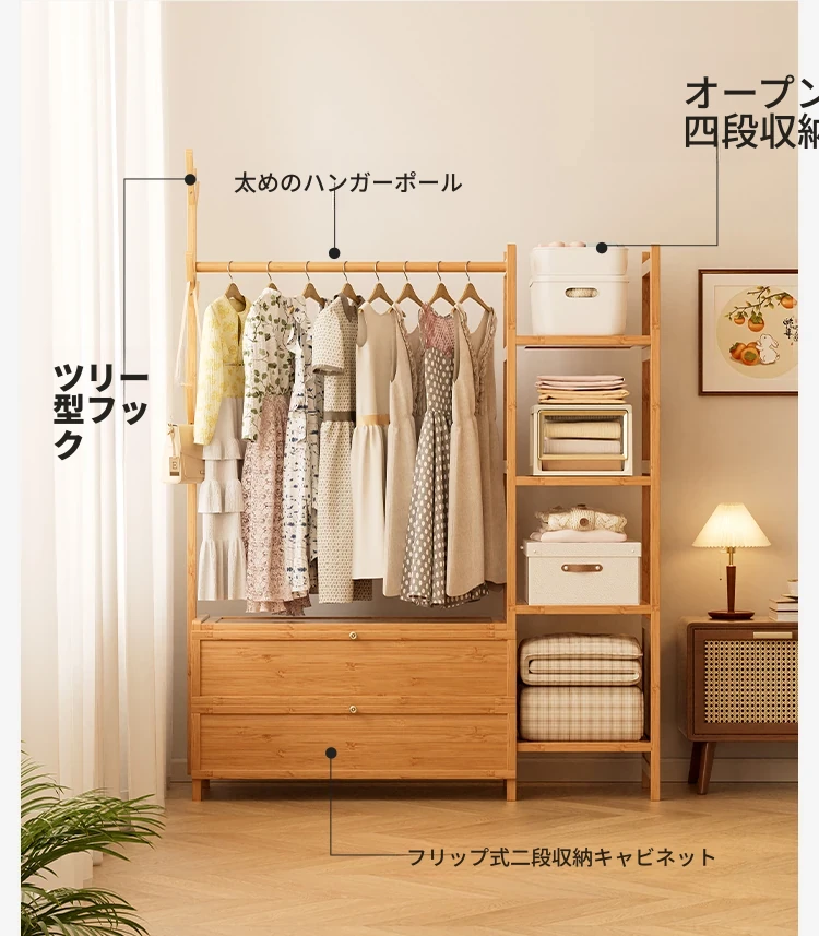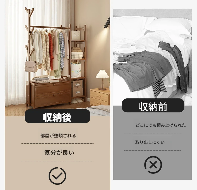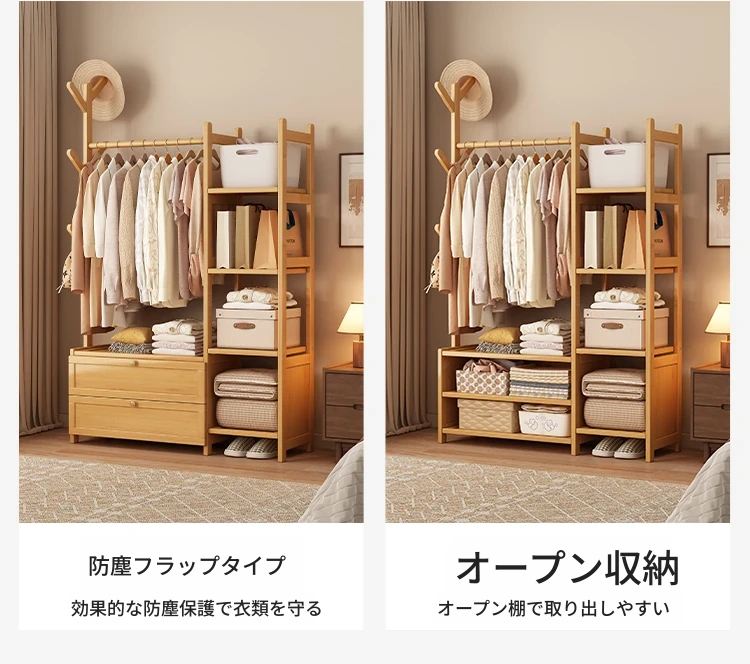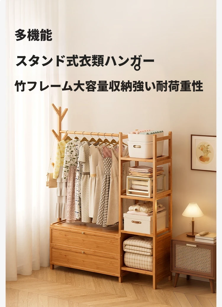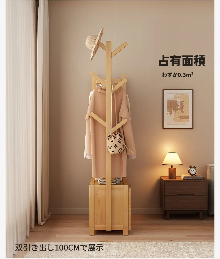 収納力抜群!寝室用フロアハンガー - 収納キャビネット付き、ベッドサイドでの衣類収納に最適!高品質な無垢材使用の多機能コートラックで、夜のお洋服もスッキリ整理!
